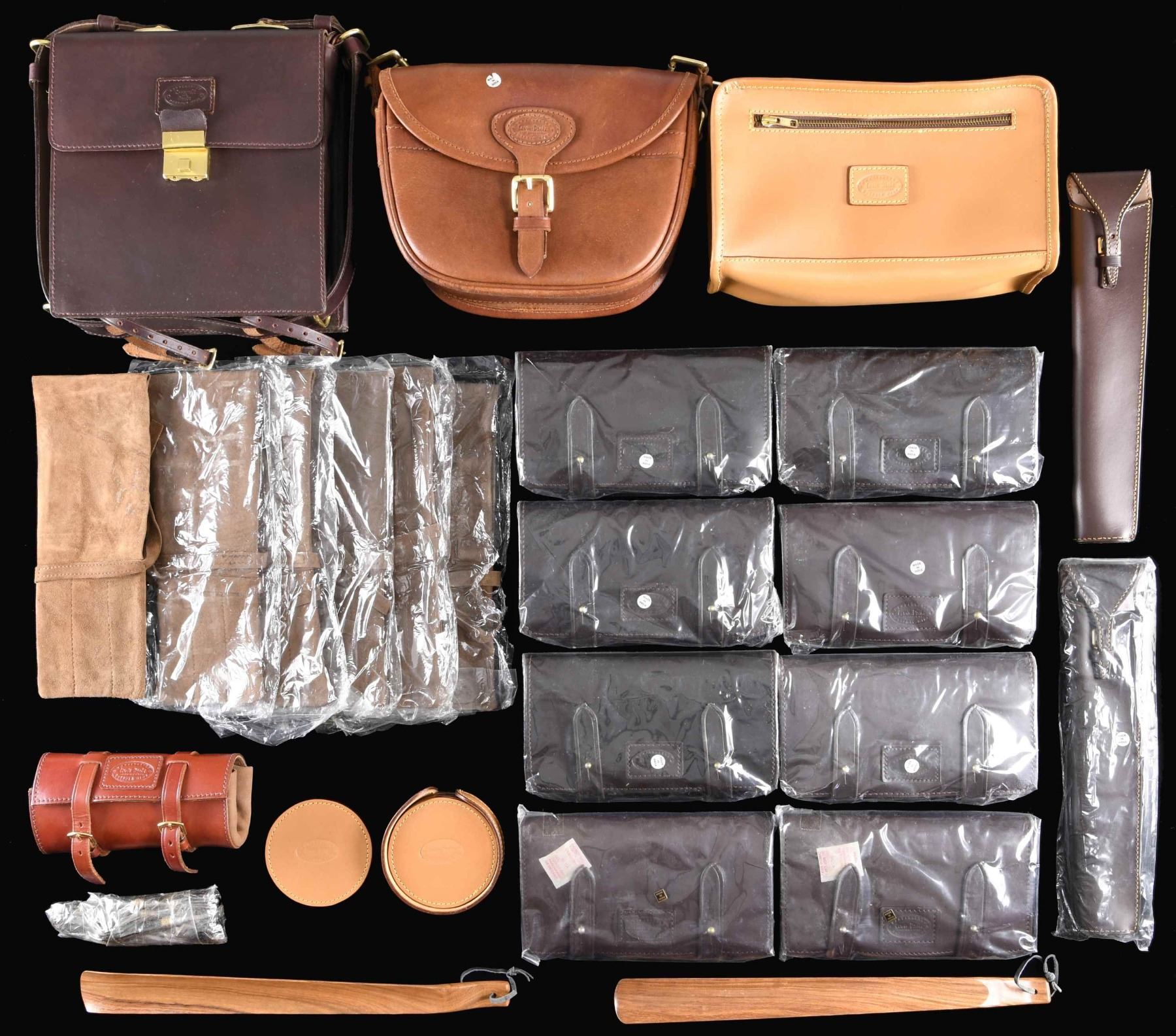 ASSOCIATES. This exceptional lot includes pieces that were once part of the inventory from the world famous hunting and safari outfitting firm of Lewis Drake and Associates. This particular lot includes 1 toiletry bag measuring 11 1/2" x 4" x 7" high with a zipper on either side and the top. A sewn leather debossed tag reads "HANDCRAFTED Lewis Drake AND ASSOCIATES BUFFALO HIDE". / 1 leather holder containing 6 coasters. All of the coasters are debossed "HANDCRAFTED Lewis Drake AND ASSOCIATES BUFFALO HIDE". / 1 roll-up tool pouch containing 4 chisels or gouges. The exterior has a debossed leather tag that reads "HANDCRAFTED ROOSEVELT AND DRAKE BUFFALO HIDE". / 1 over-the-shoulder pouch for small game or shotgun shells. The pouch features a latchable top flap and a leather shoulder strap. The exterior has an oval debossed label that reads "HANDCRAFTED ROOSEVELT AND DRAKE BUFFALO HIDE". / 8 cartridge pouches for the belt that hold 10 large caliber rifle rounds each. All have a label on the front flap that reads "HANDCRAFTED Lewis Drake AND ASSOCIATES BUFFALO HIDE". / 2 pouches for gun cleaning rods. The inside flap has a sewn cloth label that reads "Lewis Drake AND ASSOCIATES". / 1 over-the-shoulder square satchel measuring 10" x 10" x 3 1/2" deep. The exterior flap has a debossed leather label that reads "HANDCRAFTED Lewis Drake AND ASSOCIATES BUFFALO HIDE". / 2 carved rosewood shoe horns. / 6 sueded leather gun cleaning rod and implement pouches. / CONDITION: all items are unused and as manufactured. Some items show light storage wear. PROVENANCE: from the renowned collection of quality sporting arms from Lewis Drake together with inventory of Lewis Drake Associates. (02-23565-44/BF). $500-800.