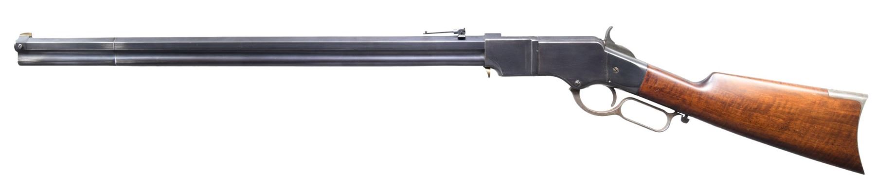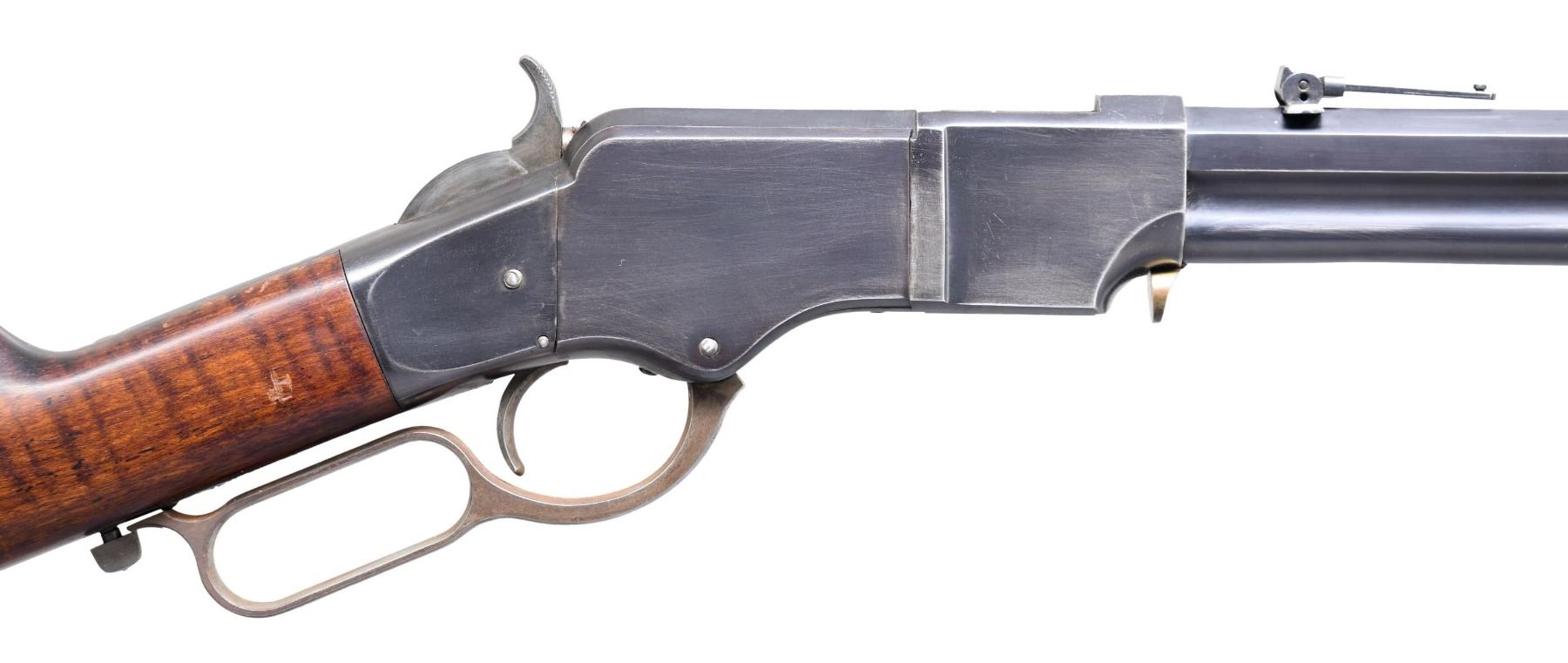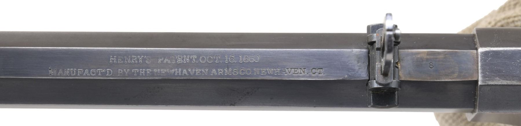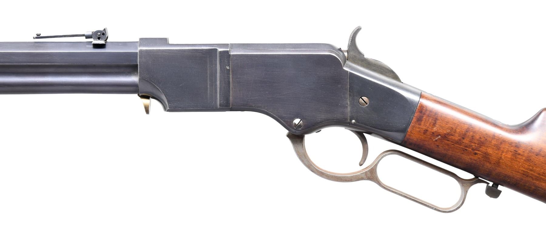 Cal. 44-40. S# 8/39. Standard configuration 1860 Henry rifle, but with iron frame, all serif address on 24" octagonal barrel, S# 8 stamped rear of 900 yard ladder site, S# 39 Internally on the left side of lower frame tang. Winchester style crescent buttplate without trap. CONDITION: Fine overall, Barrel and frame retaining most of their blue finish. Mechanically fine, bright shiny rifled bore. (25-200/JS). MODERN. $700-1,000.