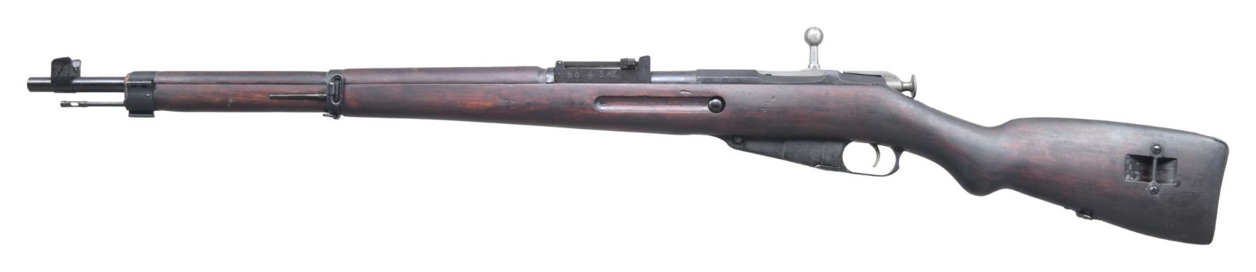 Cal. 7.62x54R. S# 27541. Bbl. 27" with IO Inc import marking on top. Blade front sight with protective ears. Ladder rear sight graduated to 2000m. Matching numbers on bolt knob & bbl. shank. Other parts unnumbered or mismatched. Bbl. shank has boxed "SA" Finnish army marking, "D" D166 marking, 1941 date, serial number & VKT marking. Left side of receiver has importer added serial number. Arsenal blue finish. Hardwood stock set with round wartime joints, bottom mounted & left side sling swivels. Cleaning rod present. CONDITION: stock has dark arsenal refinish appearance with long round armorer repairs ahead of both grasping grooves, a 2 1/2" crack on left side of butt, some dings & handling marks. Metal retains 80% arsenal rework blue with scattered areas of blued over pitting, some light oxidation, fading & edge wear. Action functions properly when hand cycled. Bright near excellent bore. (25-3912/MJC). CURIO. $300-500.