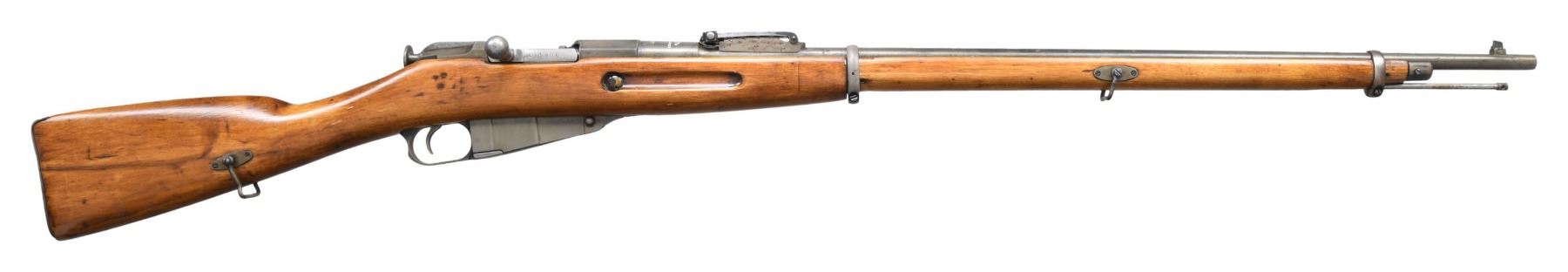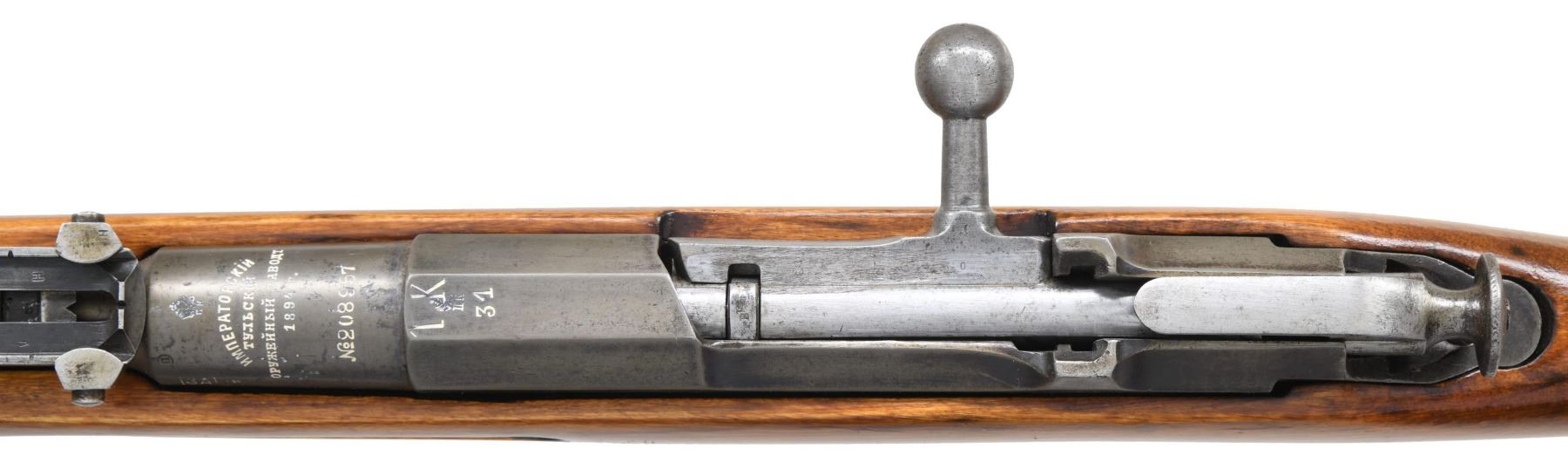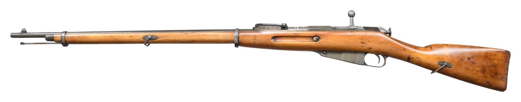 RIFLE. Cal. 7.62x54R. S# 208957. Bbl. 31 1/2". Finnish blade front sight. Konovalov rear sight with Finnish graduations. Matching numbers on bolt & bbl. shank. Other parts are unnumbered or mismatched. Bbl. shank has Tula markings & 1894 date. Left side of bbl. has Finnish army "SA" stamp. Top of receiver has "1K/31" marking likely denoting previous Imperial German use. Varied markings have added white highlight. Metal has an overall gray appearance. Finnish replacement stock set with finger joint splice & bottom mounted sling swivels. Cleaning rod present. No handguard present. CONDITION: refinished stock has added varnish with a faint Finnish name in the left grasping groove, scattered handling marks & dings. Metal has a gray cleaned appearance with scattered pitting patches along bbl. & scattered oxidation. Action functions properly when hand cycled. Muzzle is counterbored but bore otherwise shows scattered frosting & light pitting but strong rifling. (01-27212/MJC). ANTIQUE. $300-500.