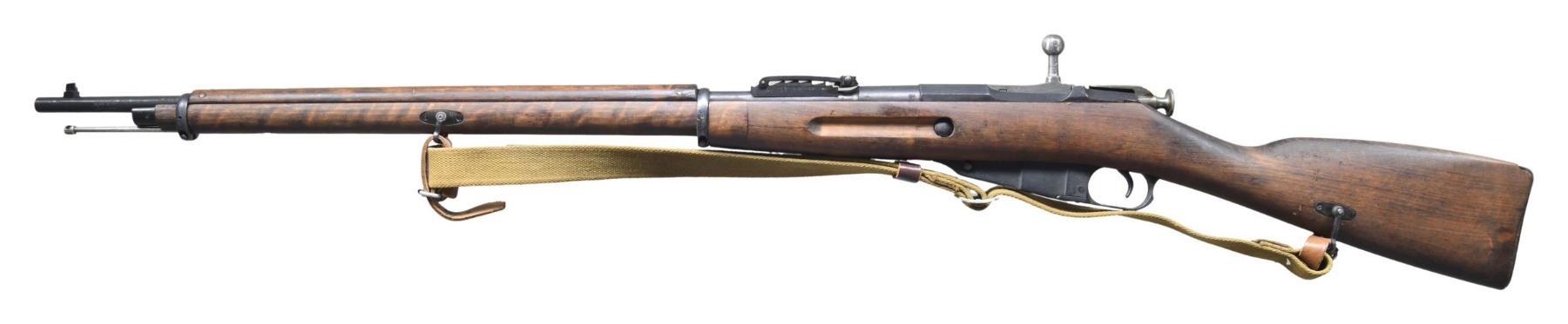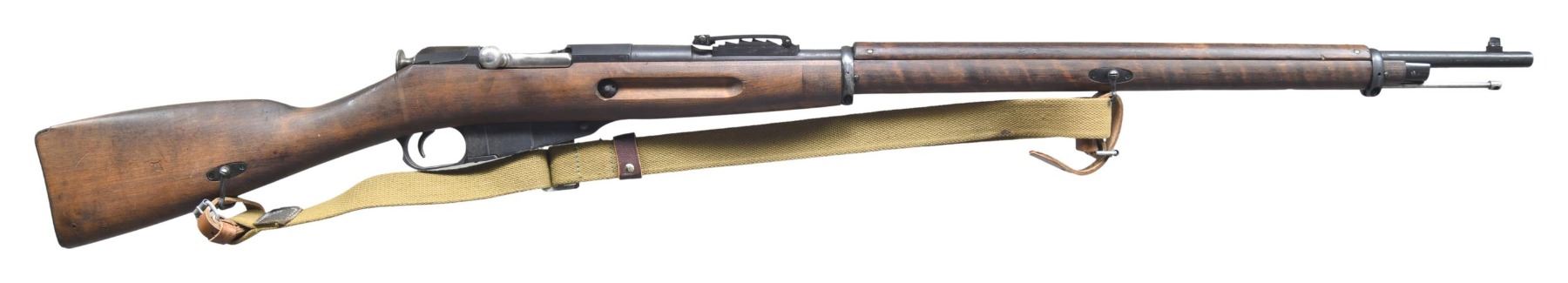 ACTION RIFLE. Cal. 7.62x54R. S# 402913. Bbl. 31 1/2" with Century import marking. Blade front sight. Konovalov rear sight with Finnish graduations. Bolt knob renumbered by Finns to match bbl. shank. Other parts unnumbered as-is typical for Finnish rework Mosin rifles. Bbl. shank has "Curved Logo" Westinghouse & "D" D166 marking with 1915 date. Left side of bbl. has Finnish Army boxed "SA" marking. Right side of mag body marked "HV". Finn arsenal rework blue finish. Finnish stock set with finger joint construction, bottom mounted sling swivels & canvas sling. Right side of butt has Finnish cartouche. Cleaning rod present. CONDITION: stock set shows a handguard crack, scattered dings & handling marks. Buttplate cleaned to a silvery-gray color with some pitting & oxidation. Balance of metal retains 90% arsenal rework blue with scattered blued over pitting & edge wear. Action functions properly when hand cycled. Muzzle has a counterbore, bore otherwise shows scattered frosting & light pitting with good rifling. (25-2316/MJC). CURIO. $300-500.
