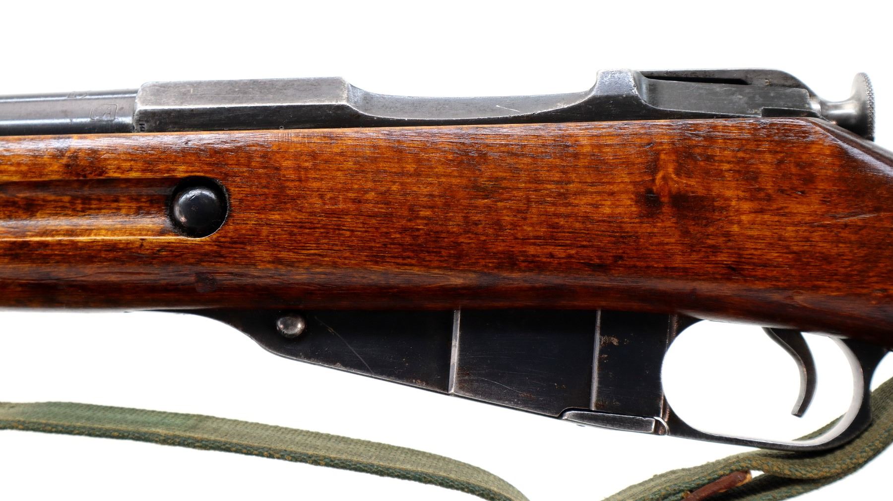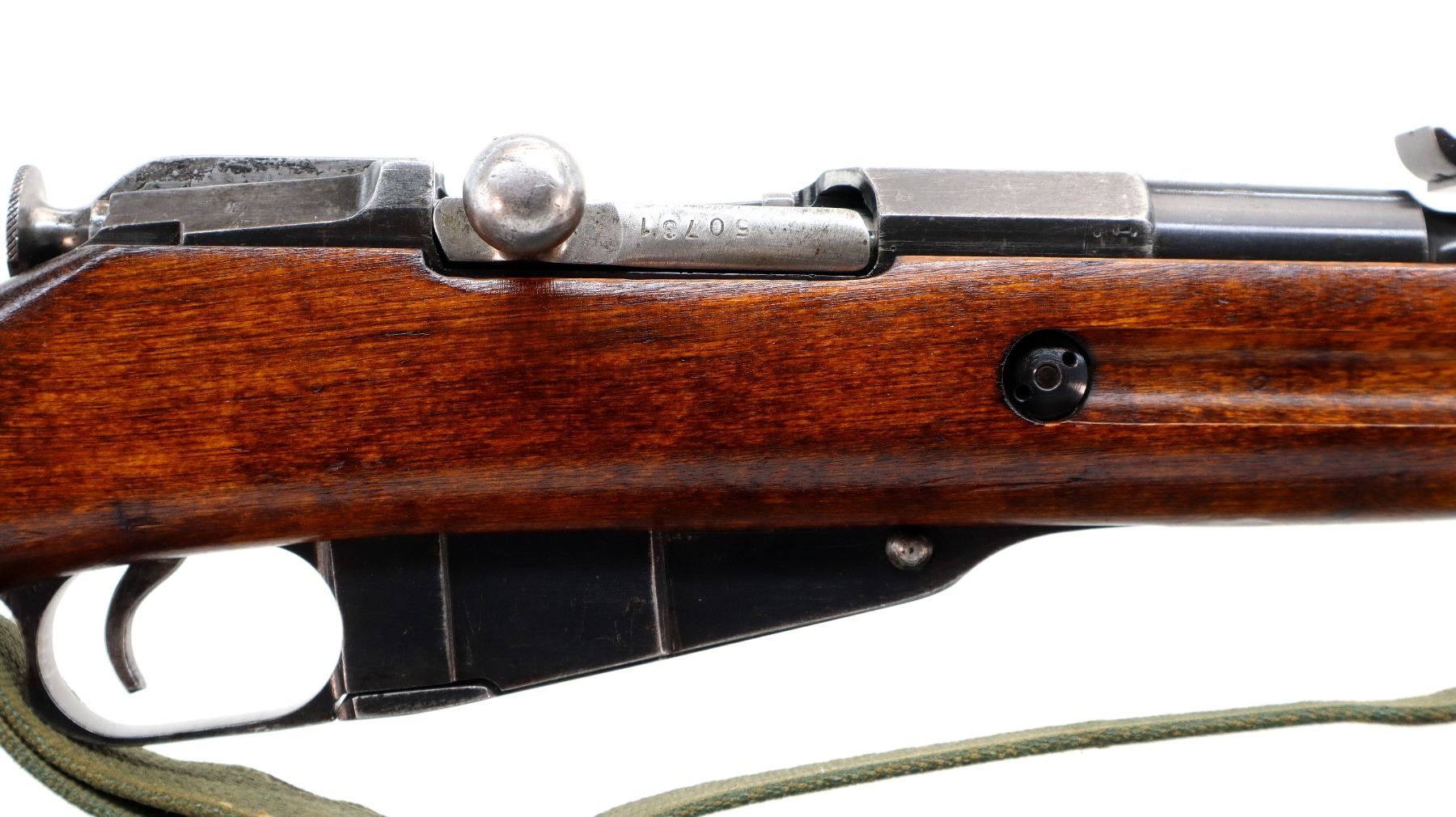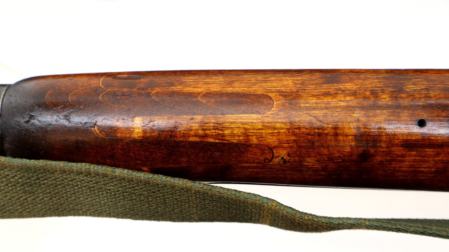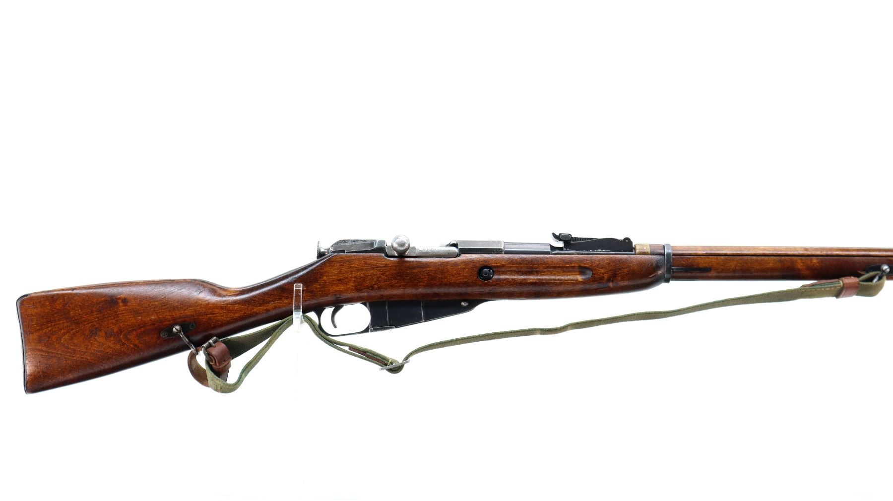 Main Description: Barrel Manufactured by Tikka 1943, bolt numbered to match, other parts do not. Blade front sight with ramp, adjustable u notched rear sight, blued finish, barrel has SA in a box indicating Finnish Military ownership, hex receiver, silver bolt with straight handle. Two piece full military wood stocks, finger grooved forearm, straight grip, smooth steel butt plate, sling swivels with green canvas and leather sling dated 1953, cleaning rod.