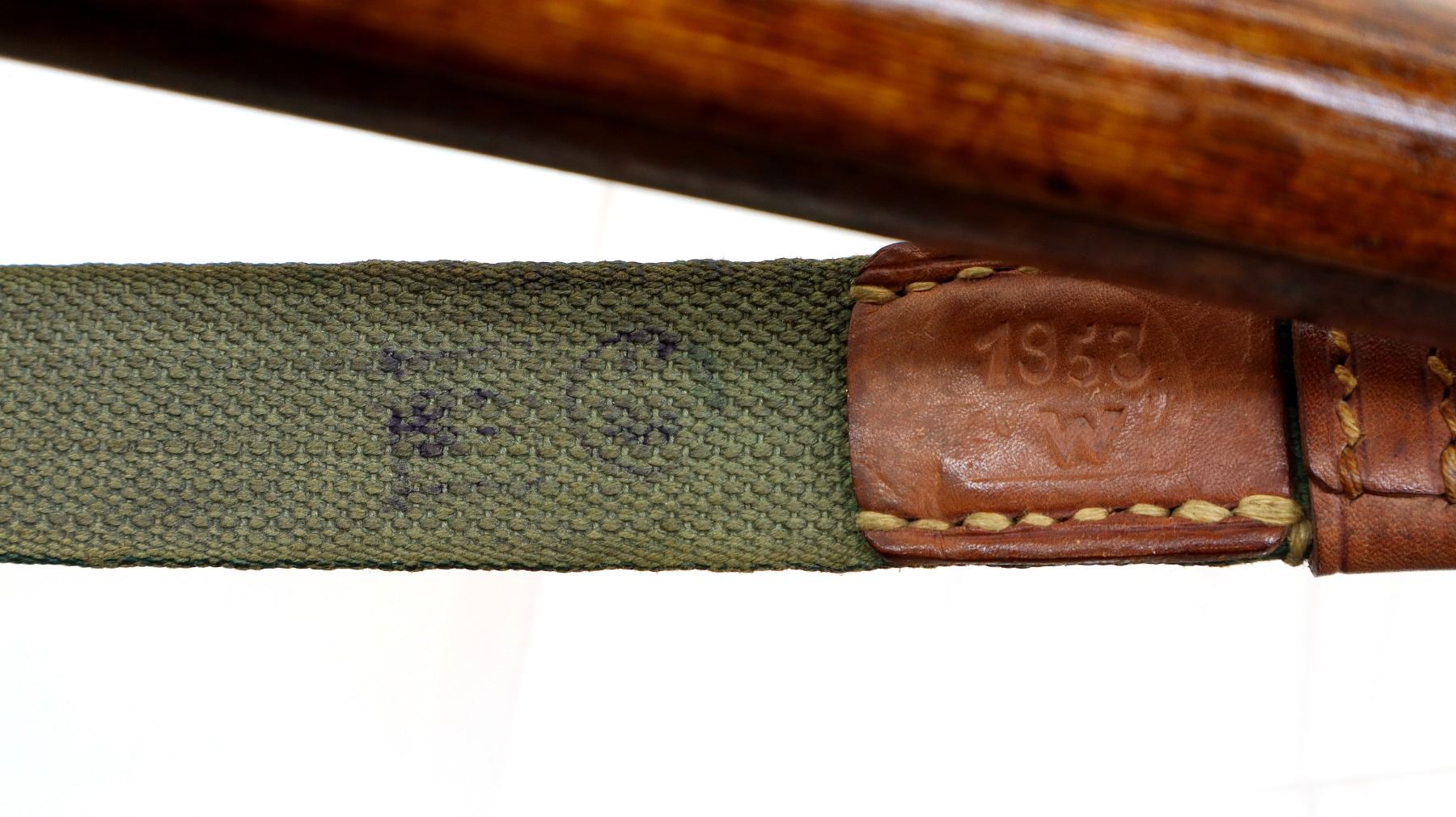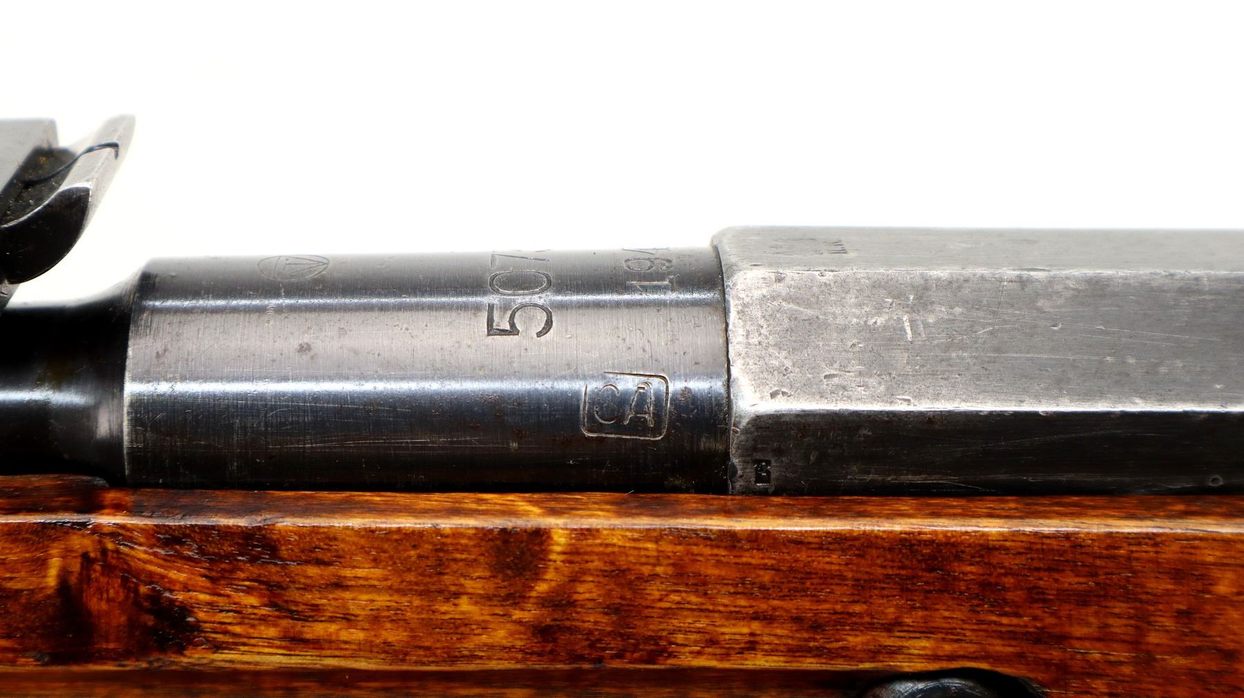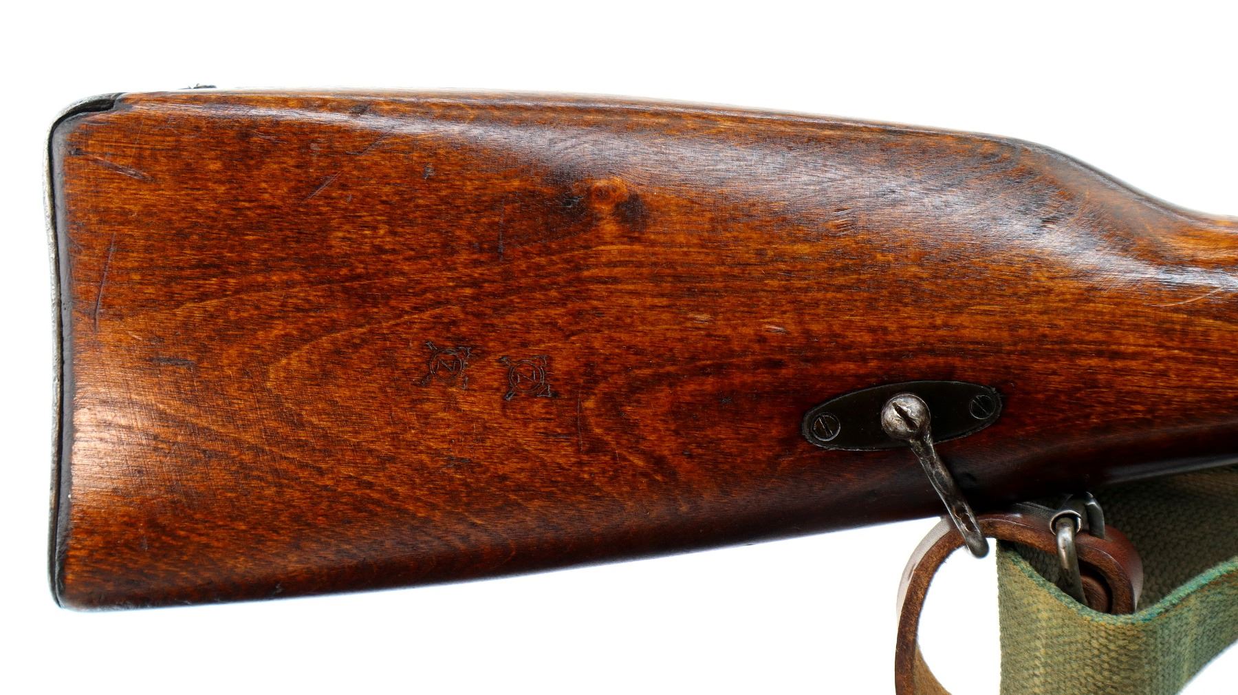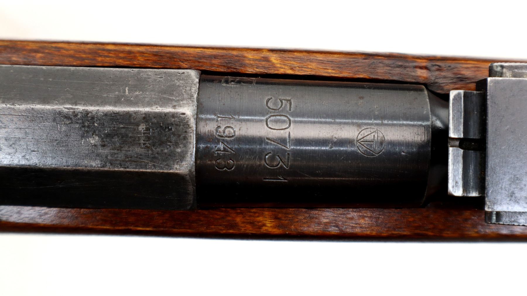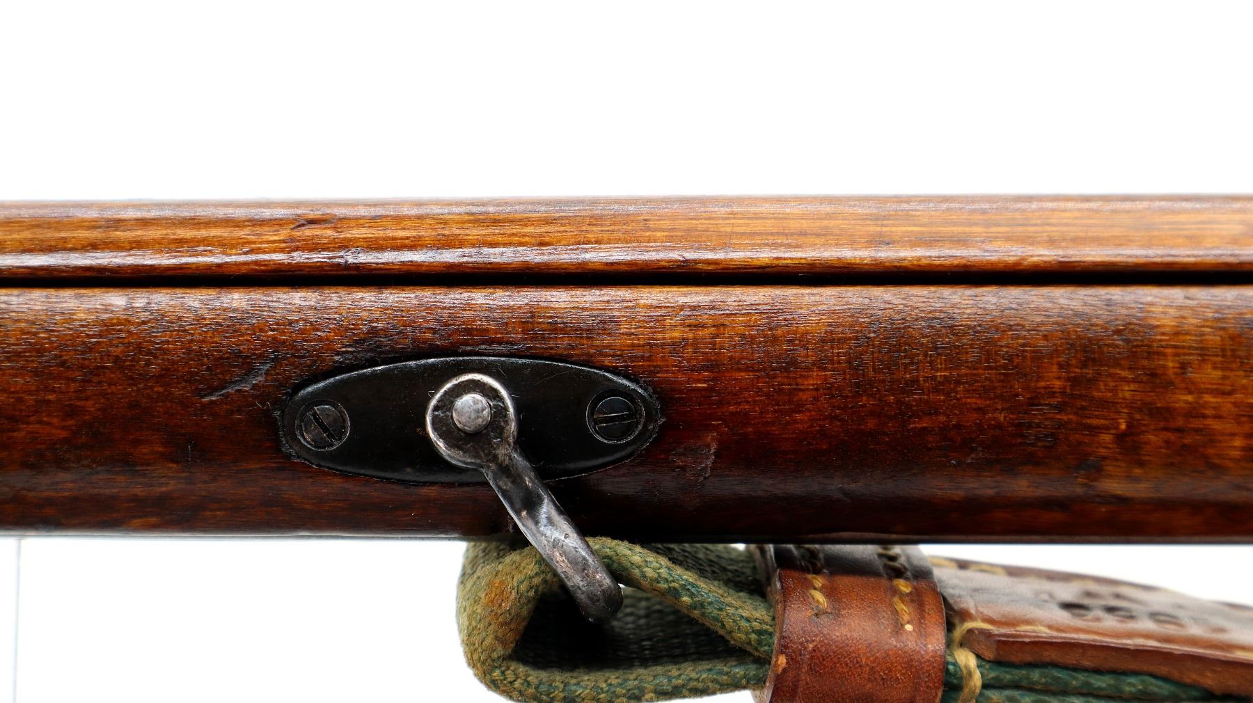 Main Description: Barrel Manufactured by Tikka 1943, bolt numbered to match, other parts do not. Blade front sight with ramp, adjustable u notched rear sight, blued finish, barrel has SA in a box indicating Finnish Military ownership, hex receiver, silver bolt with straight handle. Two piece full military wood stocks, finger grooved forearm, straight grip, smooth steel butt plate, sling swivels with green canvas and leather sling dated 1953, cleaning rod.