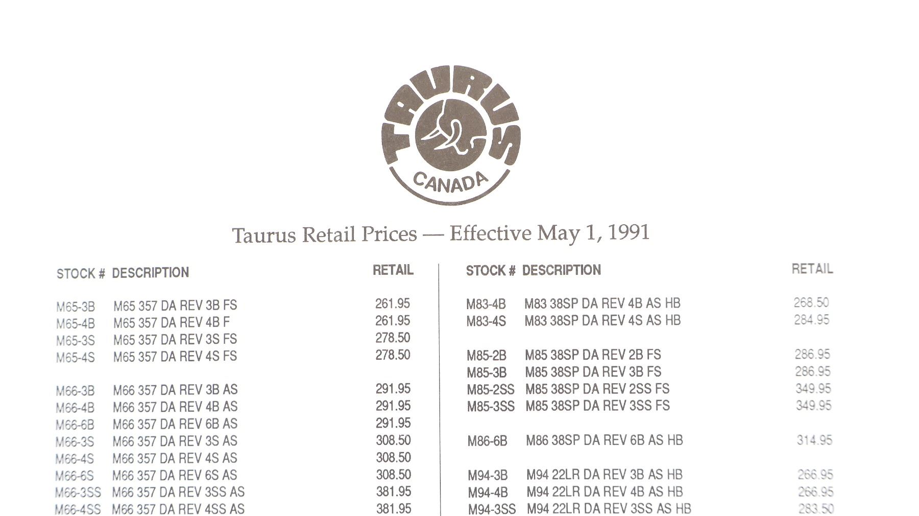 LOT INCLUDES; (2) TAURUS CANADA CATALOGUES, 1ST & 2ND EDITIONS, WITH RETAIL PRICES DATED 1991, SOFT COVER. SEE PHOTOS.