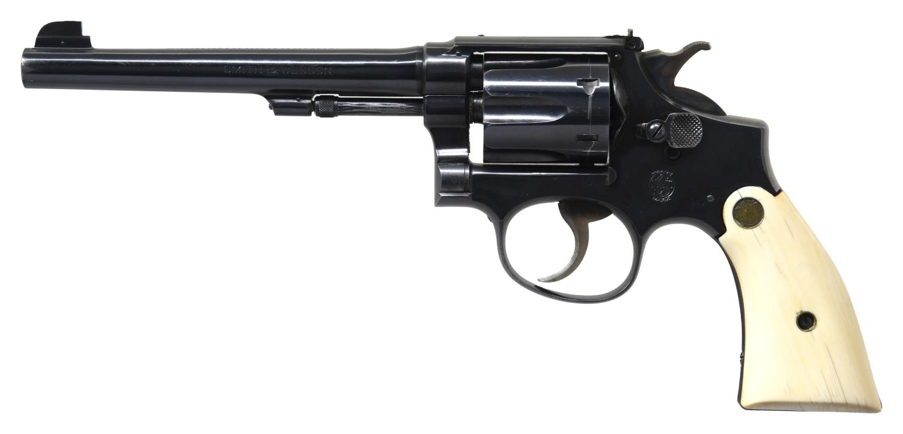REVOLVER. Cal. 22 LR. S# 645520. Bbl. 6". Patridge front sight with stainless bead. Adjustable square notch rear sight. Matching numbers on grip frame, bbl., cyl. & extractor. First Model K22 Outdoorsman revolver. Blued finish with case colored trigger & hammer. Replacement white colored grips with small gold S&W medallions. UNATTACHED ACCESSORIES: factory letter that states the gun shipped with walnut grips but otherwise confirms its configuration. The revolver was part of a solo shipment to the Texas City Police Department in January, 1934. Also included is a copy of the shipping invoice. CONDITION: grips show some light handling wear. Trigger & hammer retain strong amounts of their case colors with scattered operational wear & light oxidation. Balance of metal retains 90% factory quality reblue with some cleaned oxidation under grips, some scattered edge wear, light scratches & some light minor oxidation. Action functions properly when hand cycled. Bright ver good bore. PROVENANCE: From the Estate of Jon Thomas, Gunsport, LTD. (25-1100/MJC). CURIO. $500-800.