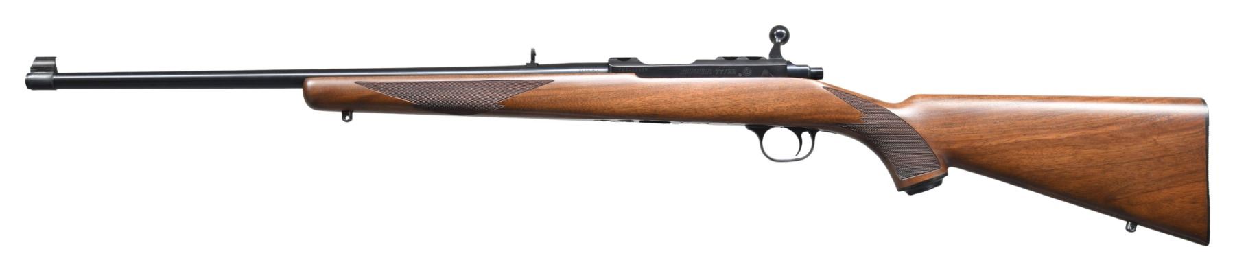 Cal. 22 LR. S# 700-02016. Bbl. 20" with banded brass bead front sight and folding leaf rear. Mfg. 1984 (1984-2014) with checkered walnut stock having grip cap, sling studs and earliest style buttplate of serrated plastic with Ruger logo; later examples had sold rubber butt pad. Caliber marking on barrel is ".22 L.R. CAL.". Classic small game rimfire sporting rifle patterned after the popular Ruger Model 77 centerfire rifle. MAGS: 1 factory 10 rd. UUNATTACHED ACCESSORIES: original factory box. CONDITION: all aspects near excellent appearing new and unfired. (24-3757/NW). MODERN. $600-850.