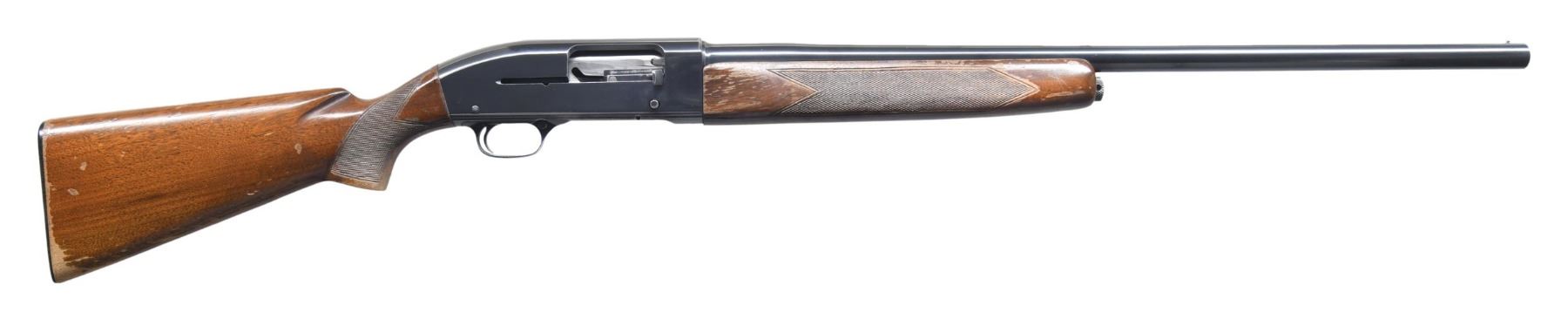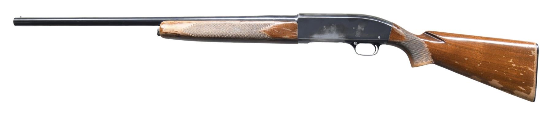 SHOTGUN. Cal. 12 Ga., 2 3/4". S# 9950. Mfg. 1954. Plain 28" bbl. w/ steel bead & "WS-1" Skeet marked choke. Steel receiver. Checkered walnut stock set. CONDITION: balance of blue is very good overall with large area of worn finish in carry area of receiver. Fair wood finish with large portions of peeling finish around checkering & buttplate. Good shiny bore with light fouling. (25-2488/MD). CURIO. $250-350.