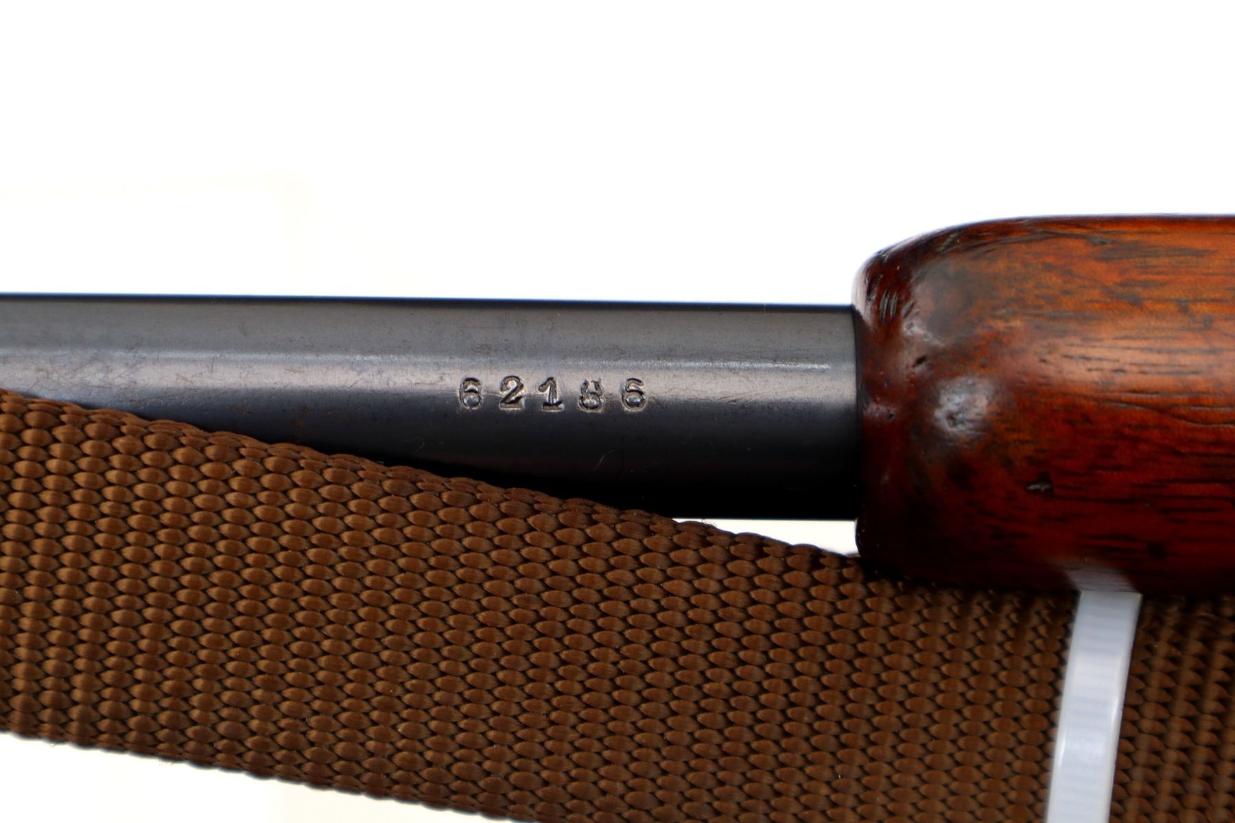 Main Description: Blade front sight, adjustable u notched rear sight, blued finish, straight bolt handle, extractor is present. One piece wood stock, straight grip chipped and cracked behind receiver, smooth butt, number etched on left side, sling swivels with brown nylon sling.