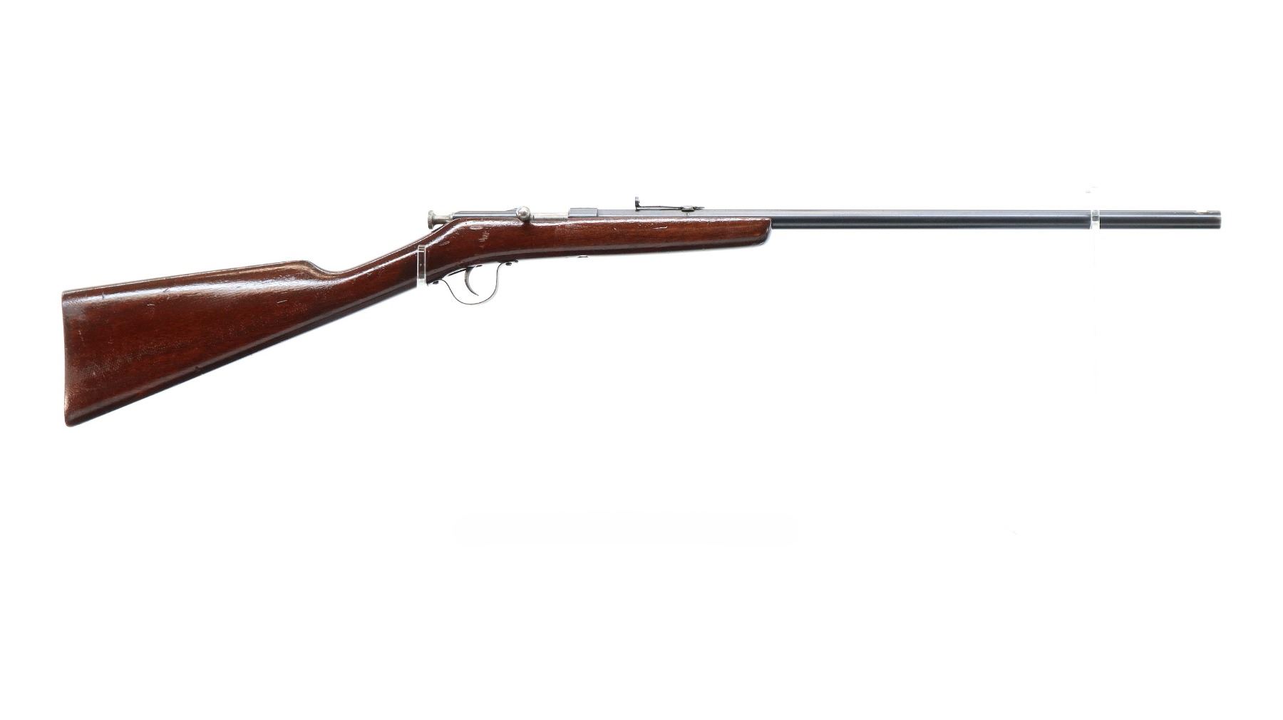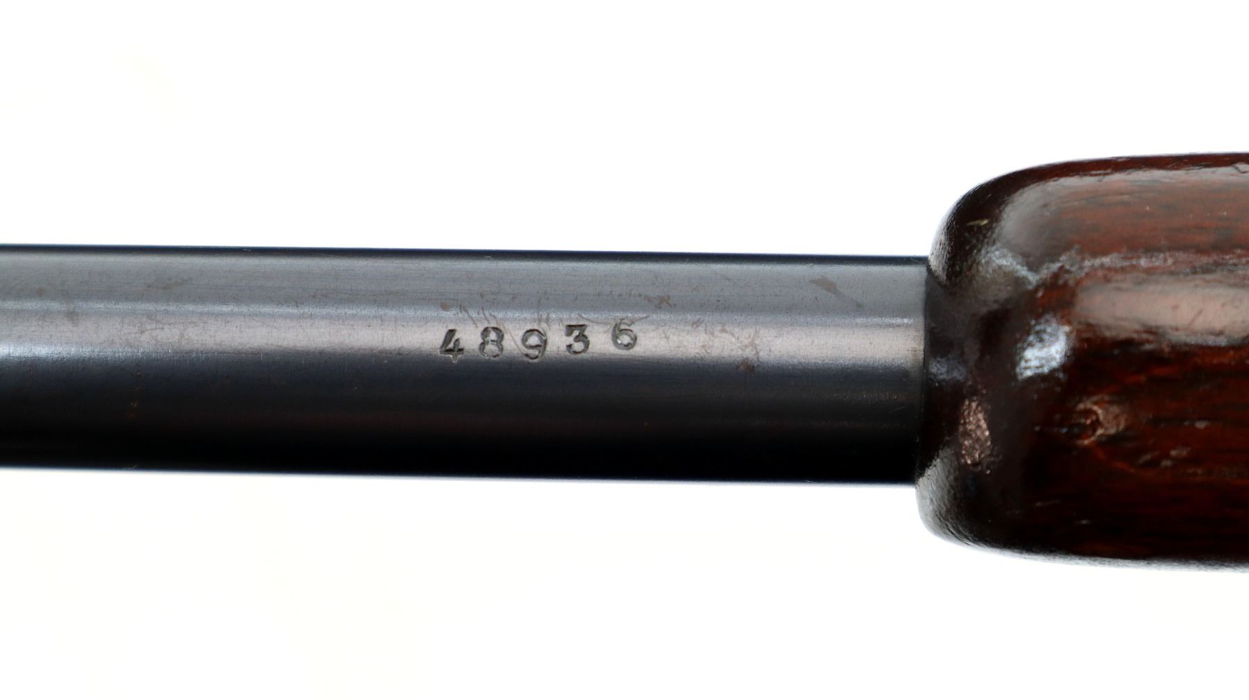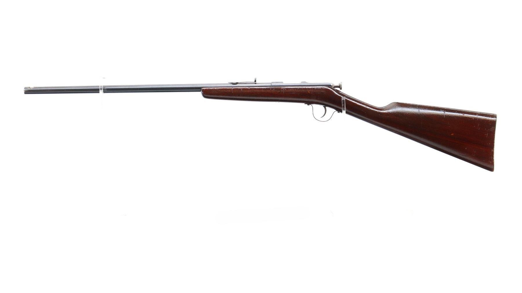 Main Description: Missing front sight dovetail present, adjustable u notched rear sight missing elevator, blued finish, straight bolt handle, extractor is present. One piece wood stock, straight grip, smooth butt.