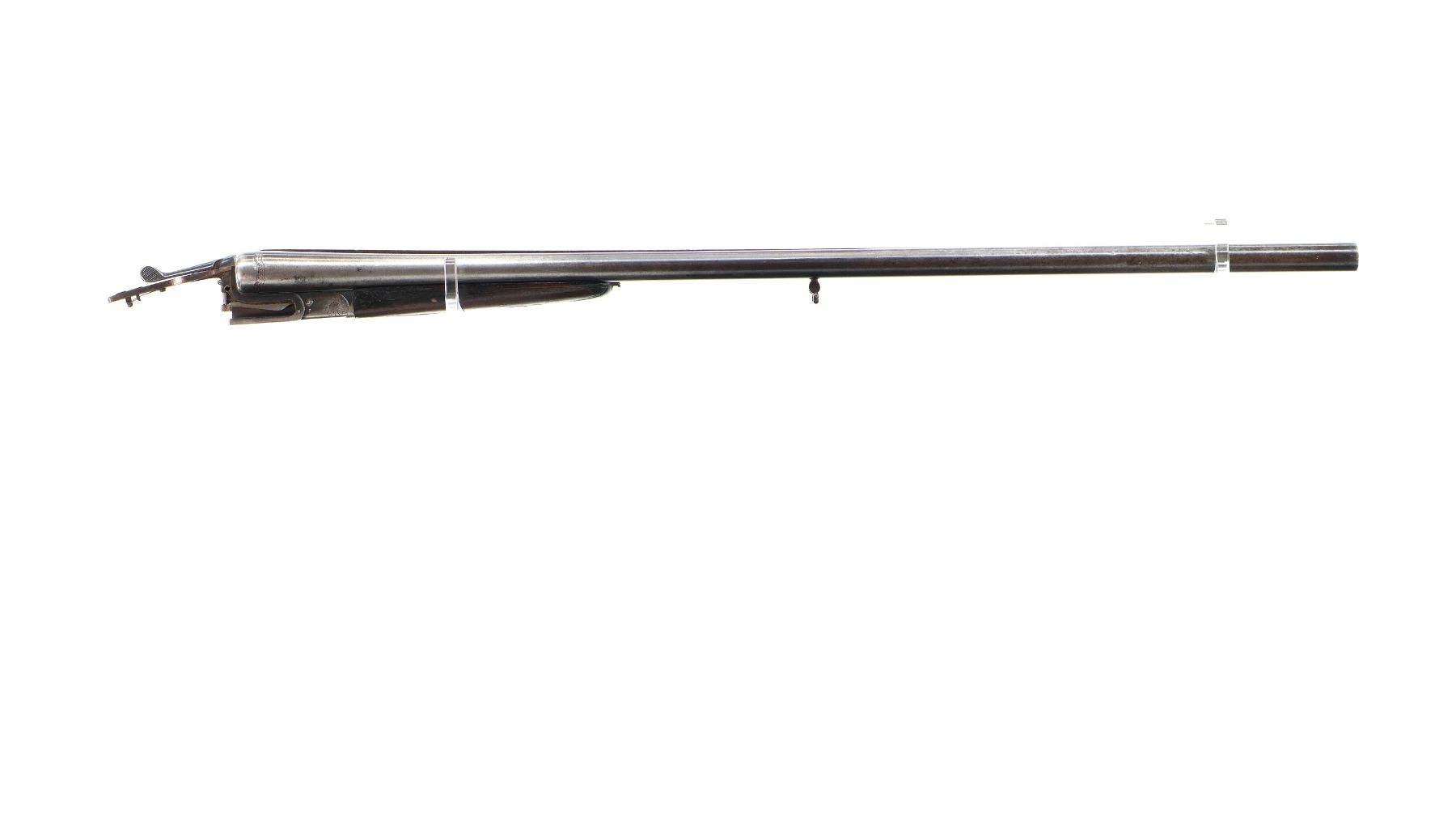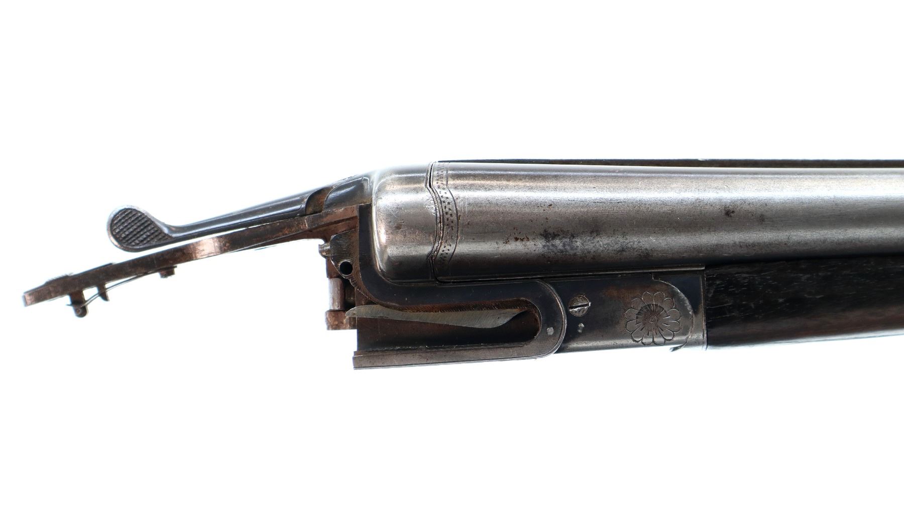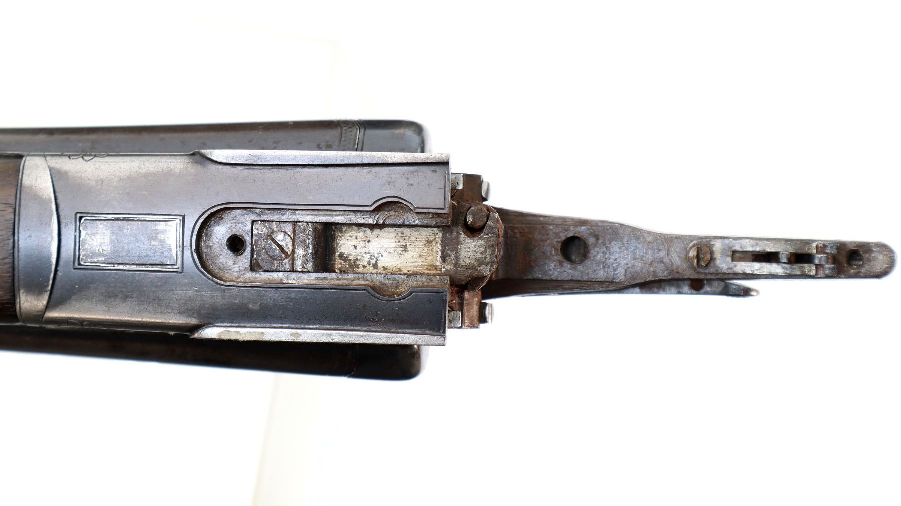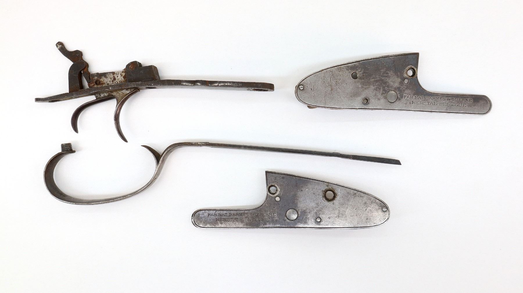 Main Description: Brass bead, blued finish, raised rib, engraved receiver, includes safety opening lever, firing pins, cocking levers, incomplete side locks, trigger frame with triggers and trigger guard. Missing hammers, screws, butt stock and associated parts. Has a one piece checkered wood forearm