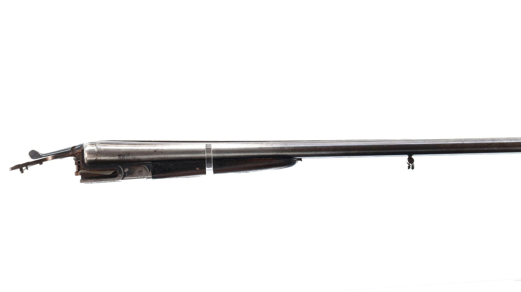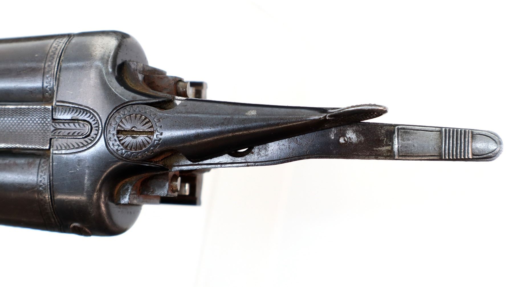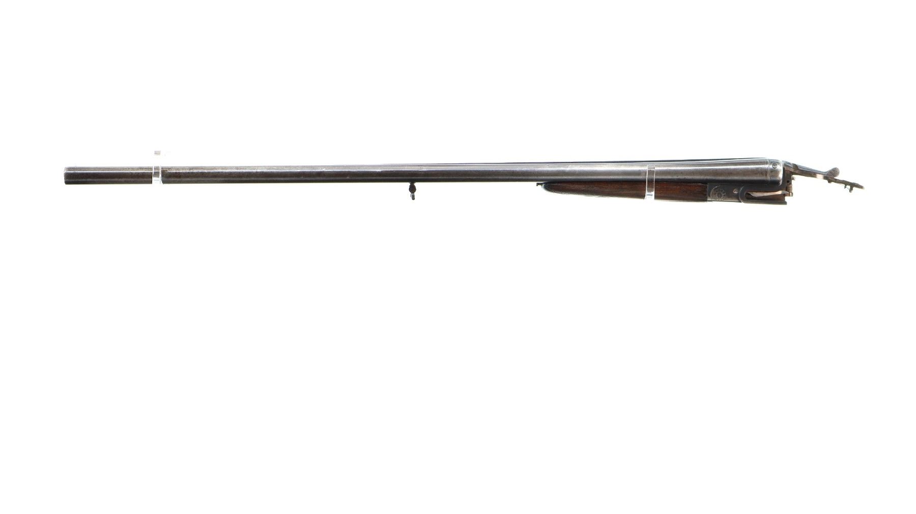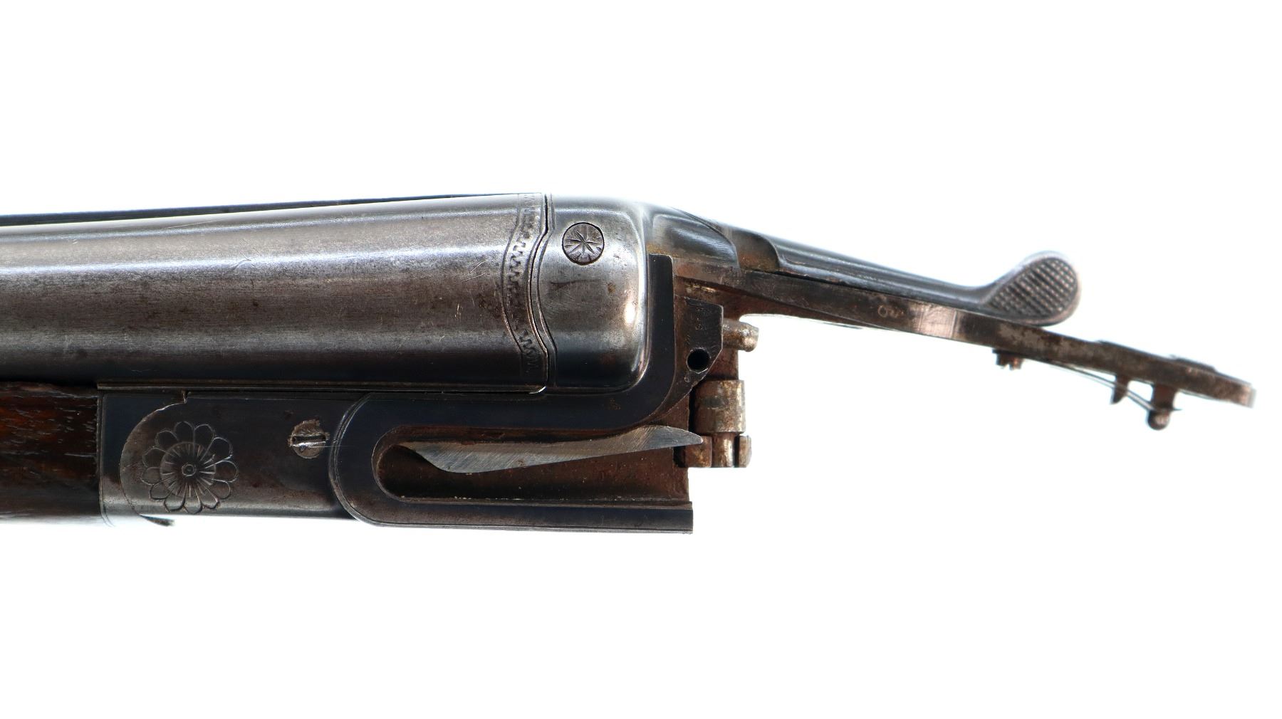 Main Description: Brass bead, blued finish, raised rib, engraved receiver, includes safety opening lever, firing pins, cocking levers, incomplete side locks, trigger frame with triggers and trigger guard. Missing hammers, screws, butt stock and associated parts. Has a one piece checkered wood forearm