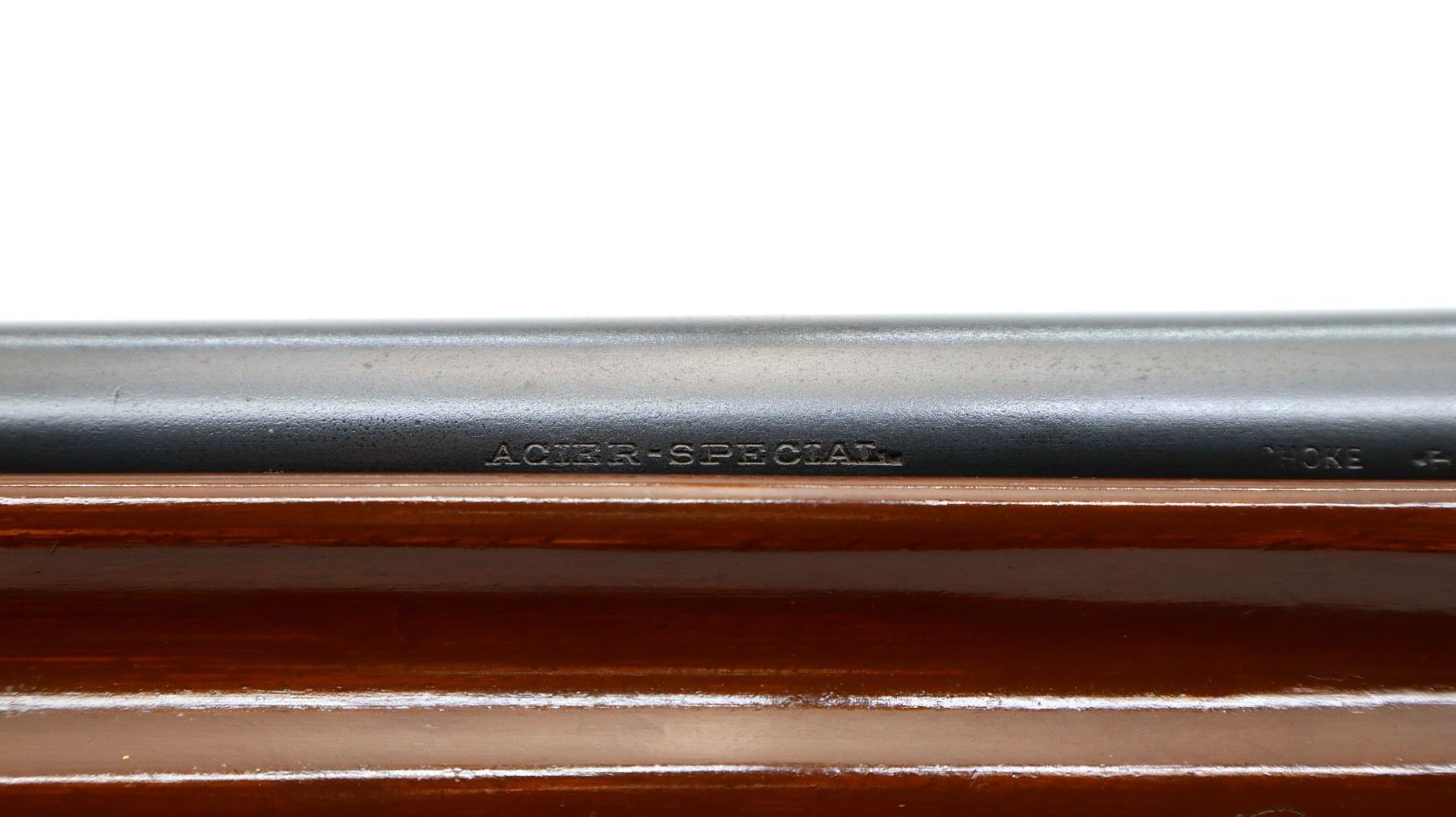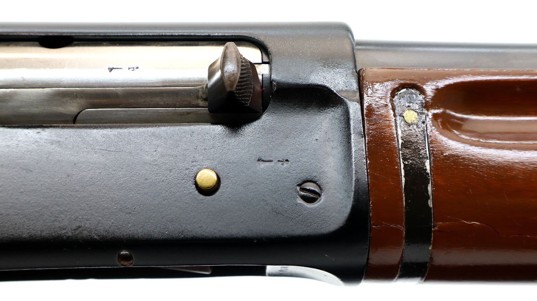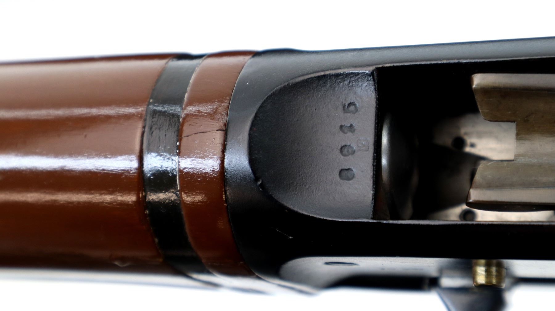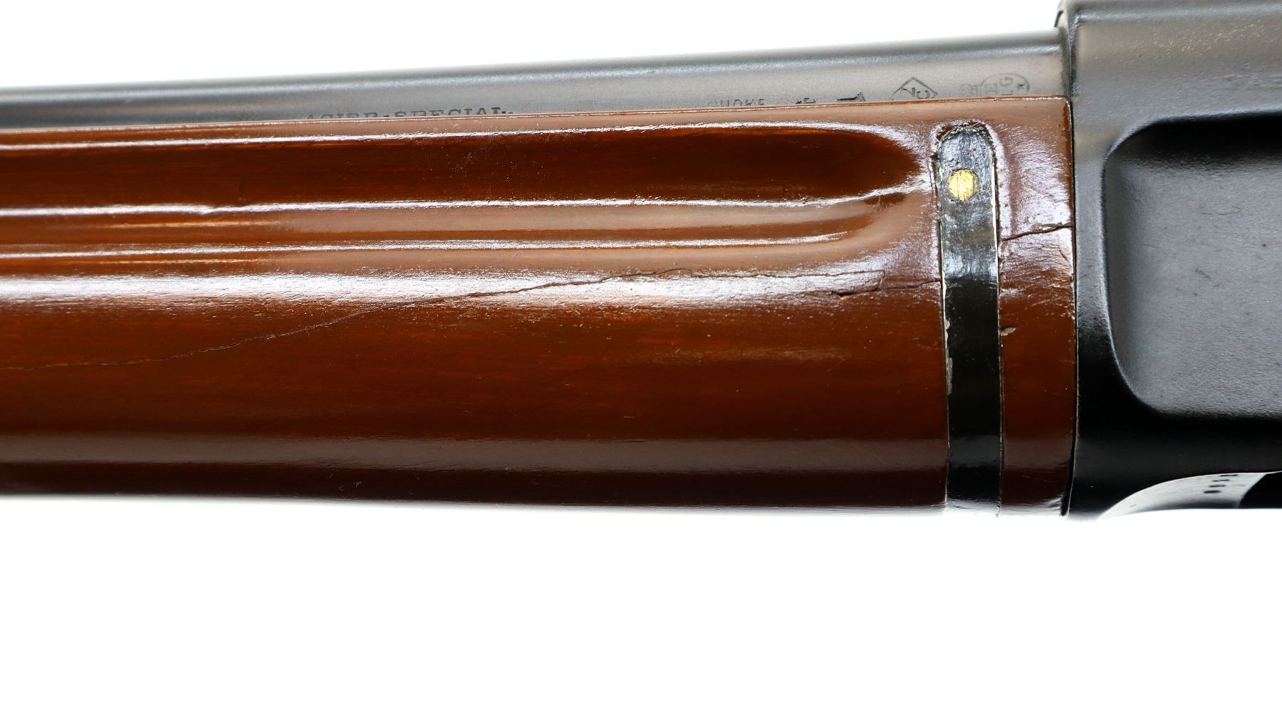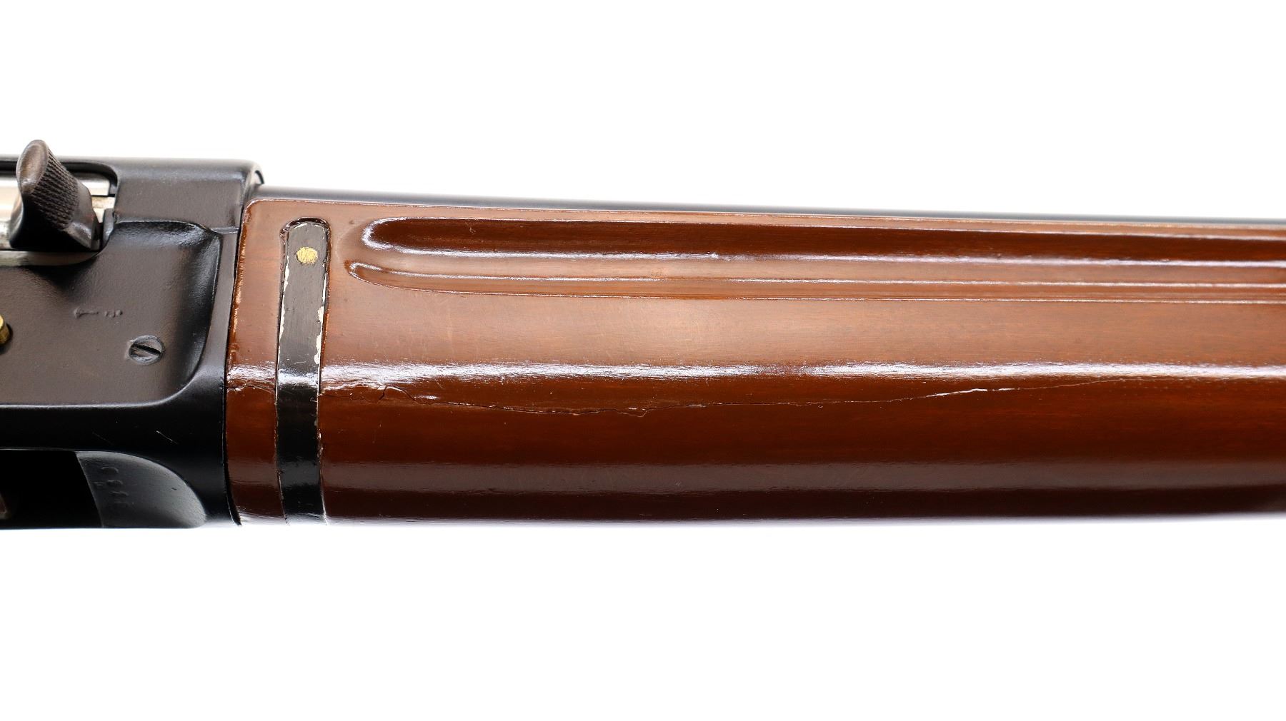 Main Description: Silver bead with ramp, blued round barrel, black painted receiver. Two piece wood stocks, finger grooved forearm which has been cracked and repaired, straight grip, red vented rubber recoil pad