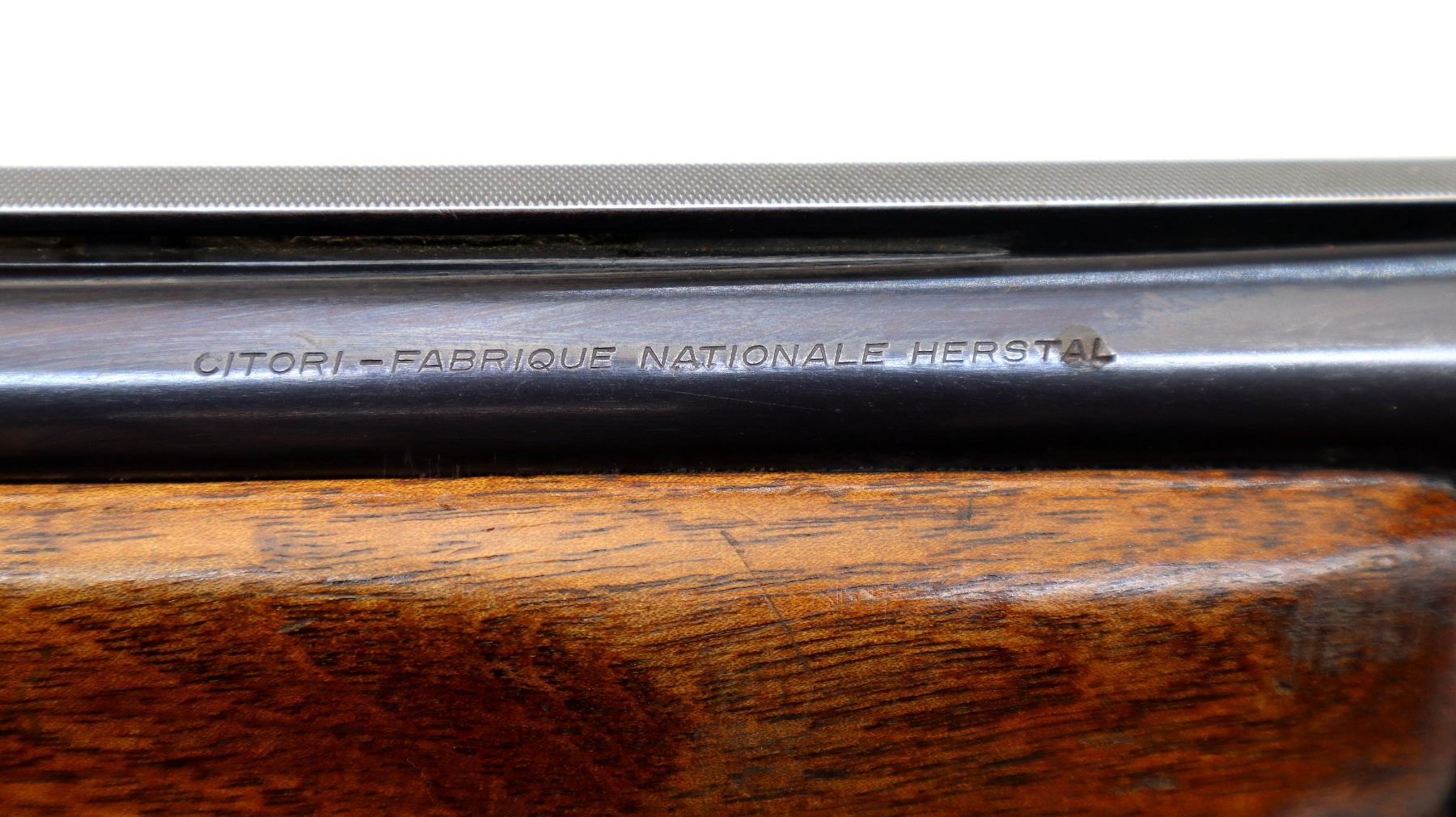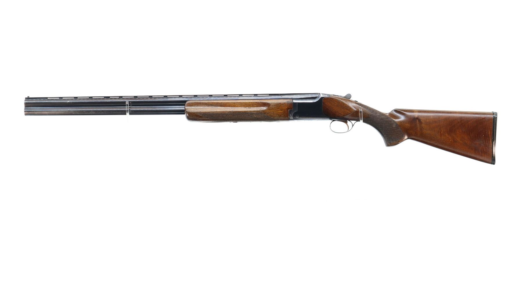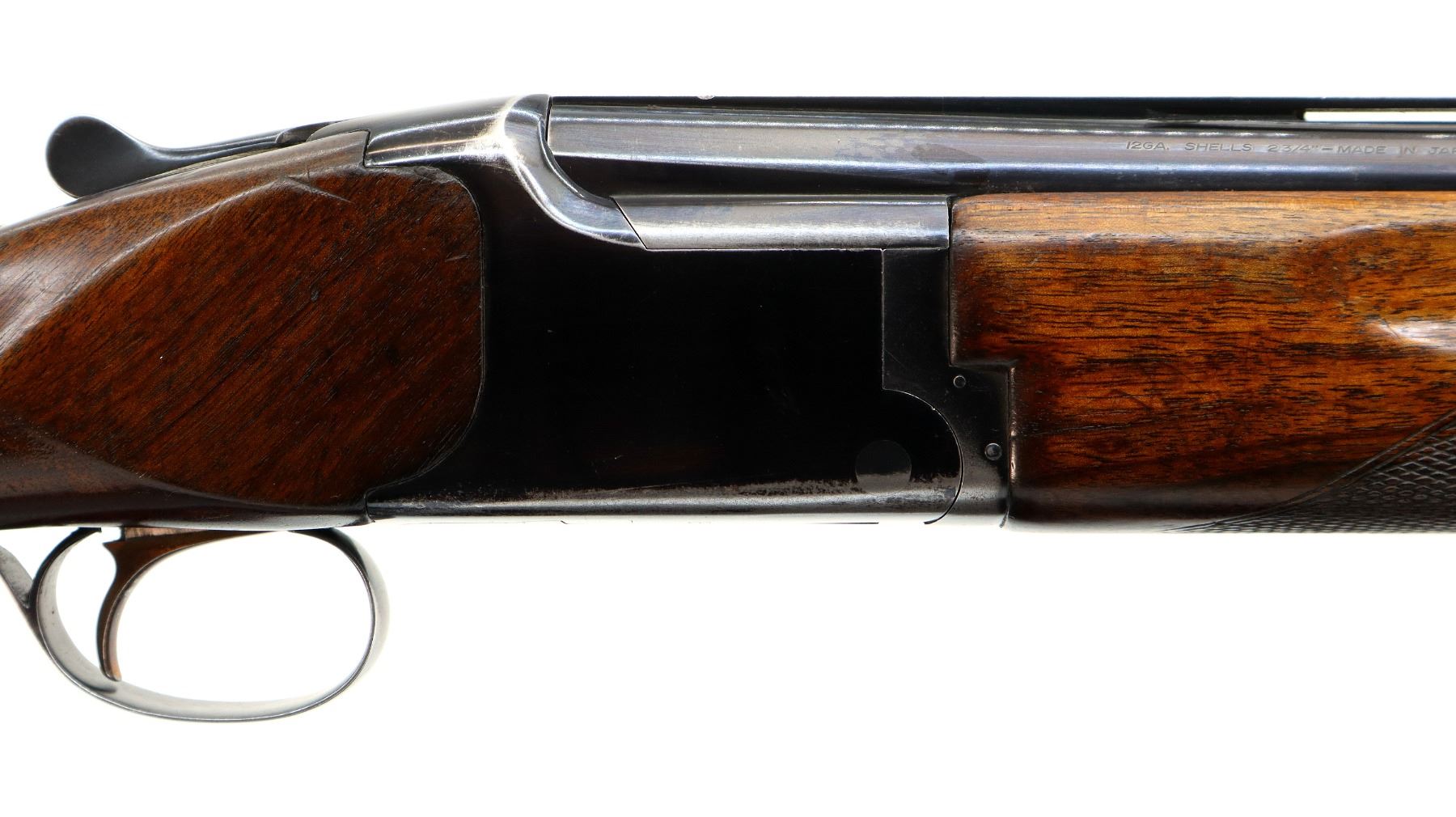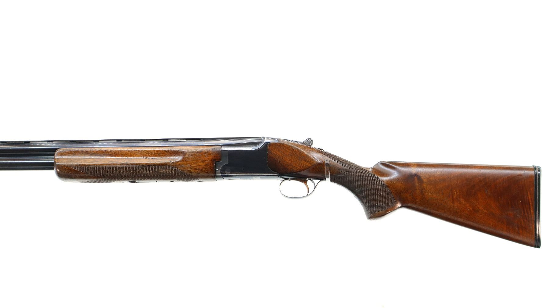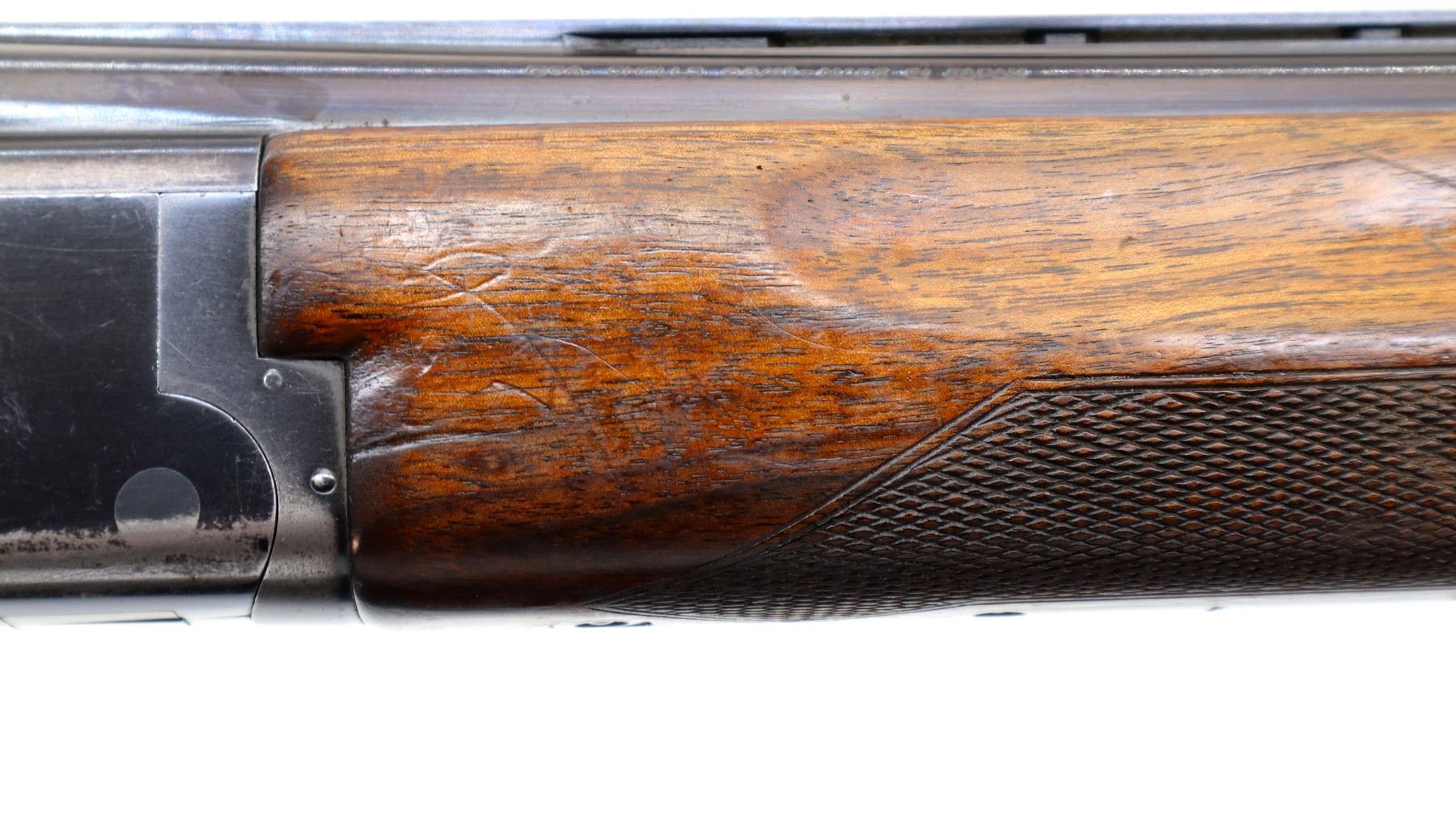 Main Description: Broken front bead, white mid rib bead, blued finish, vent rib, manual selective safety, ejectors, single gold inertia trigger. Two piece wood stocks, finger grooved checkered forearm cracked on right side, checkered pistol grip, Browning logo black polymer butt plate