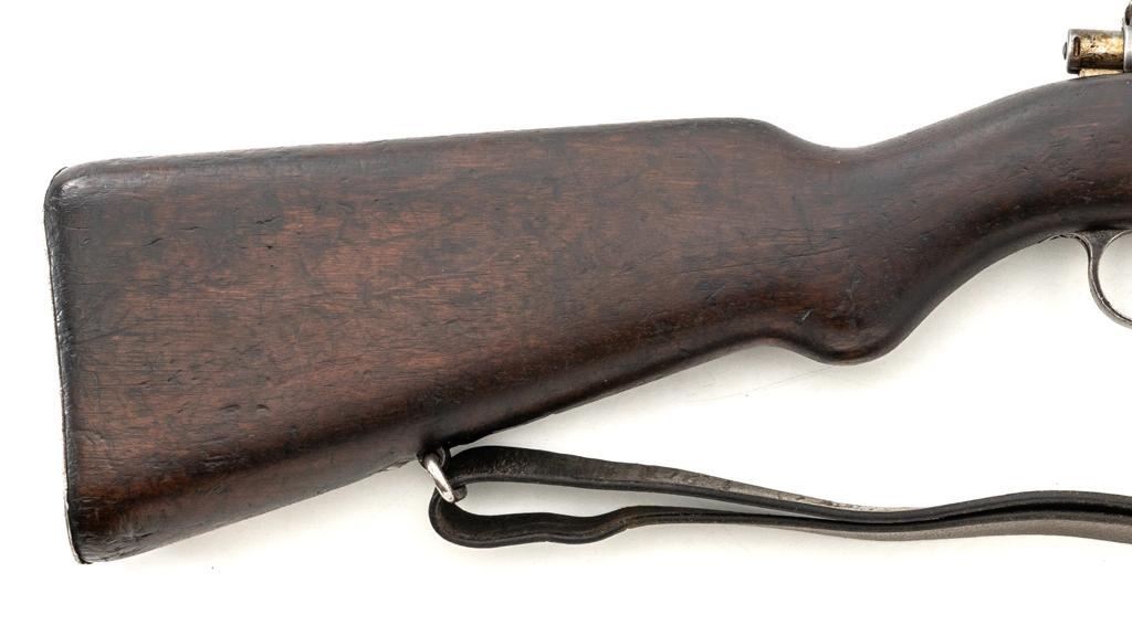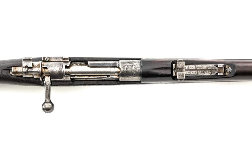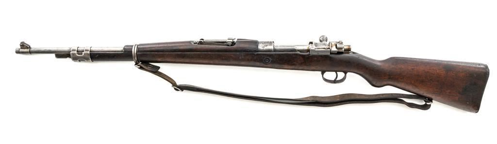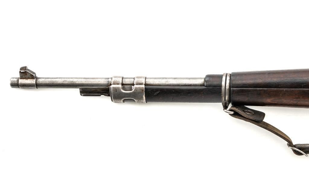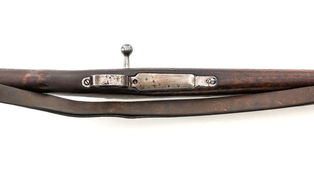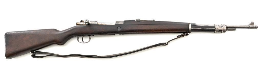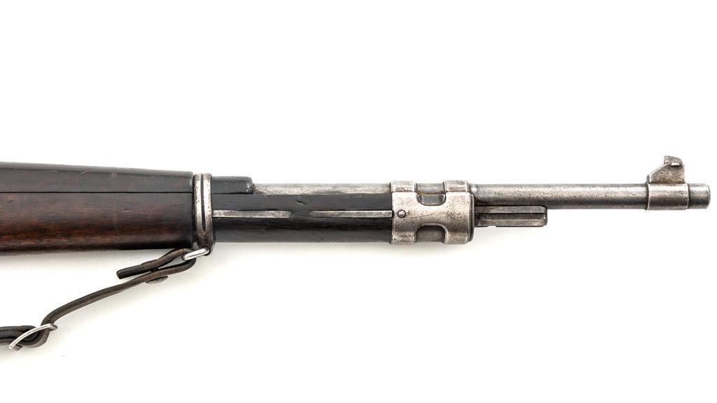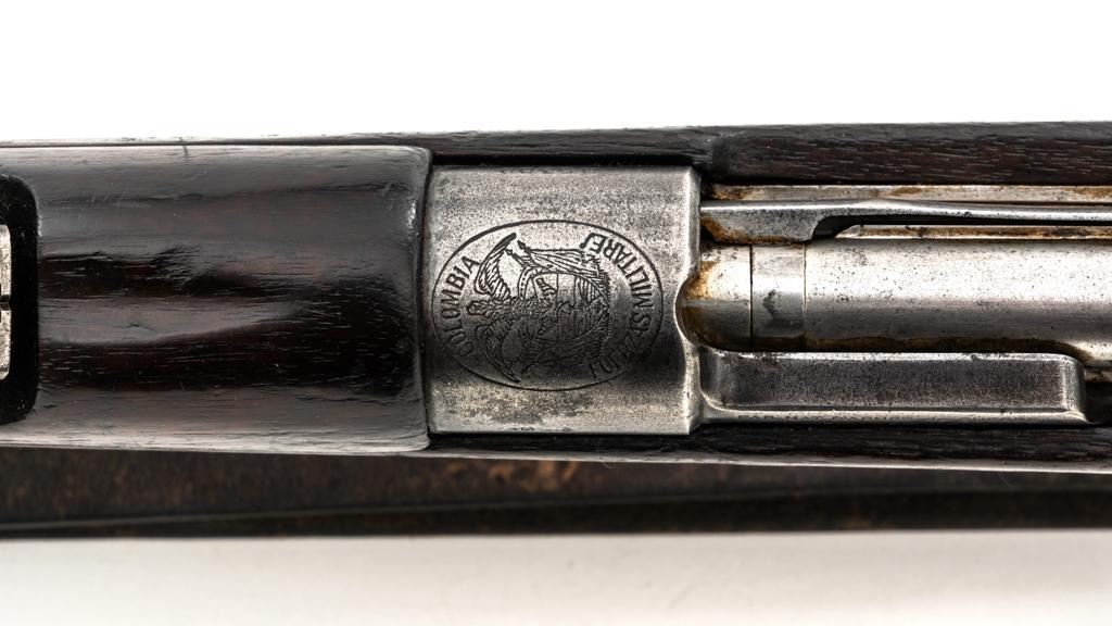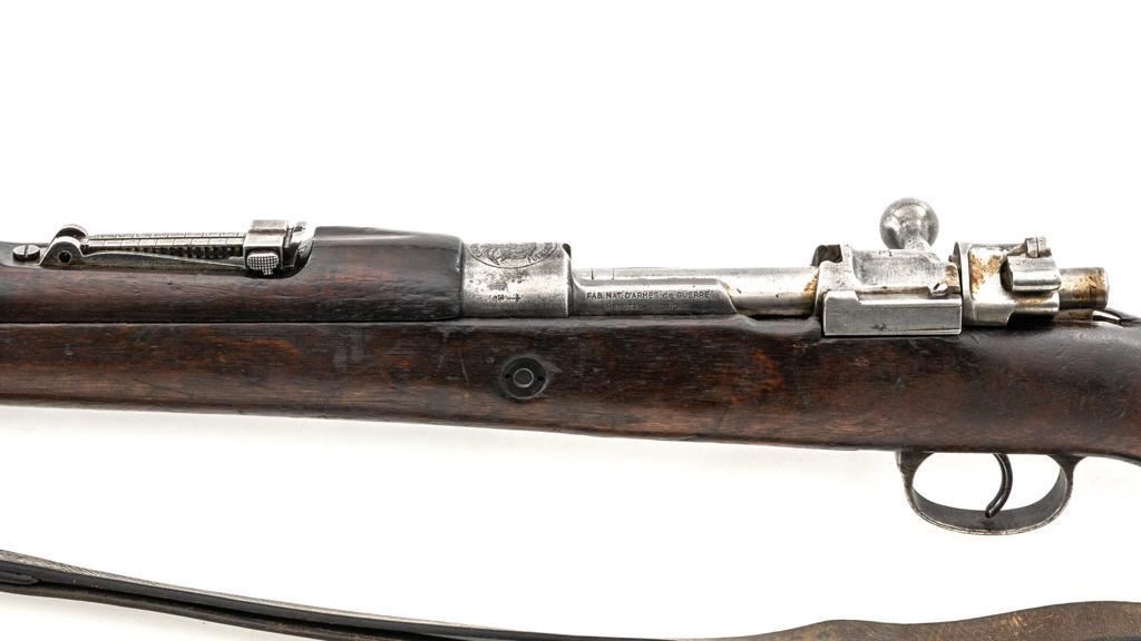 FN Columbian Model 1930 (Model 1950) Mauser Bolt Action Short Rifle, #05309, .30-06 cal., 23.5" barrel, blued finish, hardwood stock and handguard, dovetailed inverted-"V" front sight, and adjustable tangent rear sight with "V"-notched groove, graduated to 2000 meters. Includes a brown leather sling, in good used condition. No cleaning rod. Rifle was arsenal converted to .30-06 cal. and is marked ".30" on the rear receiver bridge. Front of the receiver has been relieved to accommodate the longer .30-06 cartridge. Top of the receiver ring is marked with the Columbian crest surrounded by "COLOMBIA FUERZAS MILITARES" and the left side receiver rail is marked "FAB.NAT.DARMES de GUERRE/HERSTAL-BELGIQUE". Matching numbered bolt. There is no number stamped on the stock as it is probably a contemporary replacement. No visible import marks. Condition overall is good, almost all of the bluing has worn or been cleaned from the metal, and most parts show toning, and patina. There are dents to the toe of the buttplate. Wood is good with general marks to the dark finish. Action operates smoothly. Bore is bright with very good rifling. Est.: $300-$500. (C&R)