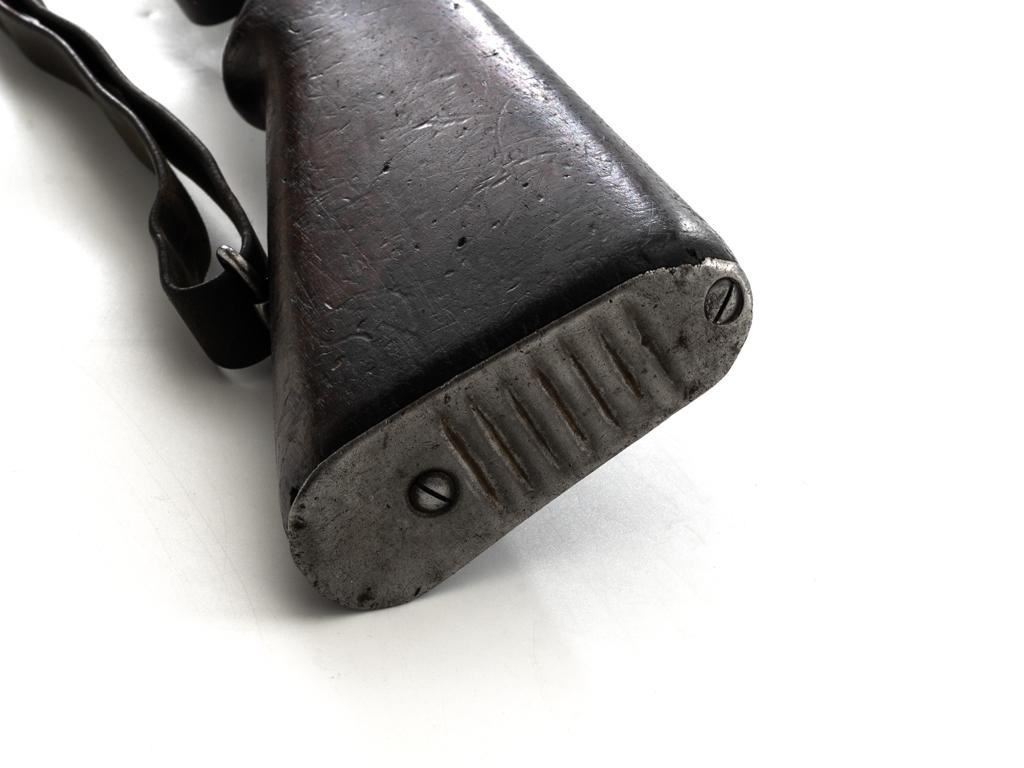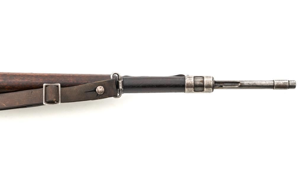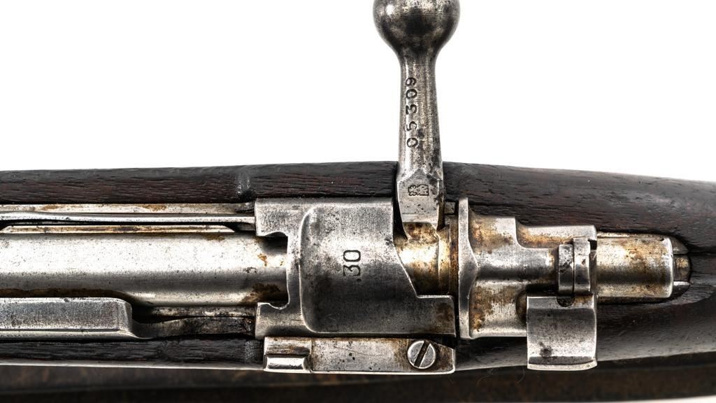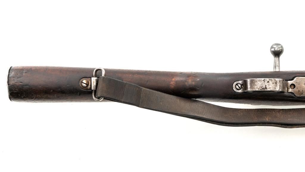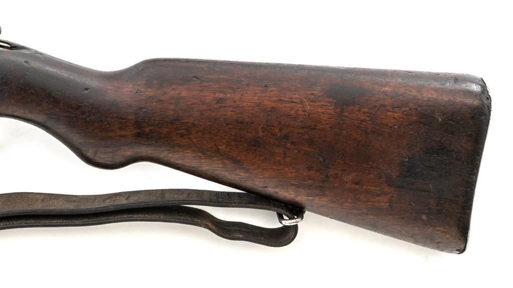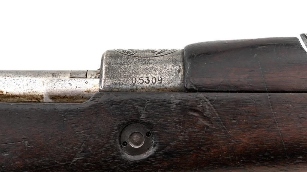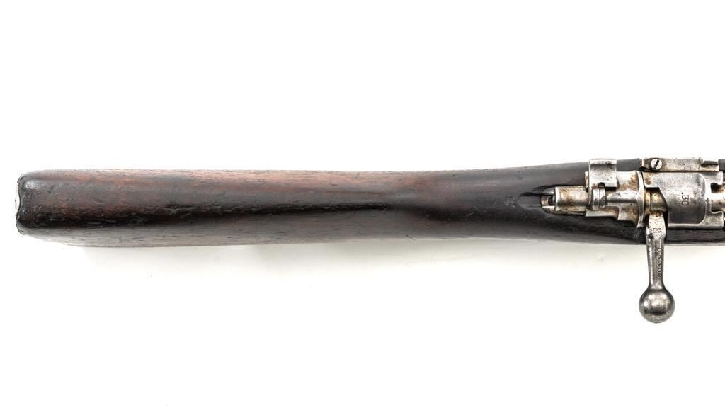 FN Columbian Model 1930 (Model 1950) Mauser Bolt Action Short Rifle, #05309, .30-06 cal., 23.5" barrel, blued finish, hardwood stock and handguard, dovetailed inverted-"V" front sight, and adjustable tangent rear sight with "V"-notched groove, graduated to 2000 meters. Includes a brown leather sling, in good used condition. No cleaning rod. Rifle was arsenal converted to .30-06 cal. and is marked ".30" on the rear receiver bridge. Front of the receiver has been relieved to accommodate the longer .30-06 cartridge. Top of the receiver ring is marked with the Columbian crest surrounded by "COLOMBIA FUERZAS MILITARES" and the left side receiver rail is marked "FAB.NAT.DARMES de GUERRE/HERSTAL-BELGIQUE". Matching numbered bolt. There is no number stamped on the stock as it is probably a contemporary replacement. No visible import marks. Condition overall is good, almost all of the bluing has worn or been cleaned from the metal, and most parts show toning, and patina. There are dents to the toe of the buttplate. Wood is good with general marks to the dark finish. Action operates smoothly. Bore is bright with very good rifling. Est.: $300-$500. (C&R)