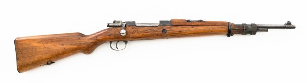 FN Venezuelan Contract Model 1930 Mauser Bolt Action Carbine, #021517, 7x57mm cal., 17.5" barrel, blued finish with bright bolt assembly, hardwood stock and handguard, dovetailed inverted-"V" front sight, and adjustable tangent rear sight with "V"-notched groove, graduated to 1400 meters. Missing the cleaning rod and locking screw forward of the magazine floorplate. Top of the receiver ring is marked with Venezuelan crest and "FUERZAS ARMADAS/DE VENEZUELA" on the left side. Left side of the receiver rail is marked "FAB.NAT.DARMES de GUERRE/HERSTAL BELGIQUE. No number on the bolt handle. Other parts do not match. No visible import marks. Condition overall is good, retaining less than 40% blue, showing general wear and of patina across the metal surfaces. Bolt assembly has toned darker with patina to the handle. Stock appears to be an arsenal replacement and is in good condition, with handling marks and flaking to the finish. A sighting groove has been carved into the top of the handguard. Action operates smoothly. Bore is bright with very good rifling. Est.: $400-$600. (C&R)