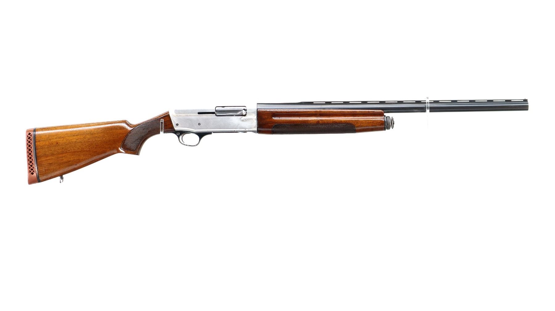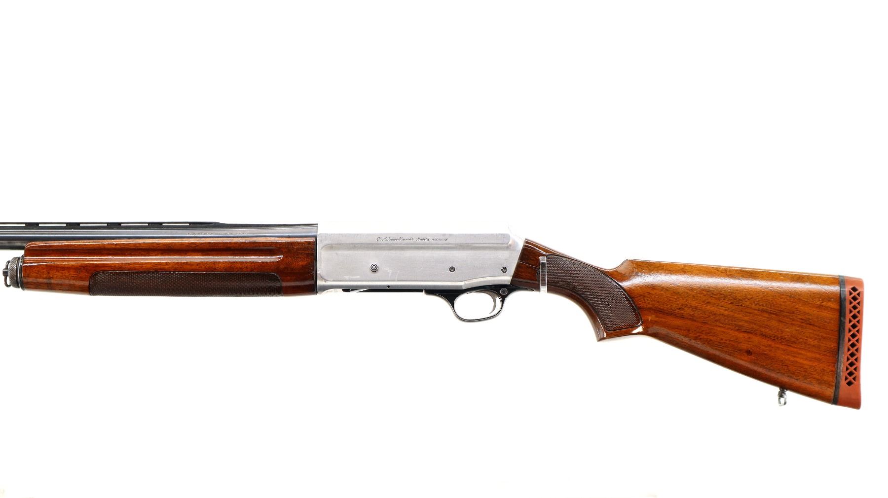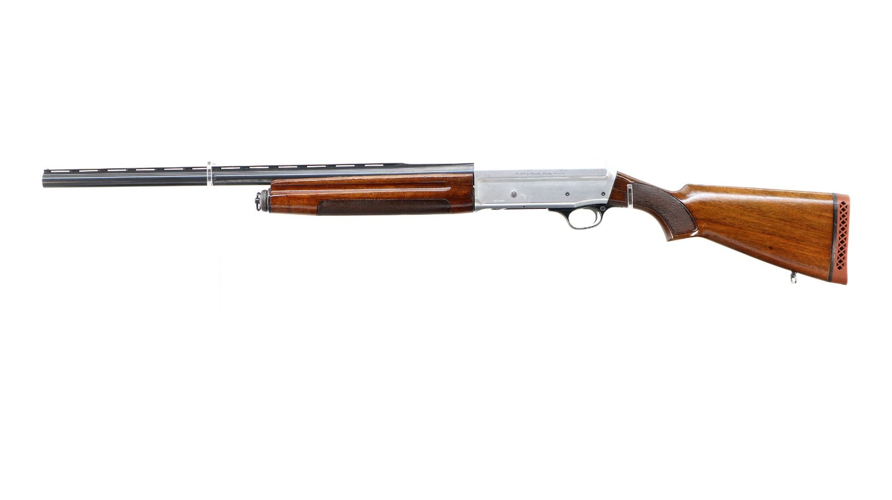 Main Description: Silver bead, blued vent rib barrel, silver alloy receiver welded on the right side. Two piece wood stocks, finger grooved checkered forearm and pistol grip, red vented rubber recoil pad, swivel studs.
