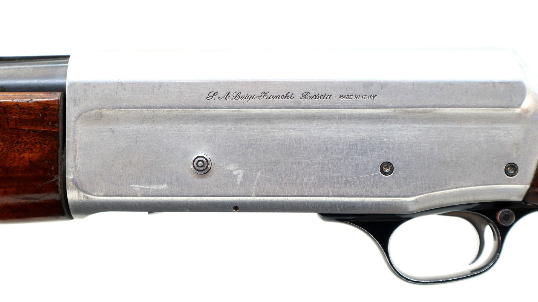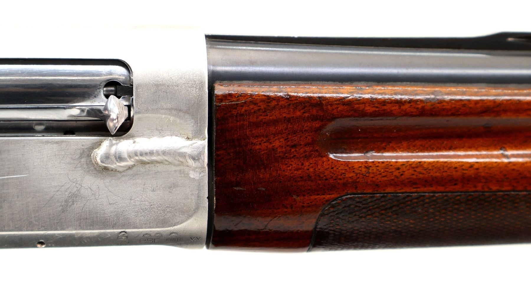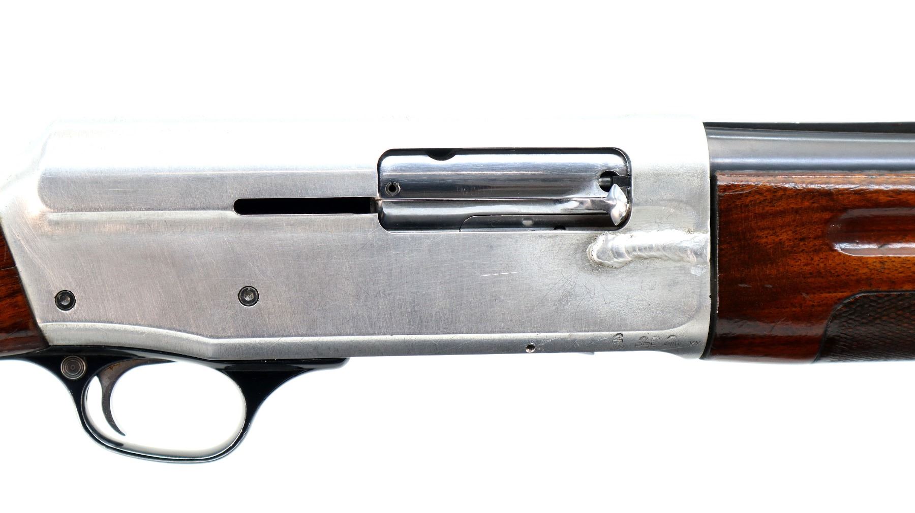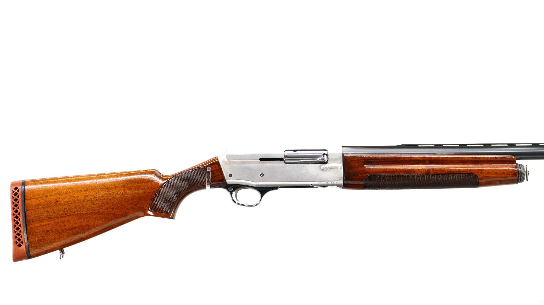 Main Description: Silver bead, blued vent rib barrel, silver alloy receiver welded on the right side. Two piece wood stocks, finger grooved checkered forearm and pistol grip, red vented rubber recoil pad, swivel studs.