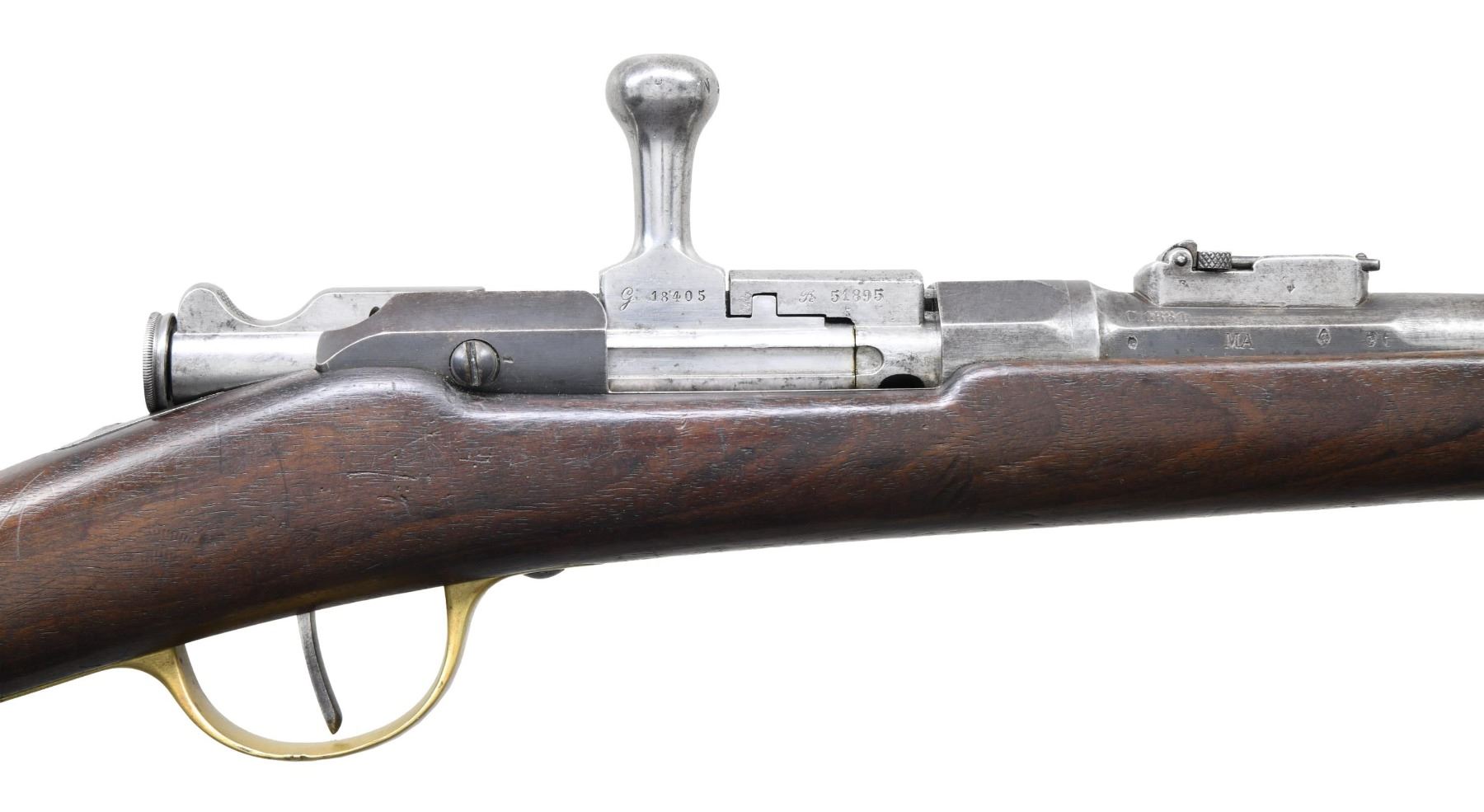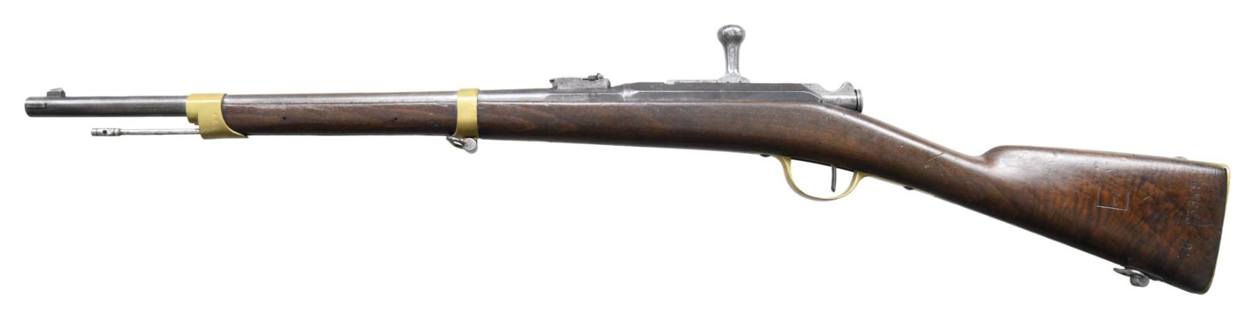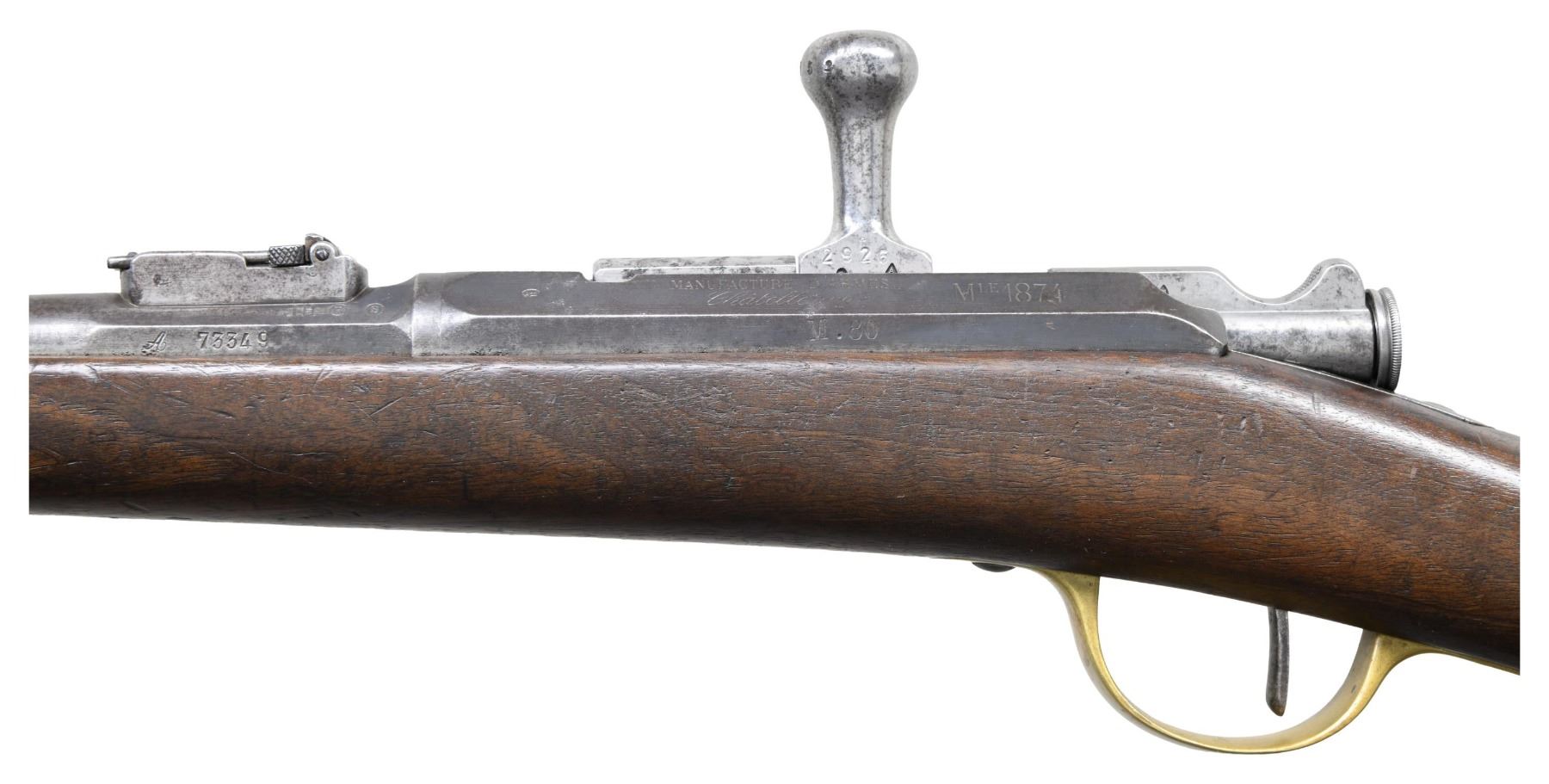 Cal. 11mm Gras. S# A73349. Bbl. 20". Blade front sight. Ladder rear sight graduated to 1100m. Matching numbers on bbl., left side of butt & bayonet lug. Mismatched straight bolt. Model 1874 Artillery Musketoon Gras. Right side of bbl. has 1881 date. Left side of receiver has Chatellerault, Mle 1874 & M80 markings. Blued finish. Walnut stock set with bottom mounted sling swivels & brass furniture. Right side of butt has faint French roundel & left side has a carved "E". Replacement ramrod present. CONDITION: stock set has arsenal type finish with scattered dings, scratches & handling marks. Brass parts are a yellow patina with scattered oxidation & dings. Blued parts are turning gray with strong amounts of arsenal finish & light oxidation. Action functions properly when hand cycled. Bore is bright with strong rifling & some light pitting. (01-27194/MJC). ANTIQUE. $300-500.