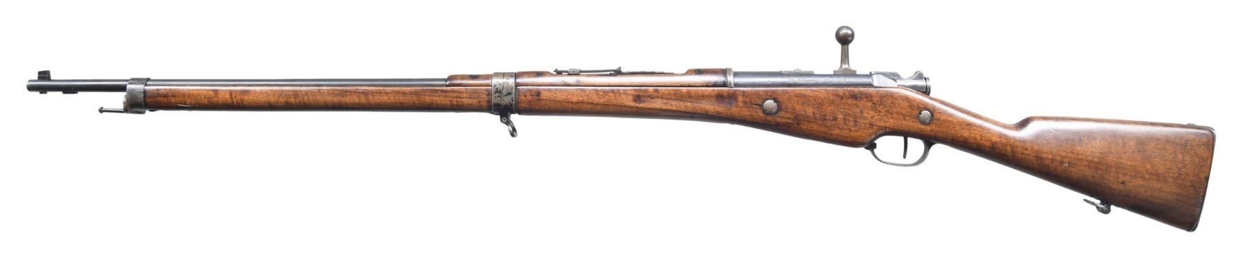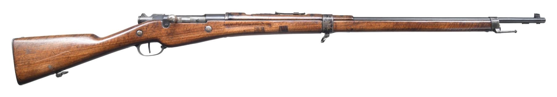 MILITARY RIFLE. Cal. 8mm Lebel. S# FG54026. Non-matching numbers throughout. Bbl. 31 1/2". Ladder rear sight graduated to 2,400 meters. Thick blade front sight. Receiver is marked on left side "ST. ETIENNE MLE M 16" in script. Straight bolt handle. Rifle has the older three rd. magazine open at the bottom. Walnut stock & handguard. Stacking rod is present. CONDITION: stock has arsenal rework type finish resulting in softening of edges. Features wear & handling marks. Two small dovetailed repairs on right side of forend. Metal retains 75% arsenal rework blue finish w/ wear & handling marks. Fair worn bore turning dark. (25-2215/RW). CURIO. $200-400.