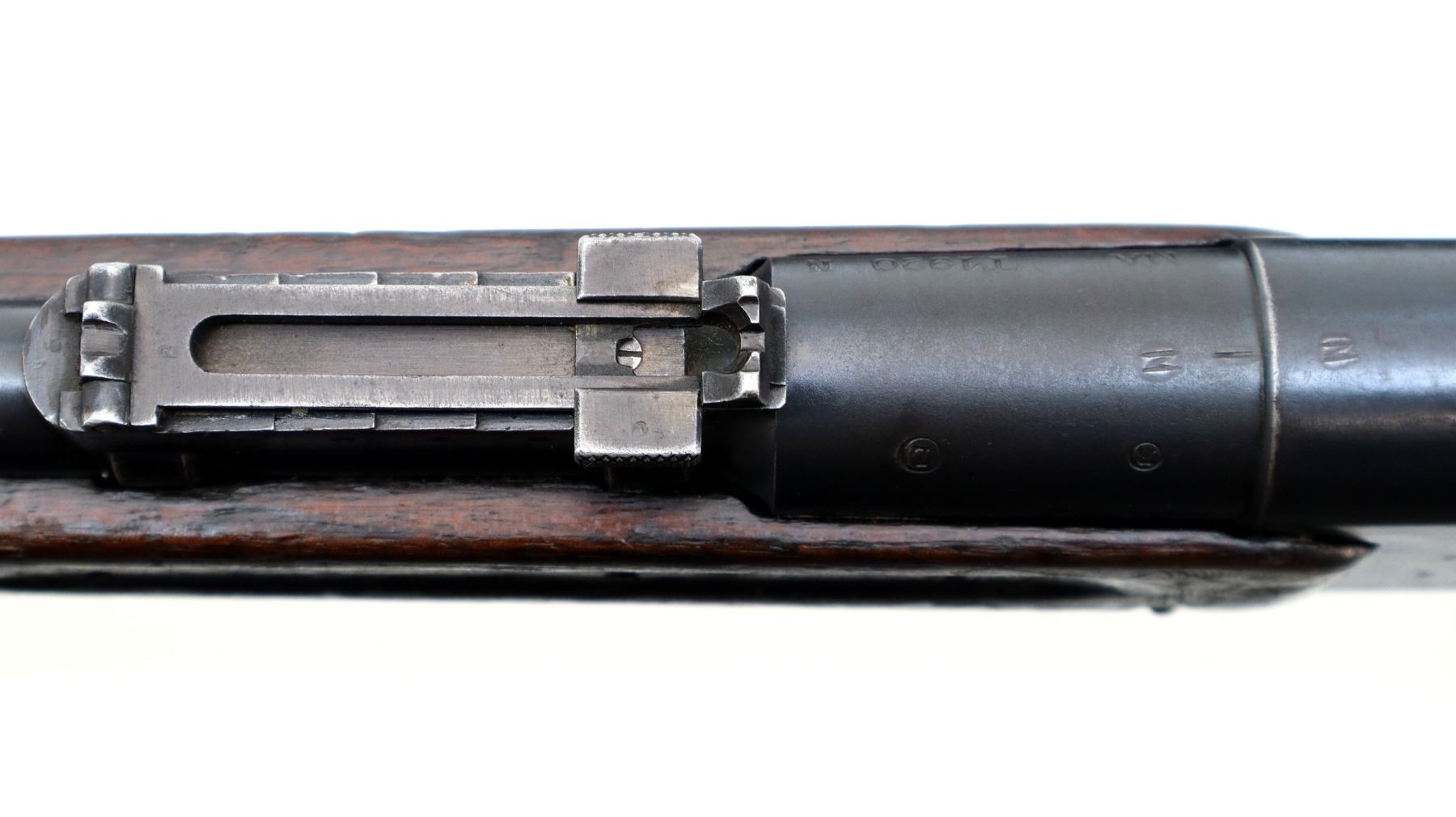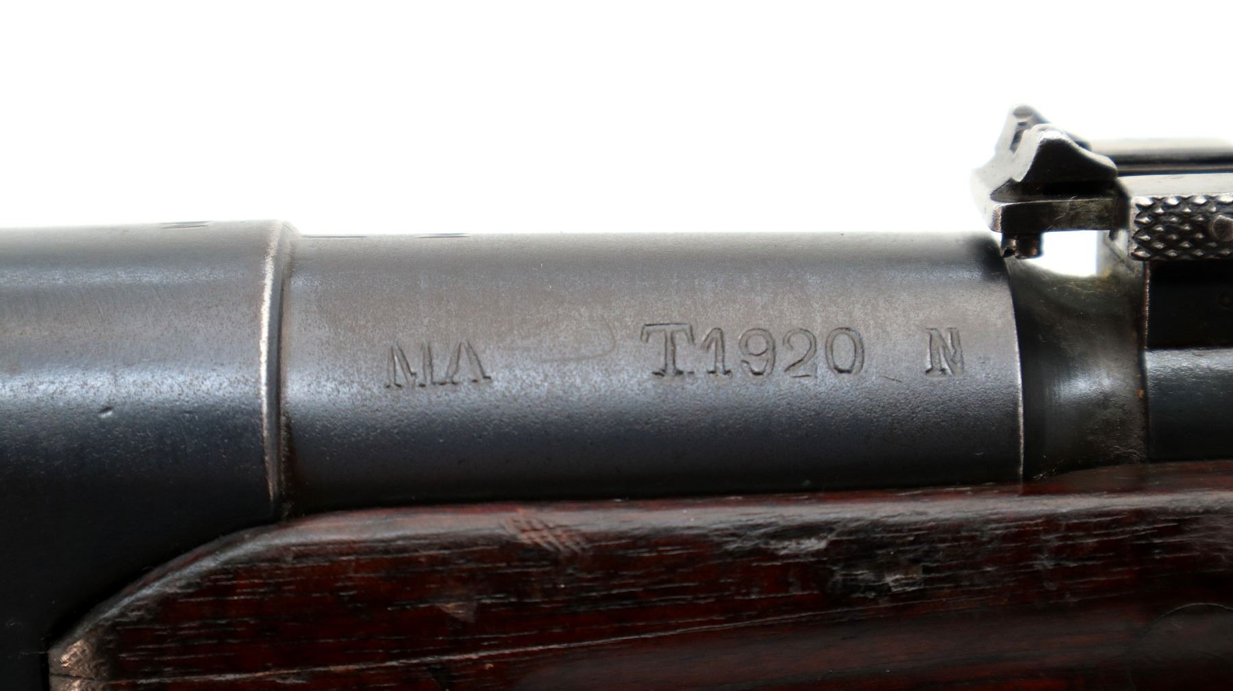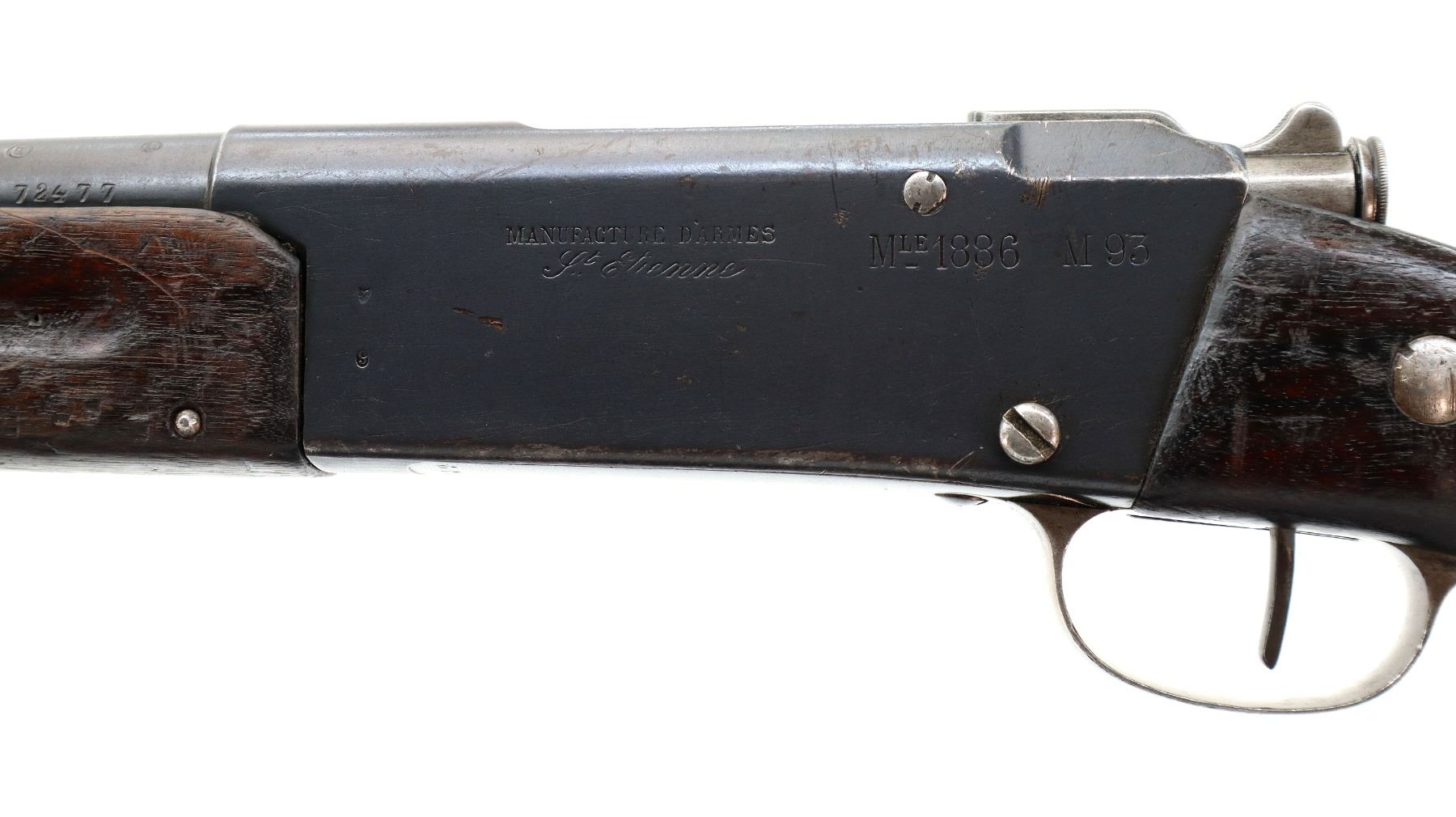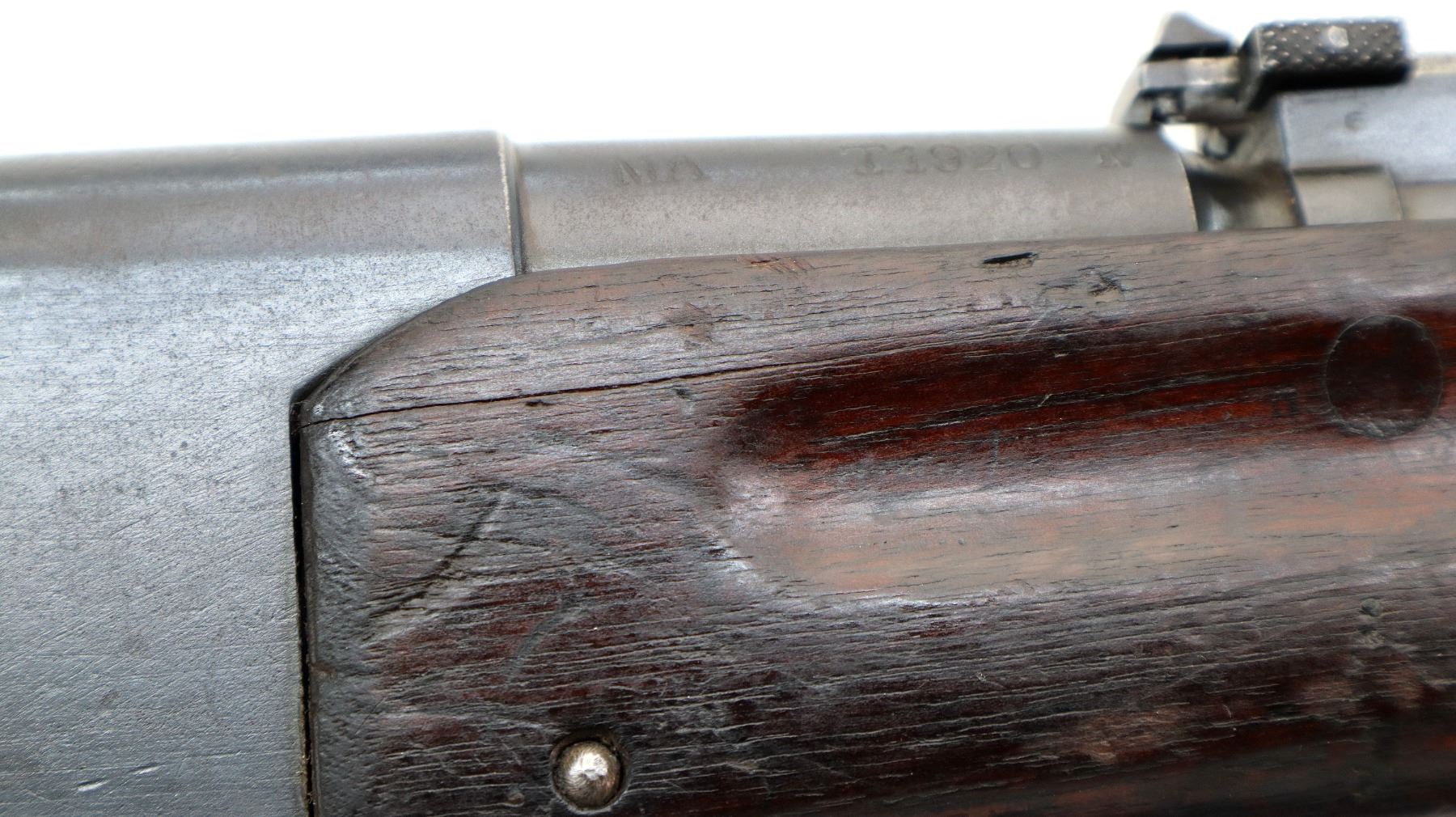 Main Description: Manufactured by St Etienne 1920, visible serial numbers match. Block front sight with groove, adjustable u notched rear sight, blued finish, straight bolt handle with large knob. Two piece full military wood stocks, finger grooved forearm cracked in front of receiver, arsenal repair around middle band. Straight grip, smooth steel butt plate, sling swivels, stacking hook, bayonet lug