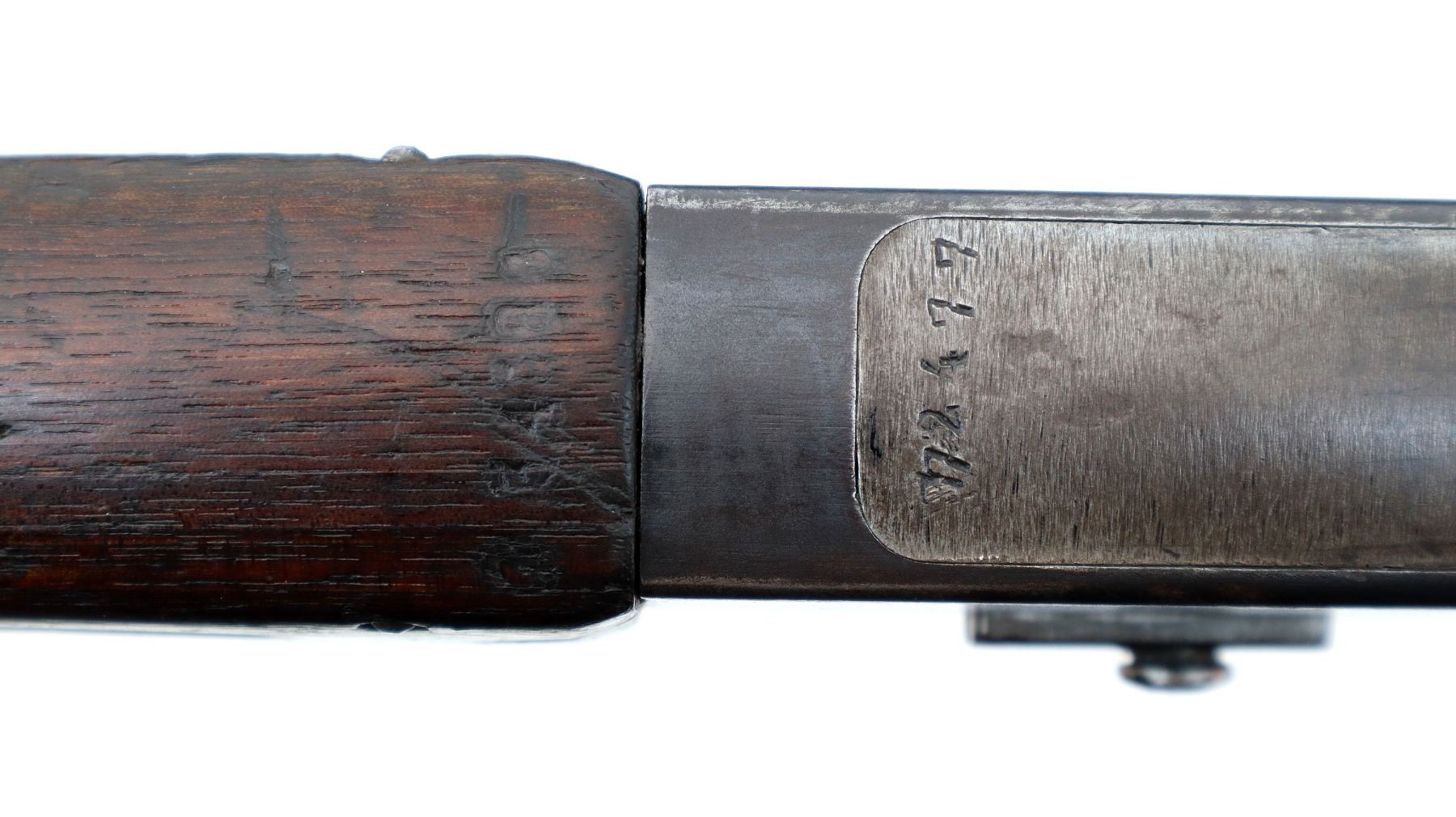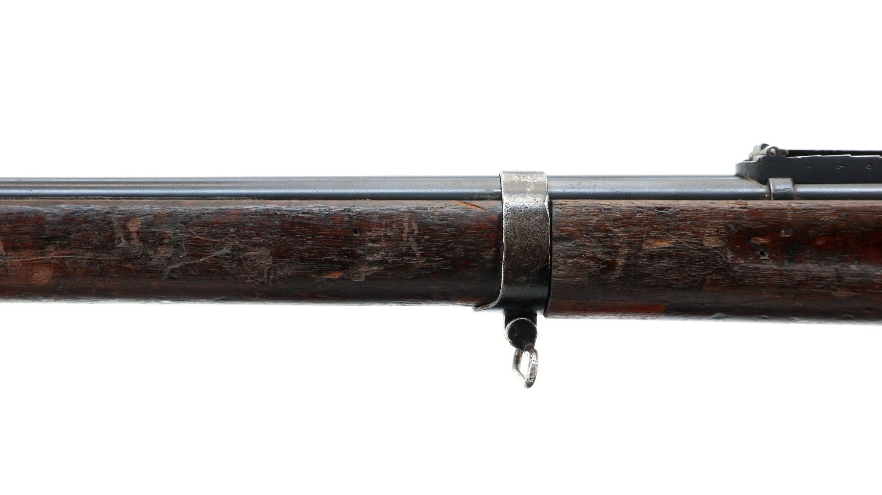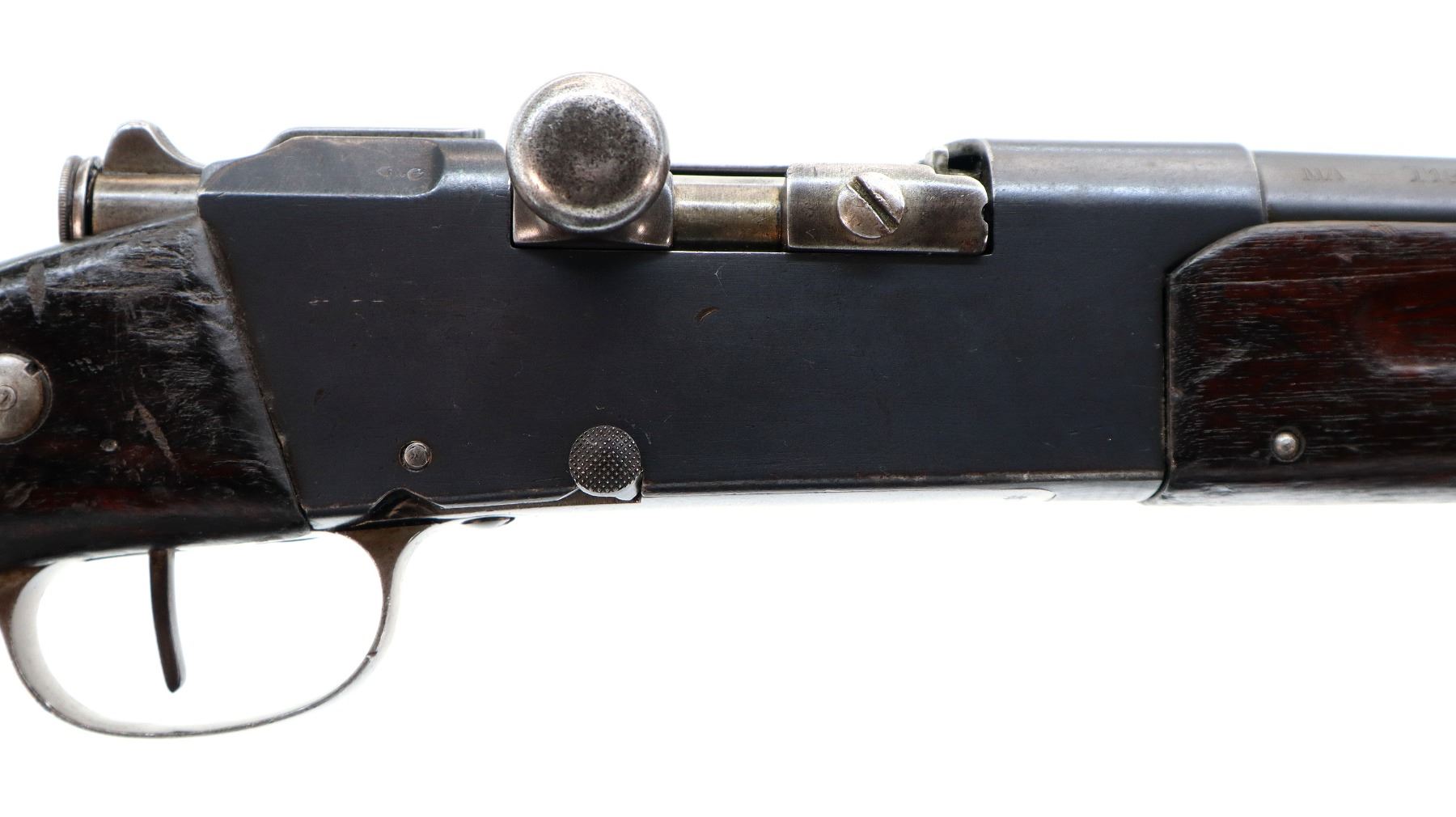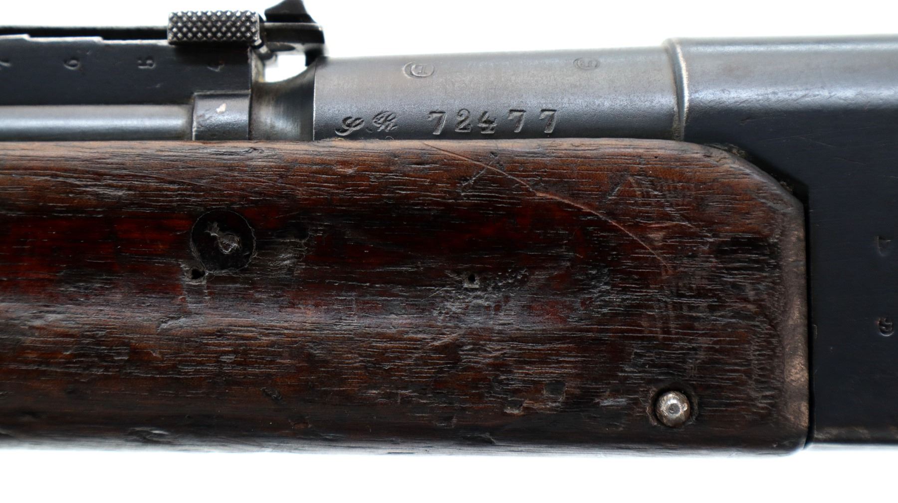 Main Description: Manufactured by St Etienne 1920, visible serial numbers match. Block front sight with groove, adjustable u notched rear sight, blued finish, straight bolt handle with large knob. Two piece full military wood stocks, finger grooved forearm cracked in front of receiver, arsenal repair around middle band. Straight grip, smooth steel butt plate, sling swivels, stacking hook, bayonet lug