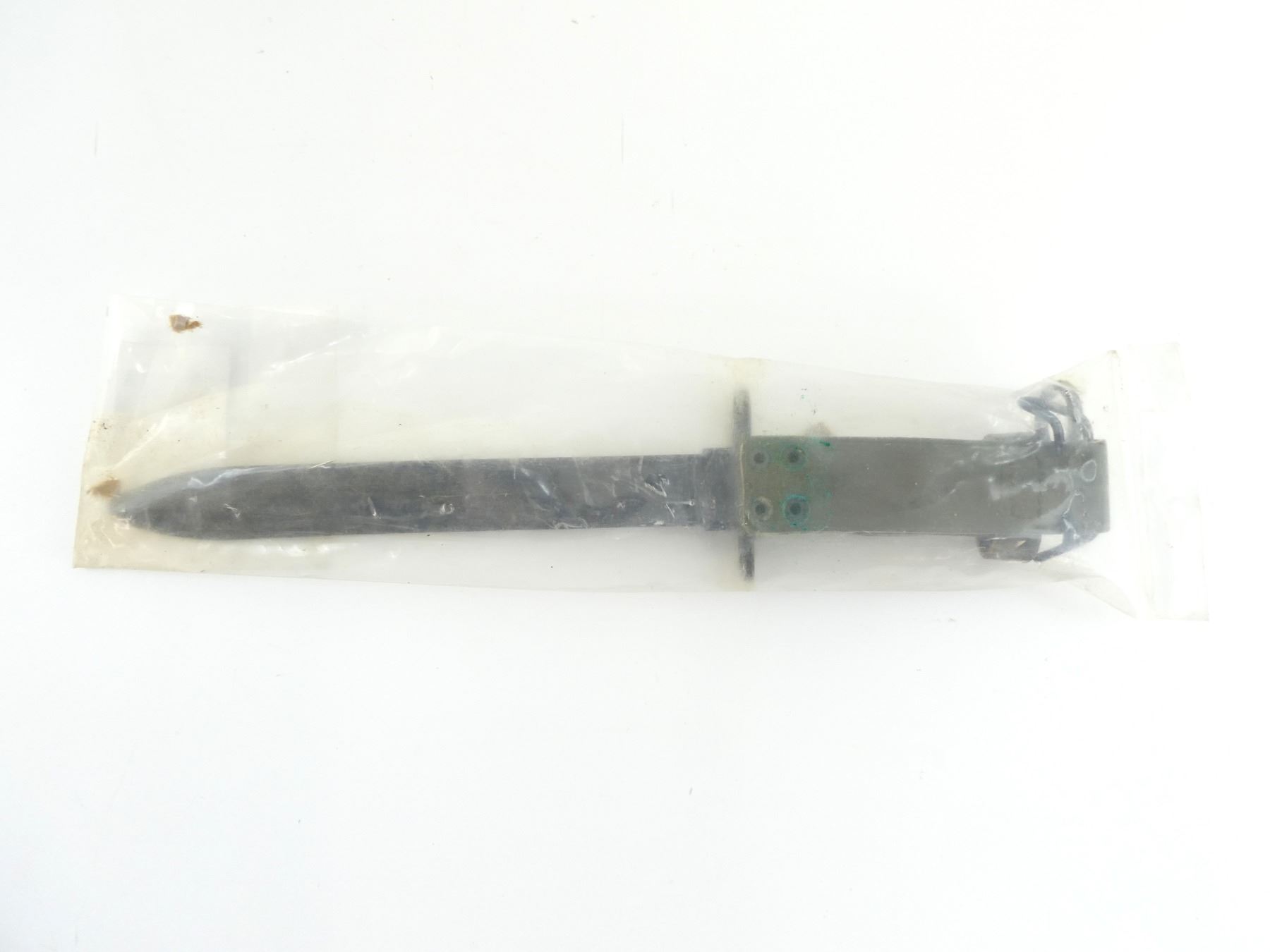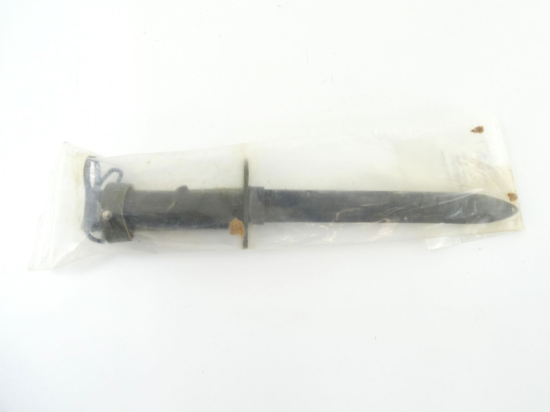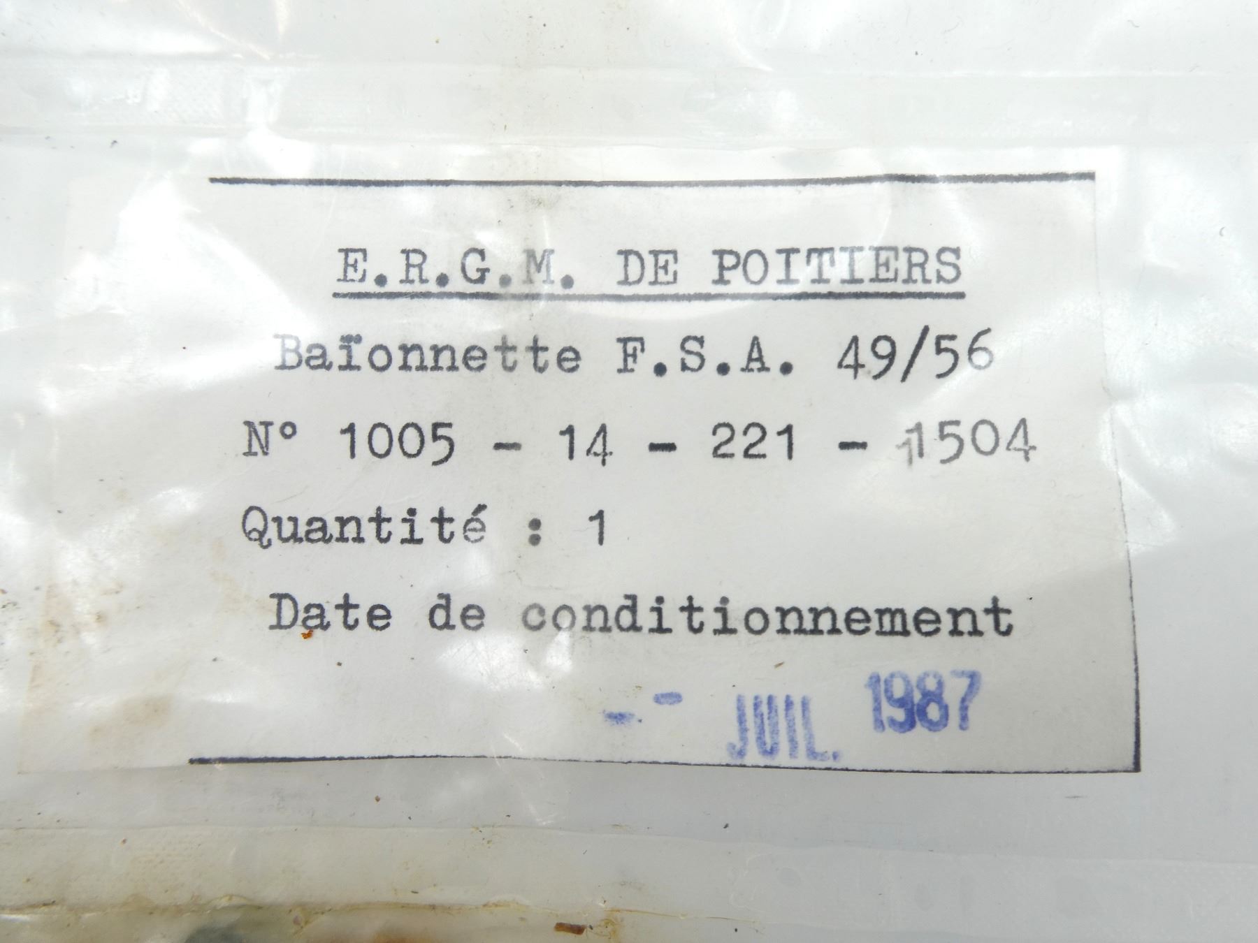 (1) FITS 7.5MM M1949/56 SELF-LOADING RIFLES, NEW OLD STOCK, IN ORIGINAL UN-OPENED PACKAGING, LABEL MARKED: "E.R.G.M. DE POITIERS, BAIONNETTE F.S.A. 49/56, NO 1005-14-221-1504, QUANTITE: 1, DATE DE CONDITIONNEMENT JULY 1987", SCABBARD MARKED: "MAT" OVER "F", OVERALL LENGTH APPROX. 14". SEE PHOTOS.
