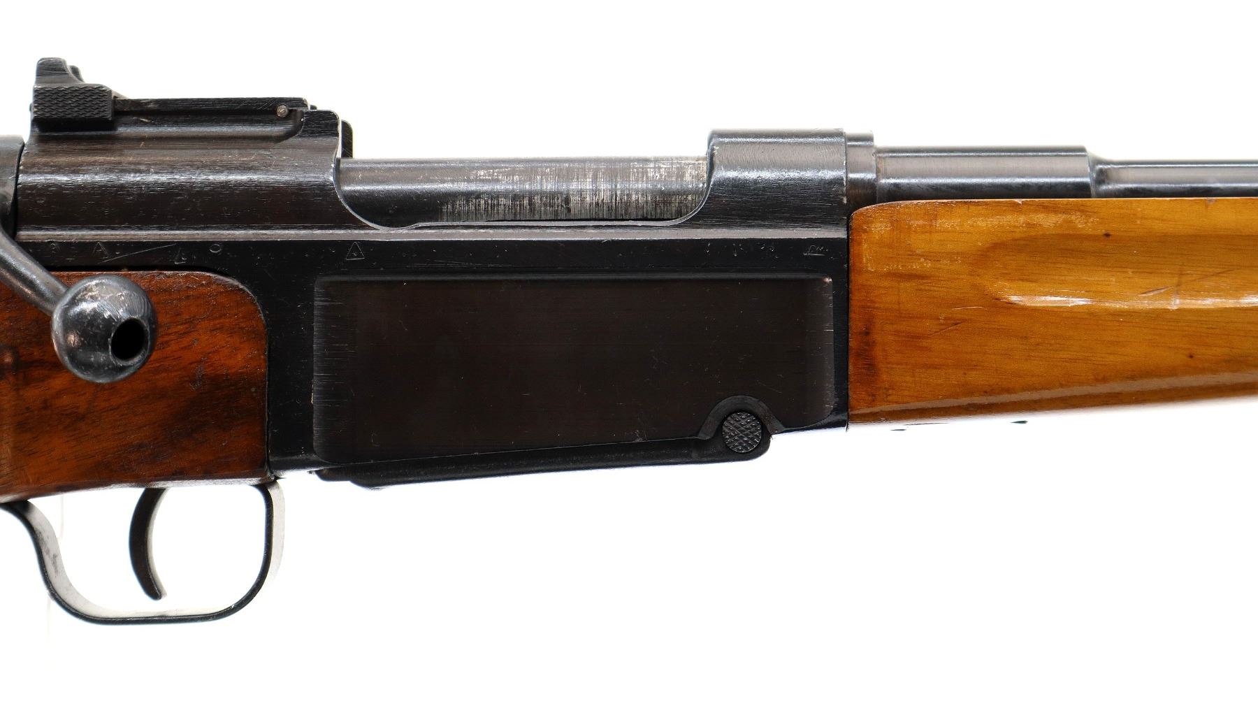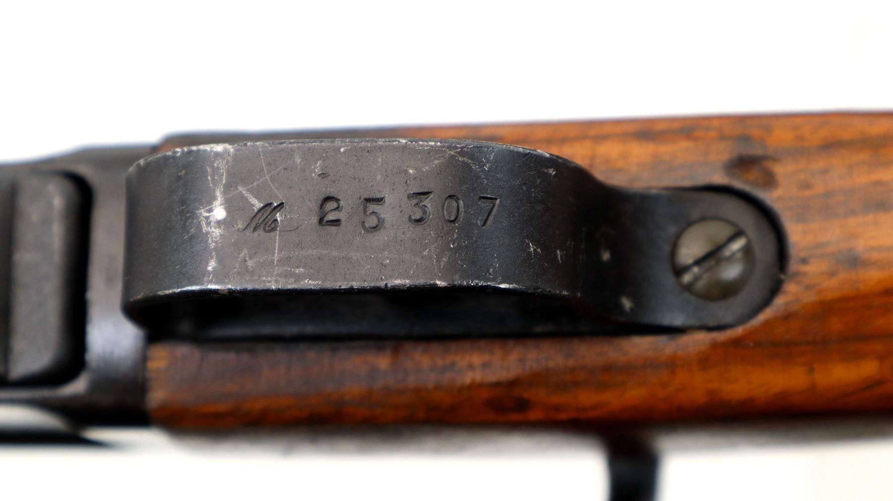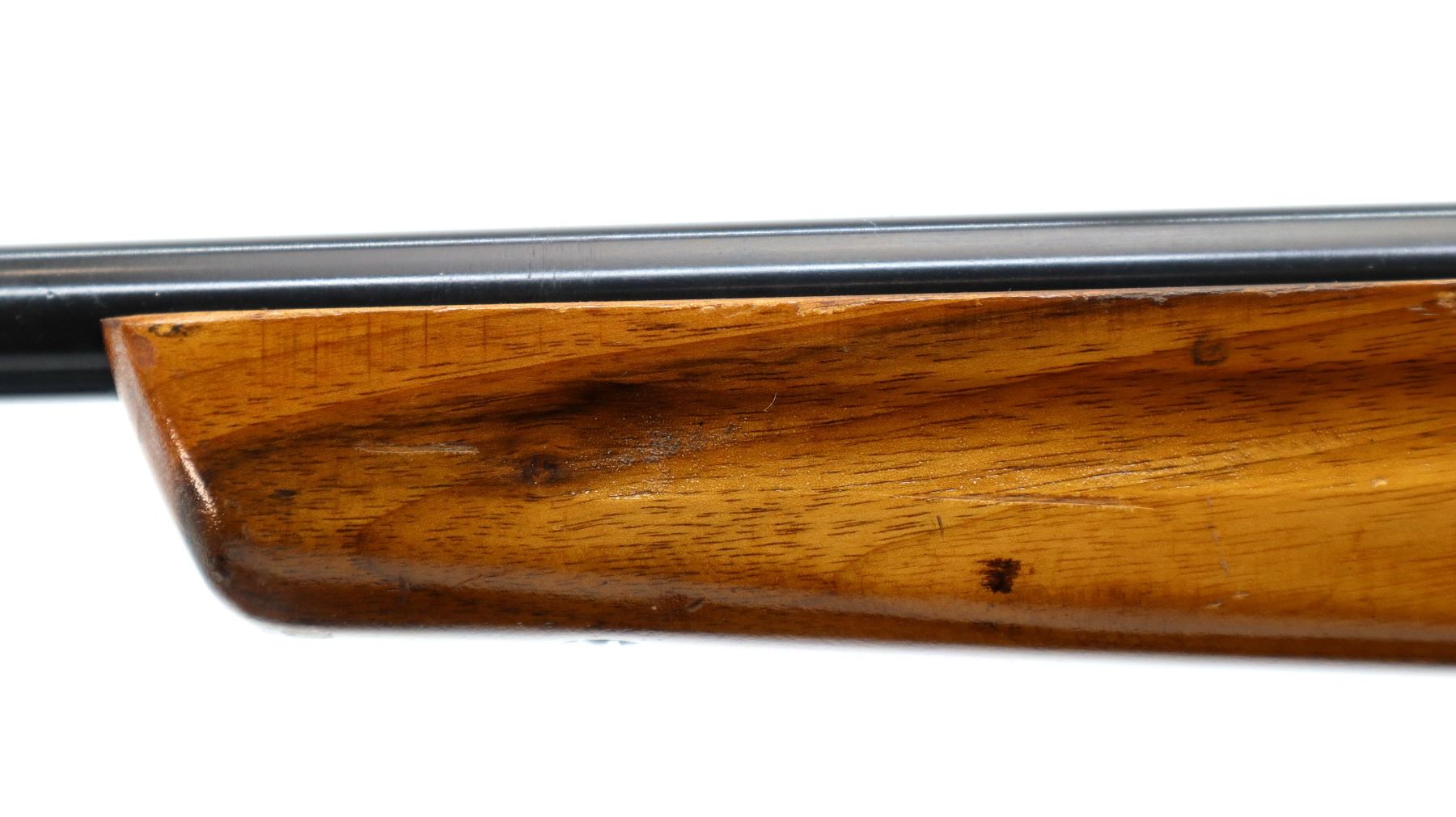 Main Description: Blade front sight with ramp, adjustable rear peep sight, blued finish, receiver has sliding safety on left side. Two piece sporterizeod wood stocks, finger grooved forearm, pistol grip, smooth steel butt plate, rear sling swivel only.
