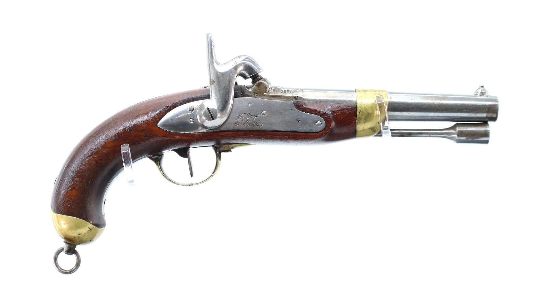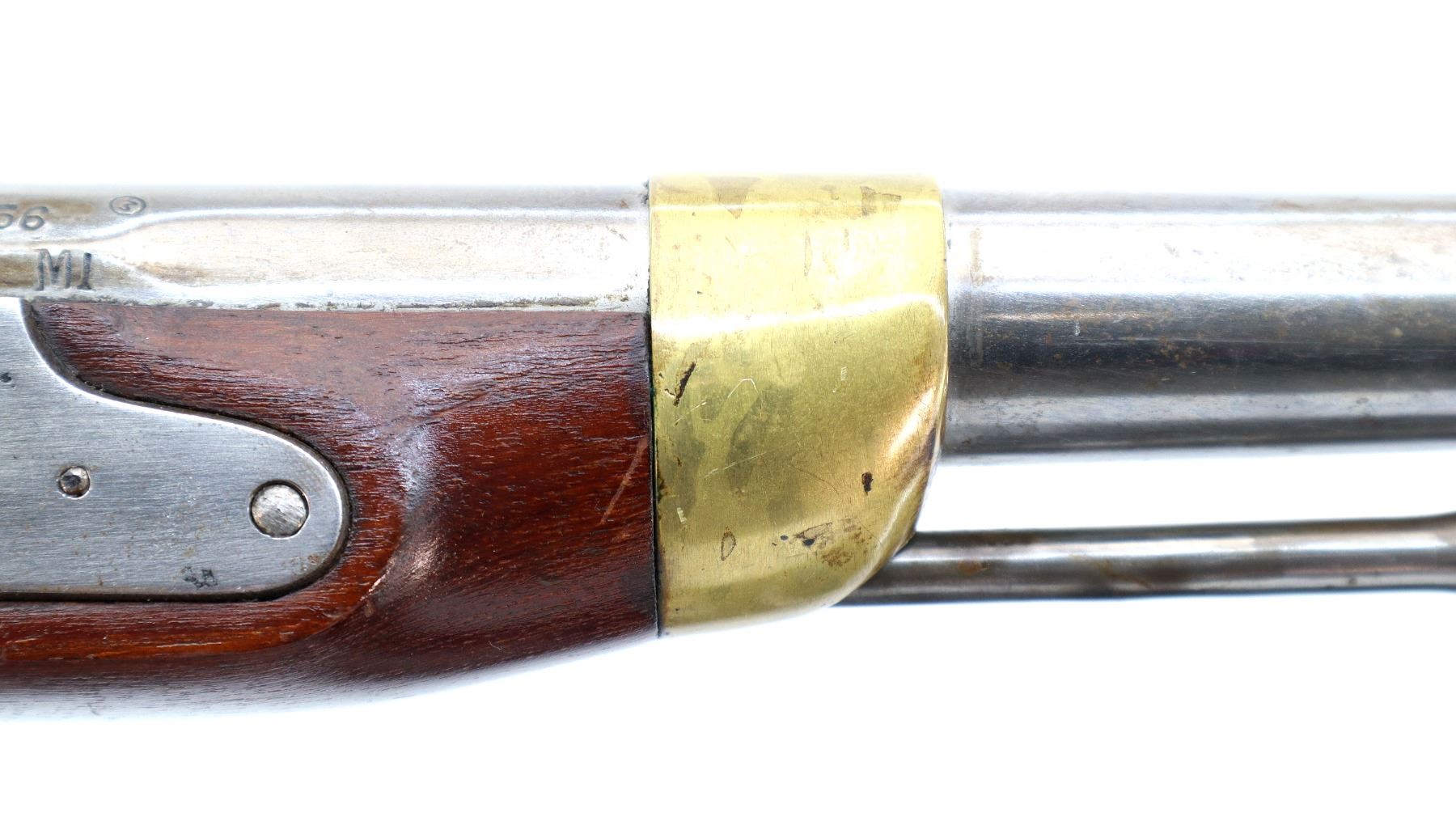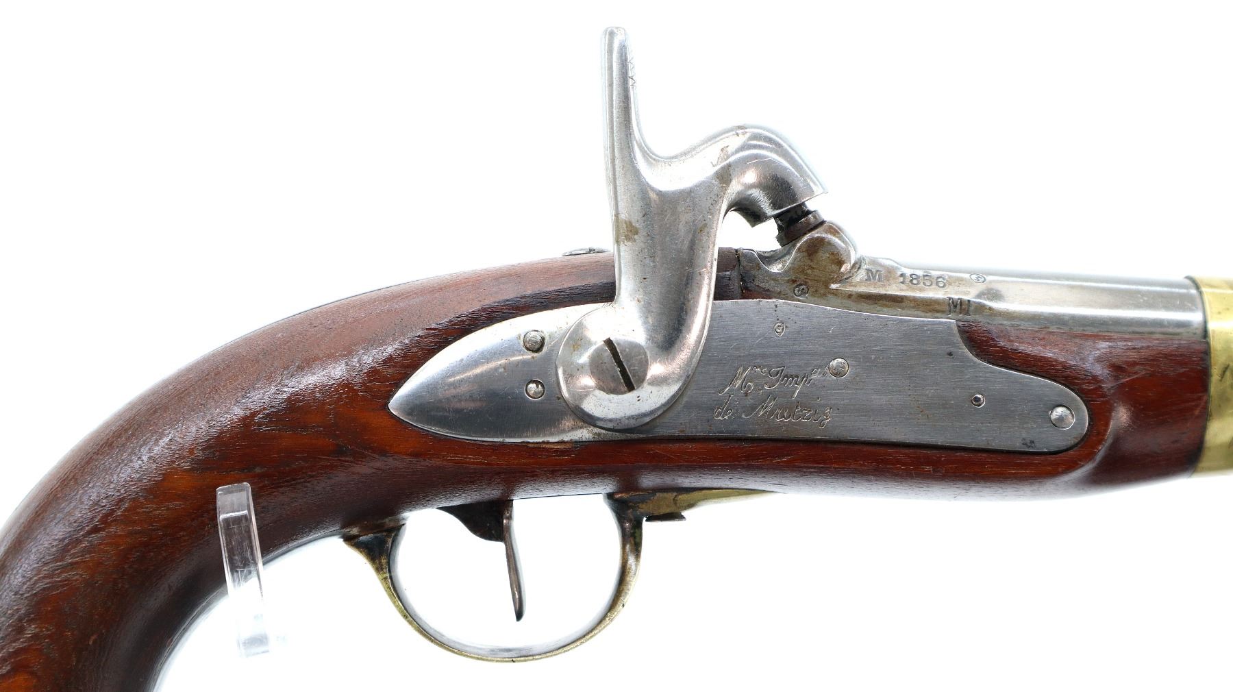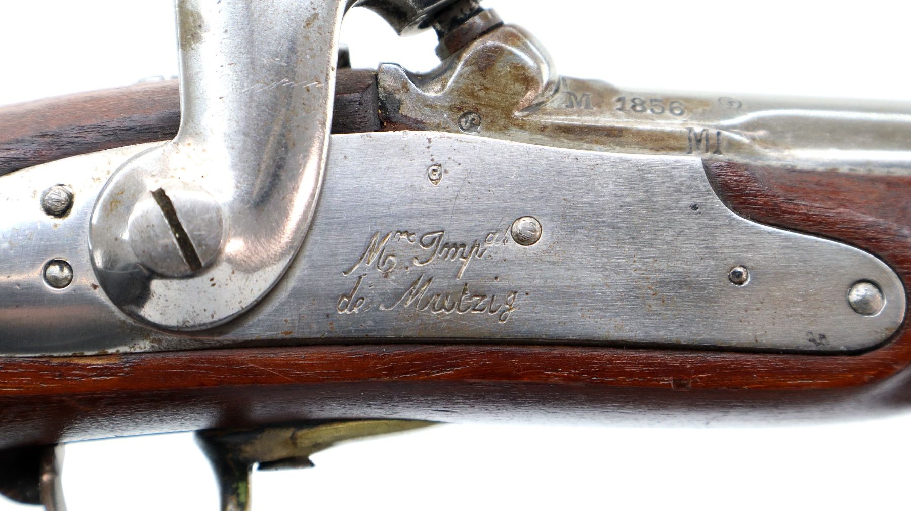 Main Description: Manufactured by IMP De Mutzig 1856. Bead front sight, fixed u notched rear sight, tapered round barrel, smooth lock with checkered spur hammer that functions, nipple is intact. One piece wood grip, brass pommel cap with lanyard ring, brass trigger guard and nose cap, steel ramrod.