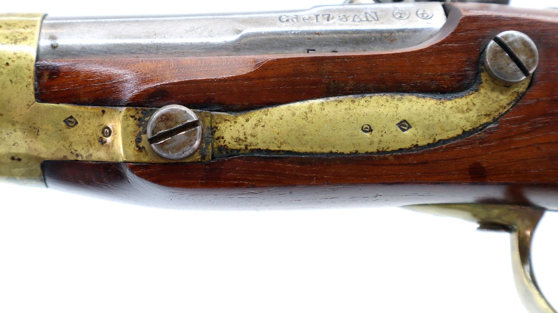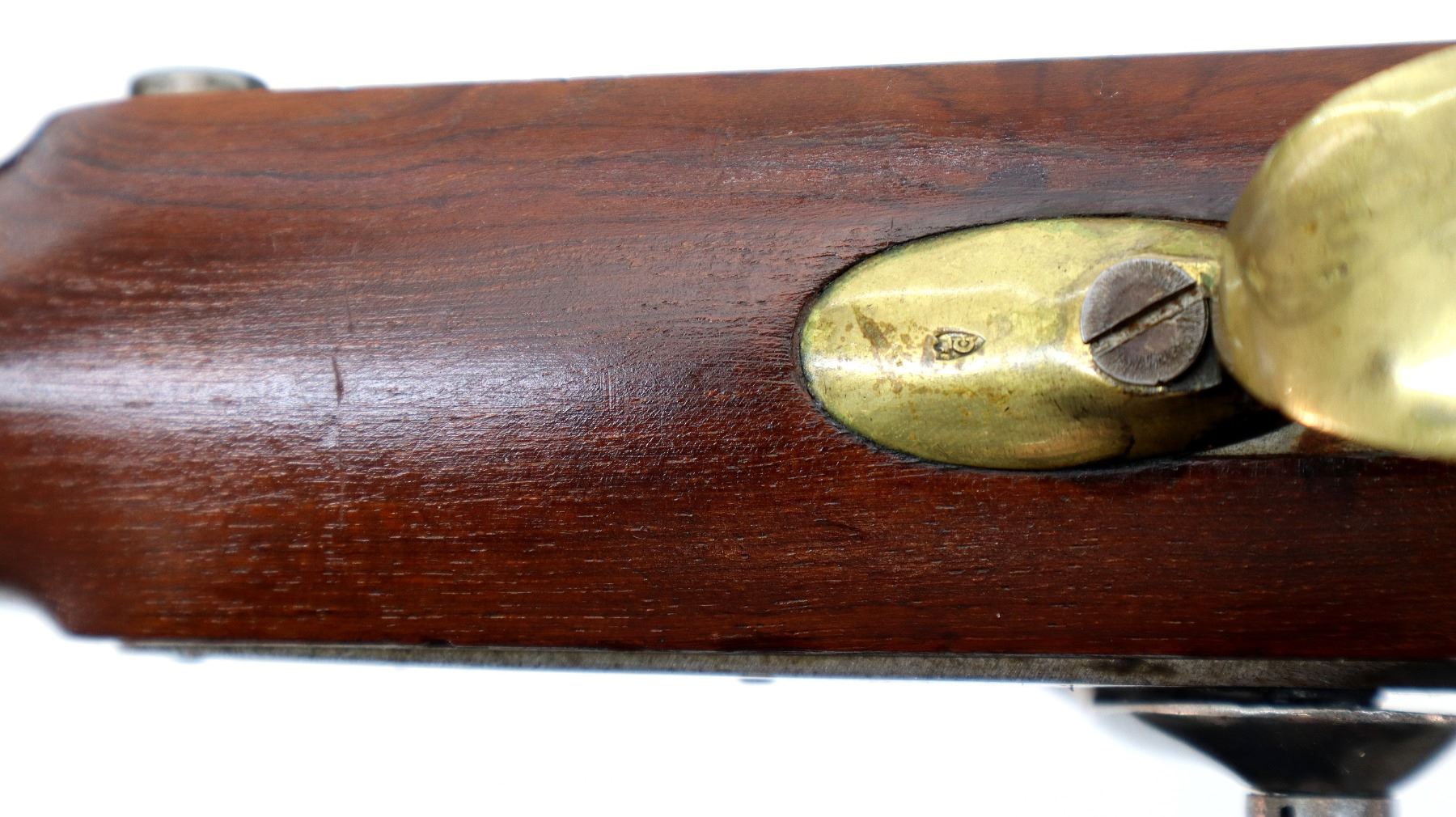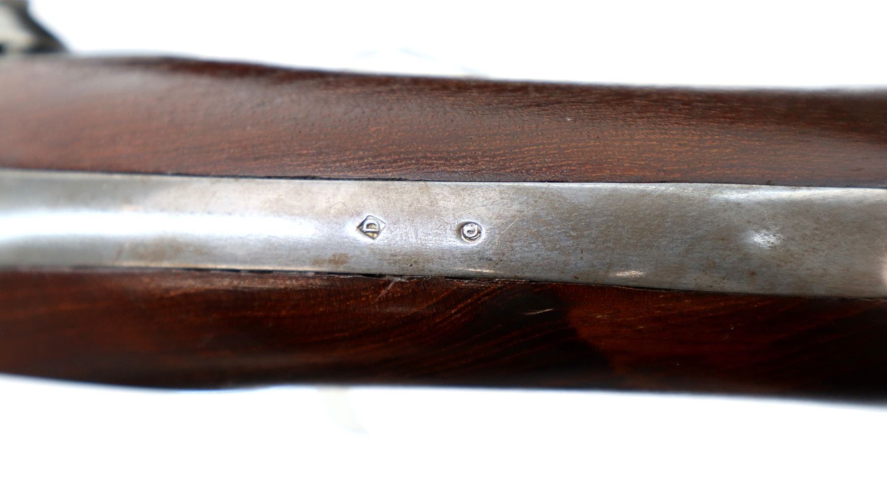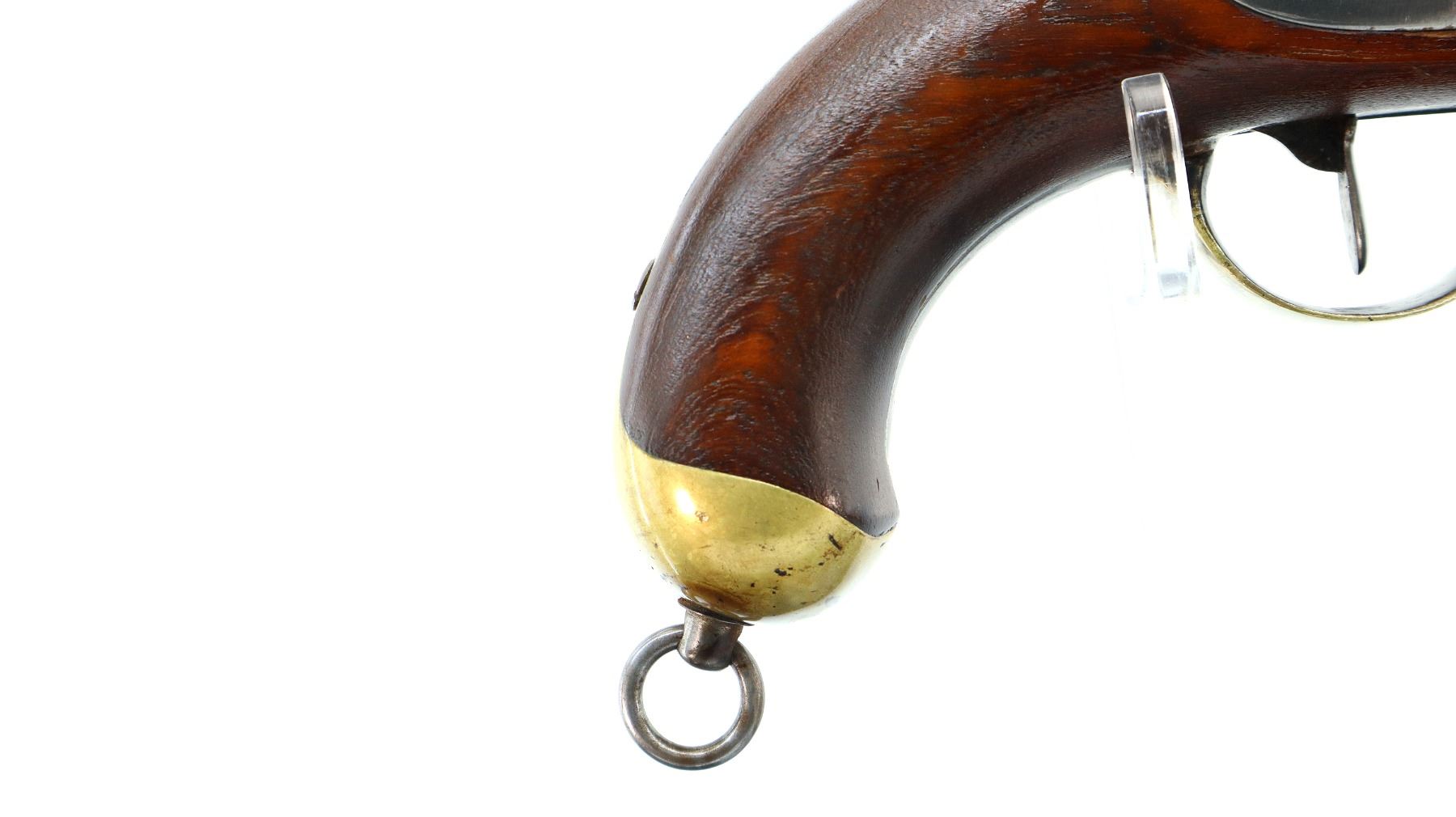 Main Description: Manufactured by IMP De Mutzig 1856. Bead front sight, fixed u notched rear sight, tapered round barrel, smooth lock with checkered spur hammer that functions, nipple is intact. One piece wood grip, brass pommel cap with lanyard ring, brass trigger guard and nose cap, steel ramrod.