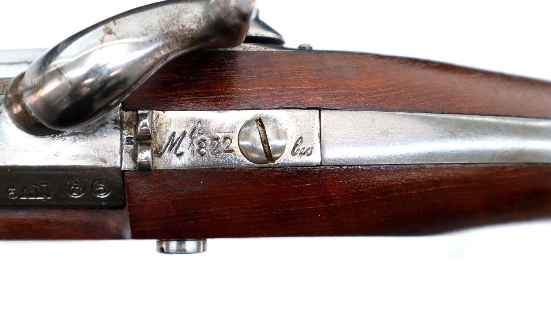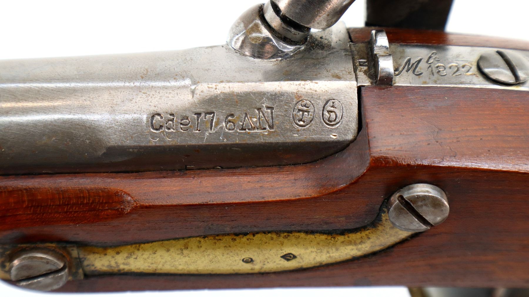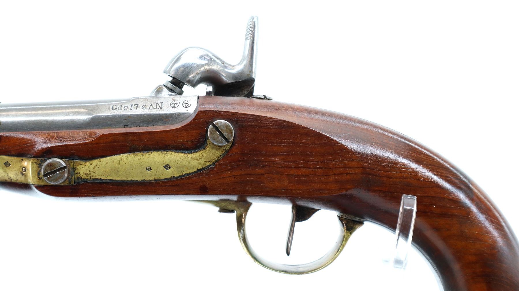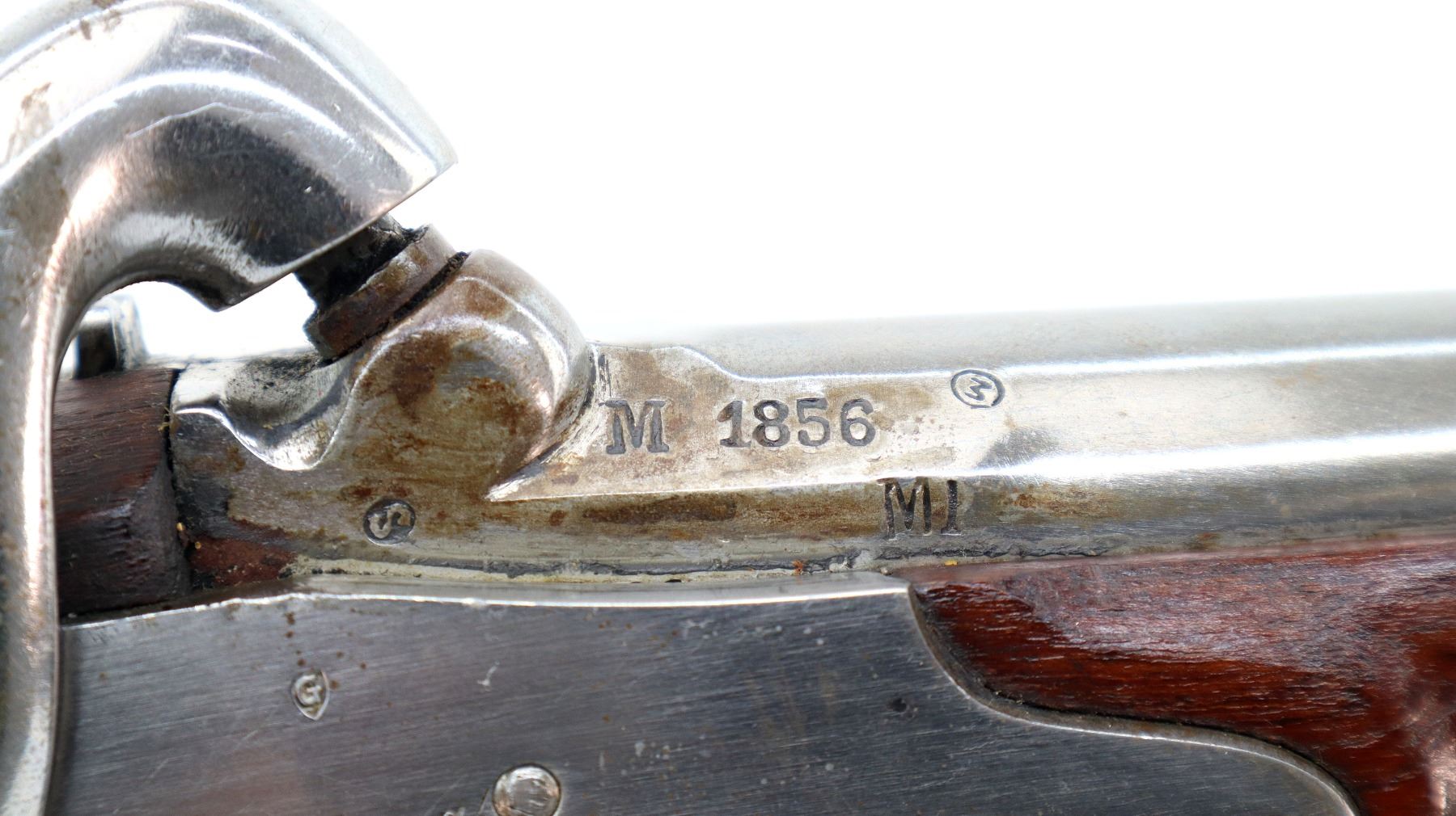 Main Description: Manufactured by IMP De Mutzig 1856. Bead front sight, fixed u notched rear sight, tapered round barrel, smooth lock with checkered spur hammer that functions, nipple is intact. One piece wood grip, brass pommel cap with lanyard ring, brass trigger guard and nose cap, steel ramrod.