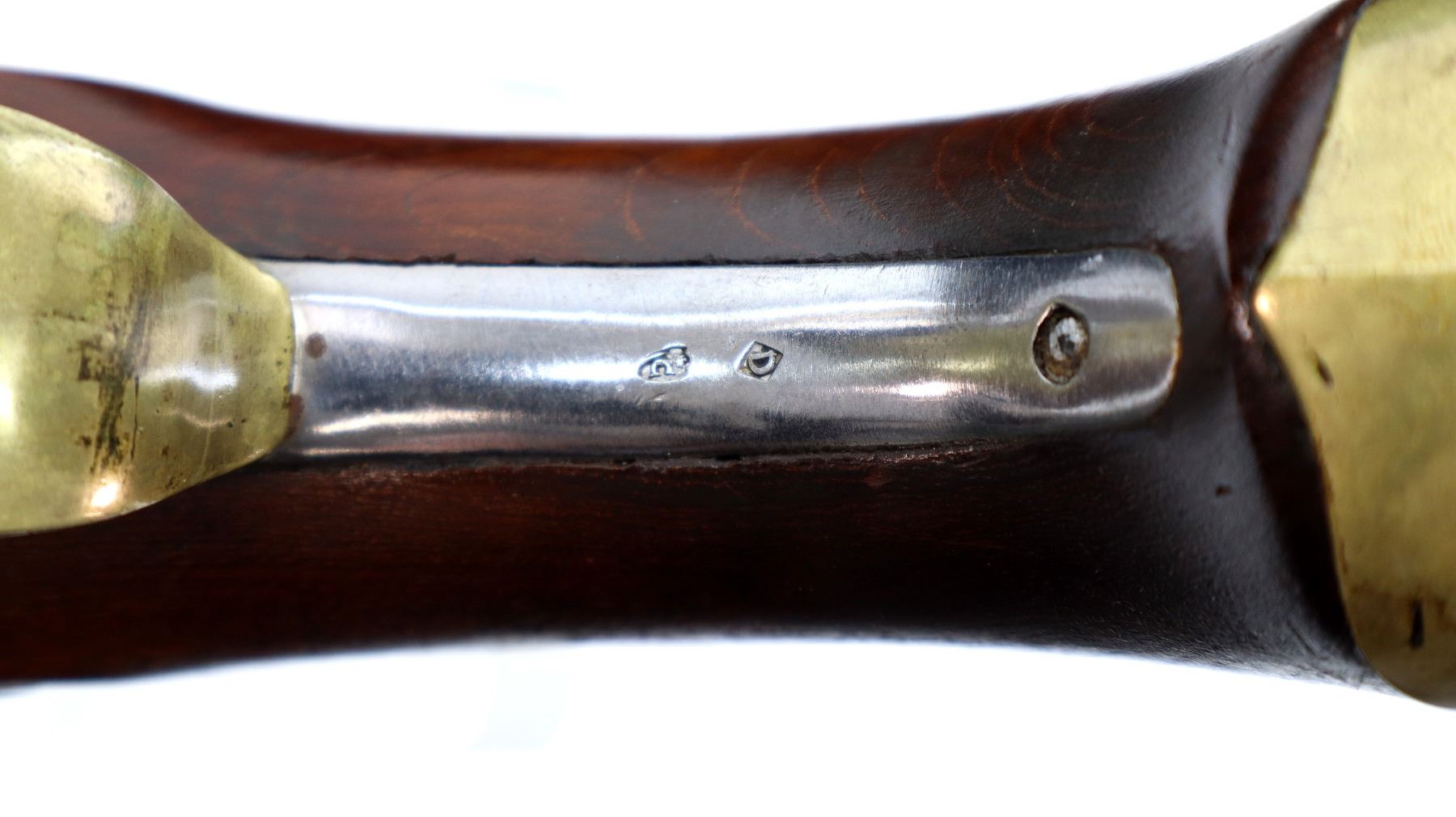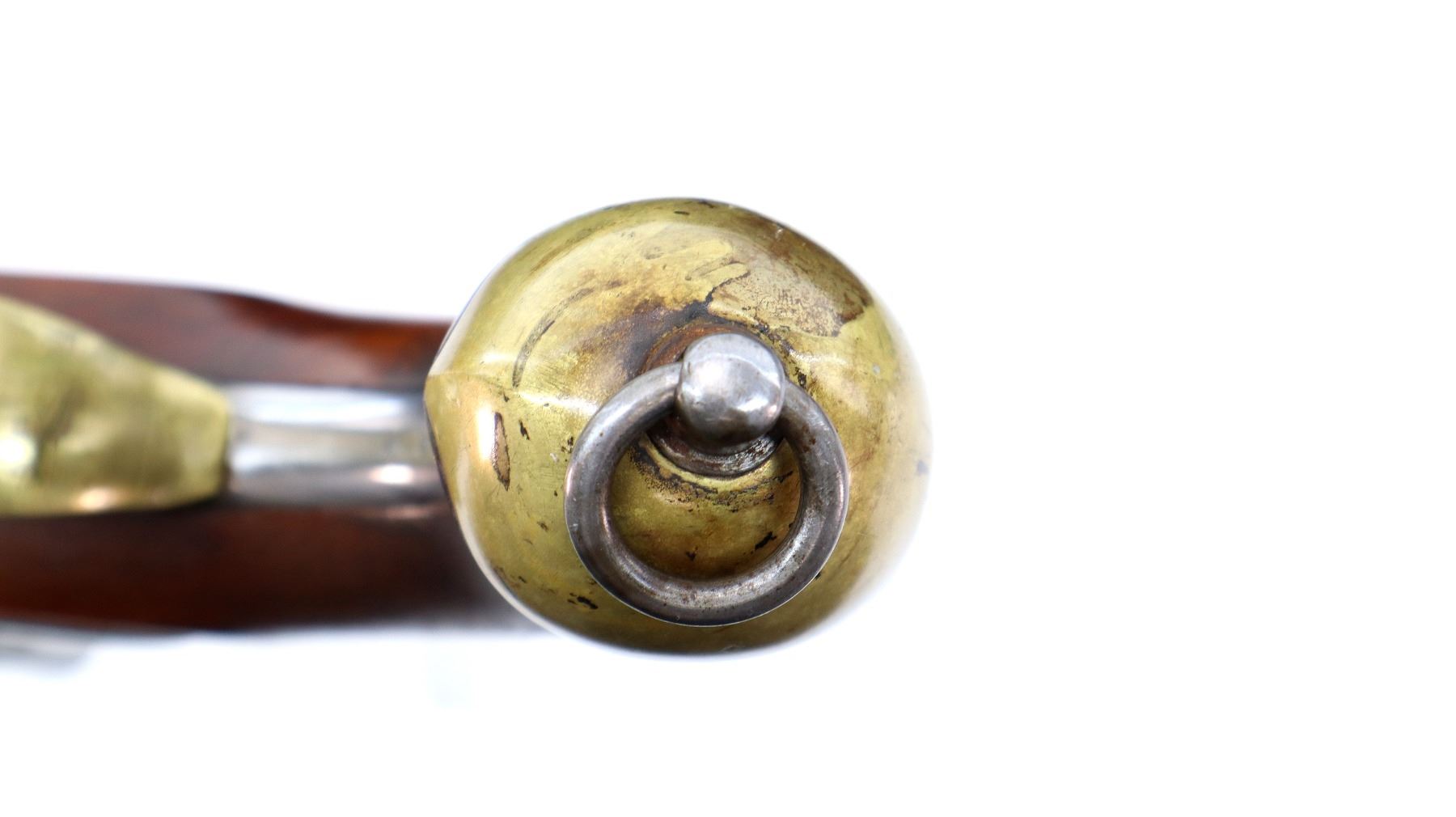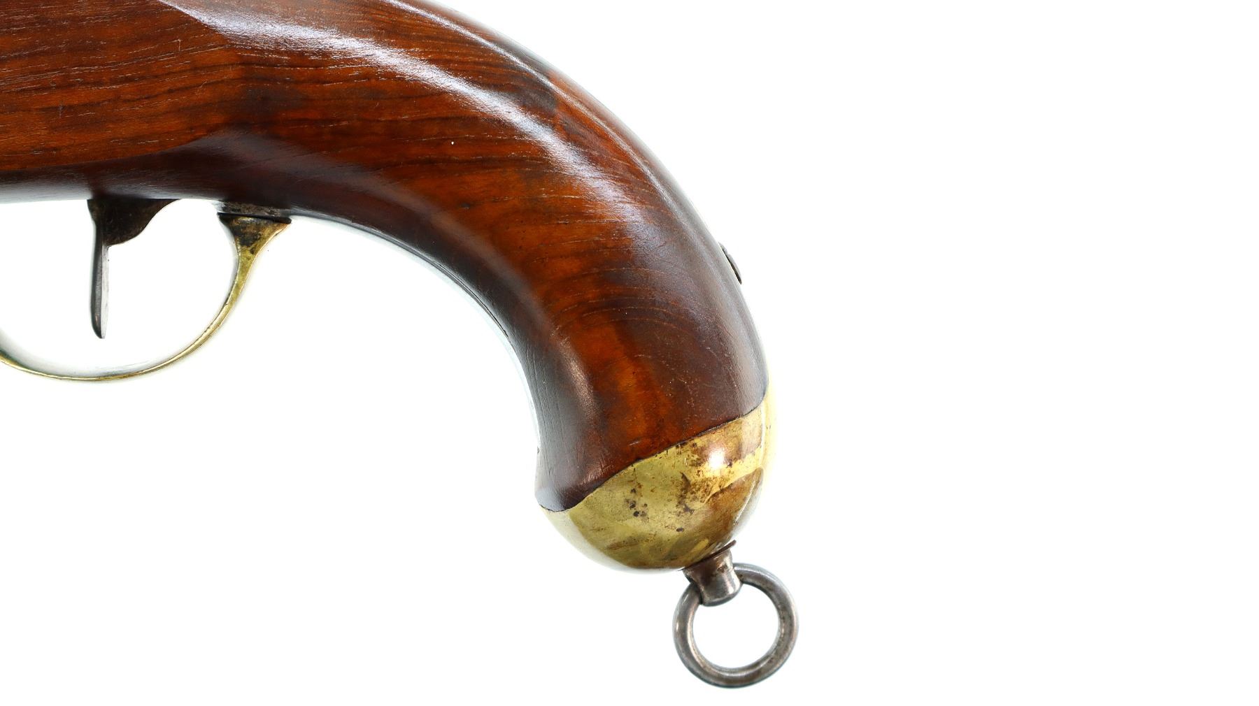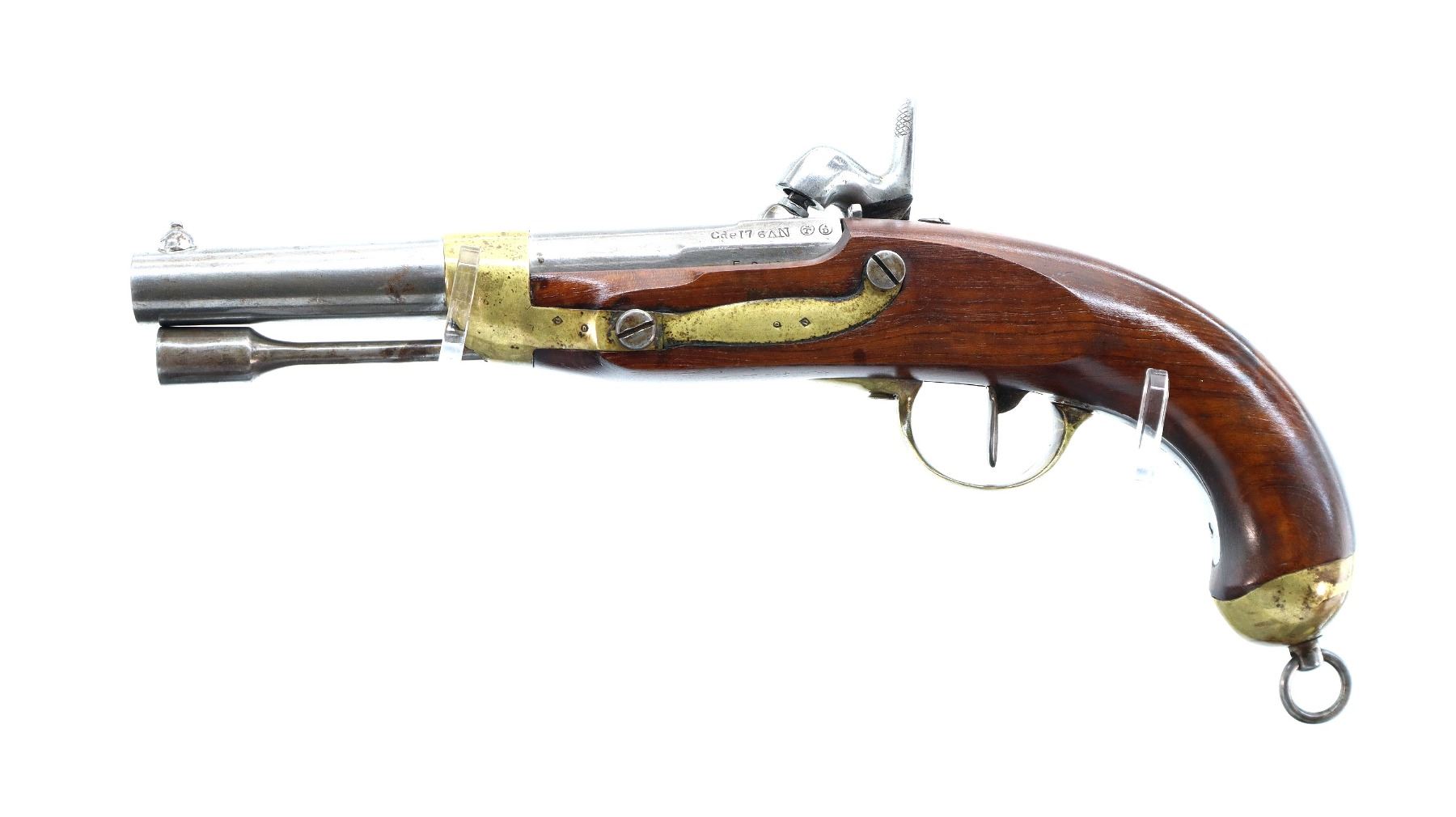Main Description: Manufactured by IMP De Mutzig 1856. Bead front sight, fixed u notched rear sight, tapered round barrel, smooth lock with checkered spur hammer that functions, nipple is intact. One piece wood grip, brass pommel cap with lanyard ring, brass trigger guard and nose cap, steel ramrod.