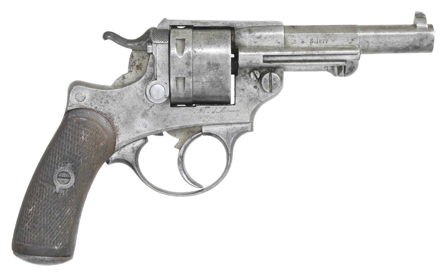 Cal. 11mm. S# G38560. Bbl. 4 3/4". Blade front sight. Fixed rear sight. Grip screw appears to be numbered "628". All other visible numbered parts are matching. Early double action French revolver that saw service all the way into WW1. Right side of bbl. has 1877 date. Right side of frame has St. Etienne arsenal markings. In-the-white metal. Checkered hardwood grips. No lanyard ring assembly present. CONDITION: grips show some light chipping, checkering wear, handling marks & staining. Metal shows scattered oxidation, handling marks & some light pitting. Timing is loose & hammer pushes off, revolver will need attention to function properly. Worn bore with pitting & oxidation throughout. (01-27344/MJC). ANTIQUE. $200-300.