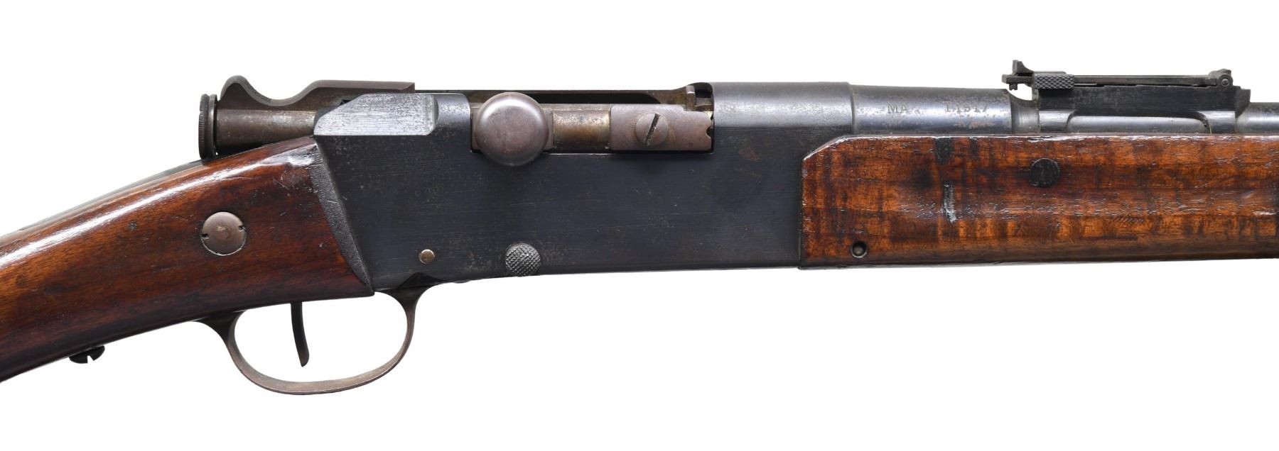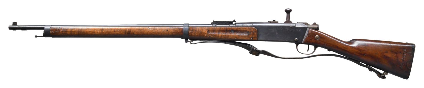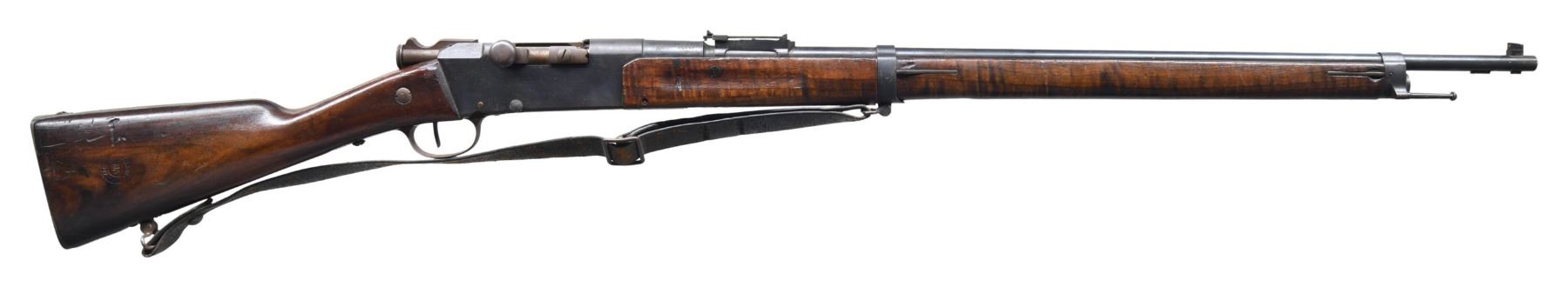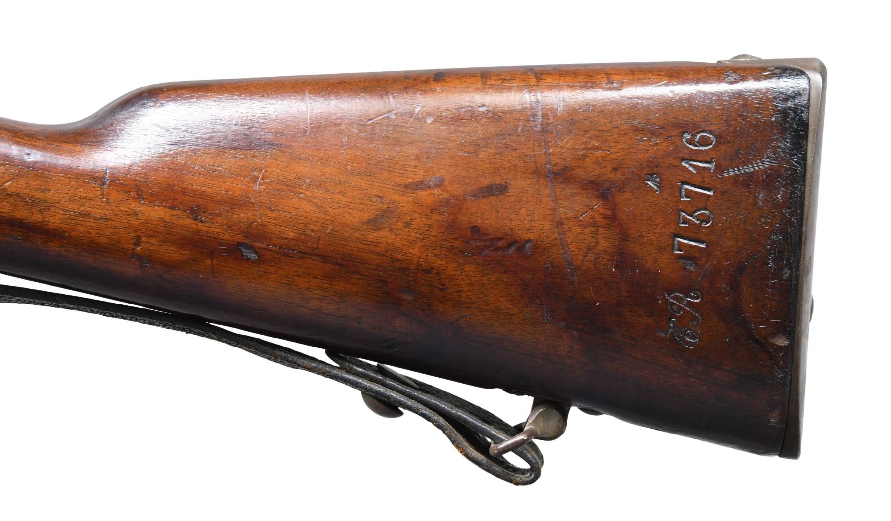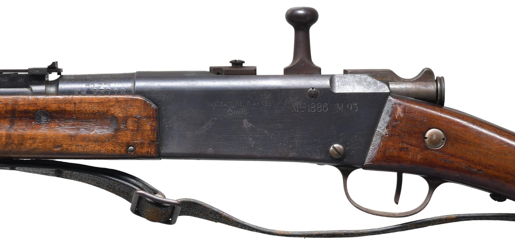 MILITARY RIFLE. Cal. 8mm Lebel. S# ER73716. Matching numbers on bbl., bolt, floorplate, buttstock & forend. Bbl. 31 1/2". Ladder rear sight graduated to 2,400 meters. Thick blade front sight. Receiver is marked on left side "MANUFACTURE D'ARMES TULLE". Bbl. & receiver are marked on top w/ "N" indicating ammunition type. Bbl. is marked on right side "MA T 1917". Walnut stock set. Buttstock is marked w/ roundel on right side. Legible lettering includes "MARS MA 1917". Stacking rod is present. Original style black leather sling. Sling is heavily worn. CONDITION: stock set has the wear & handling marks expected from extensive service. Metal has 50% of its original blue finish w/ areas of oxidation & very fine pitting. Bolt, trigger guard & buttplate were originally bright, now turning overall patina. Dark oxidized bore w/ pitting throughout. (25-2317/RW). CURIO. $400-600.