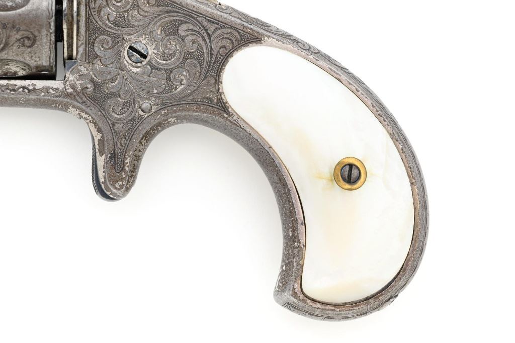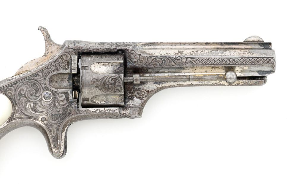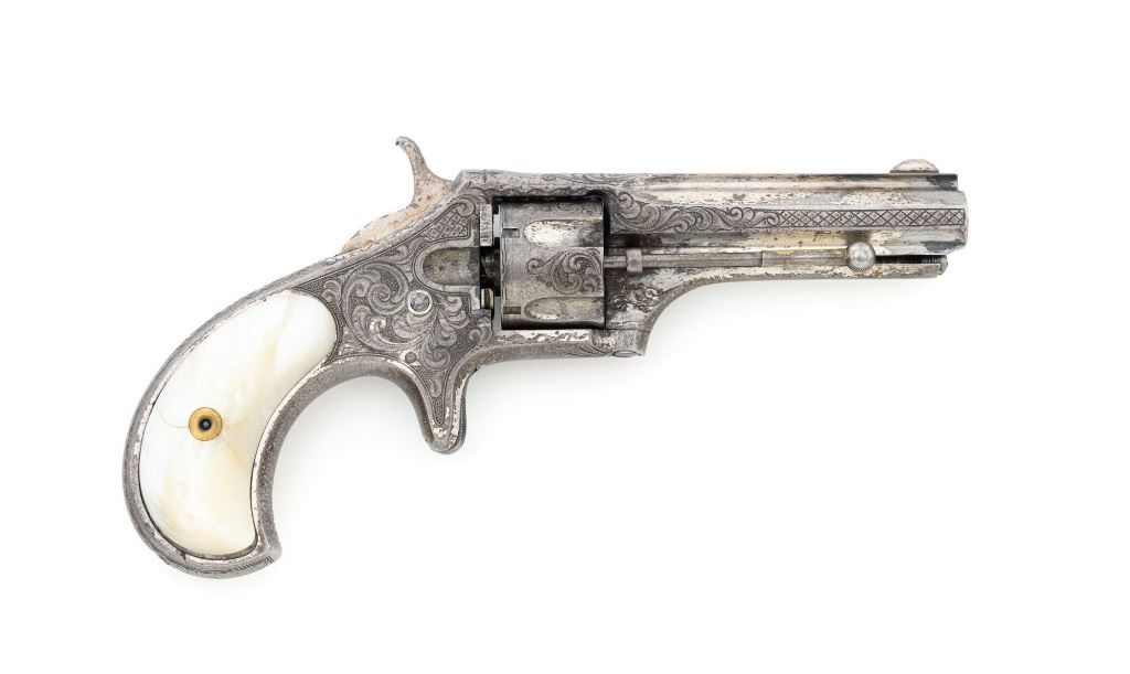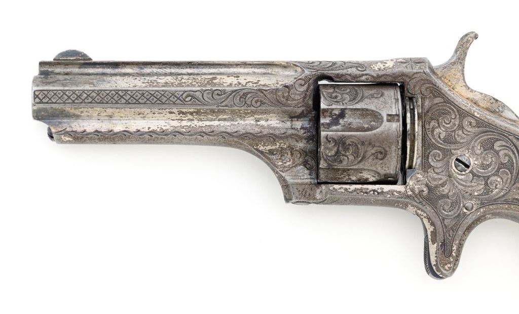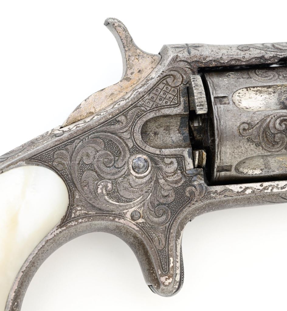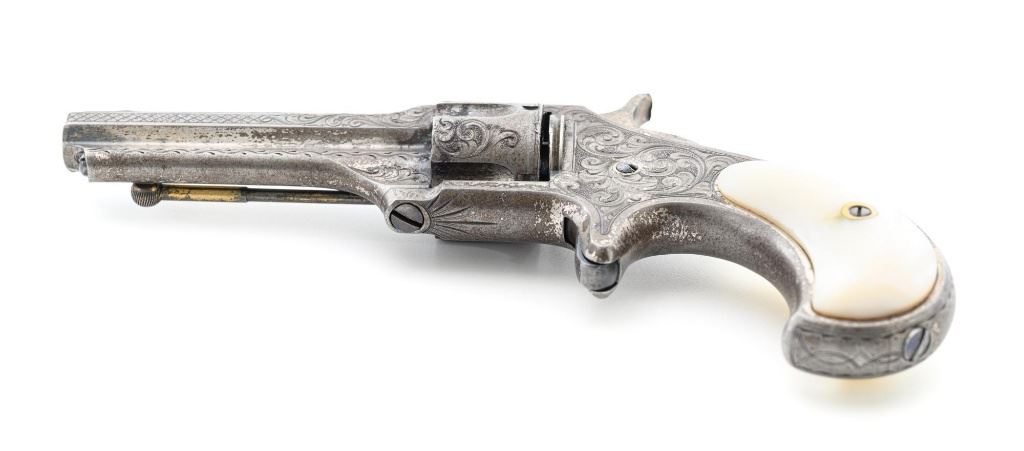 Factory Engraved Remington-Smoot New Model No. 1 Revolver, #11, .30 RF short cal., 2-13/16" solid rib barrel, nickel finish with gold washed hammer and ejector rod, pearl grips, spur trigger, fixed half-moon front sight, and notched rear sight. This early production revolver features a rotating recoil shield. Metal surfaces with extensive floral scroll engraving throughout, with scalloped borders, and cross-cut pattern to both sides of the barrel. Barrel address is marked in one-line "E. REMINGTON & SONS, ILION, N.Y. PAT. W.S. SMOOT. OCT. 21, 1873." The number "11" is stamped twice on the left side of the grip frame, once above and below the main spring. The Remington-Smoot No. 1 revolver was patented in 1873 and produced by Remington & Sons from 1875-1877, with approx. 3,000 produced. Overall condition of this revolver is very good to near fine, displaying approx. 30% nickel finish, primarily to sides of the barrel. Hammer and ejector rod retain approx. 65% gold wash. The iridescent pearl grips are fine, with hairline fissures on the surface around the brass escutcheons, and "XVII" scratched into the back of each grip. Markings and engraving are crisp. Action cycles smoothly but the hammer will not stay on full cock. Rifling is very good with scattered light erosion present. Est.: 1,800-$2,400. (Antique) (Michael Strietbeck Collection)