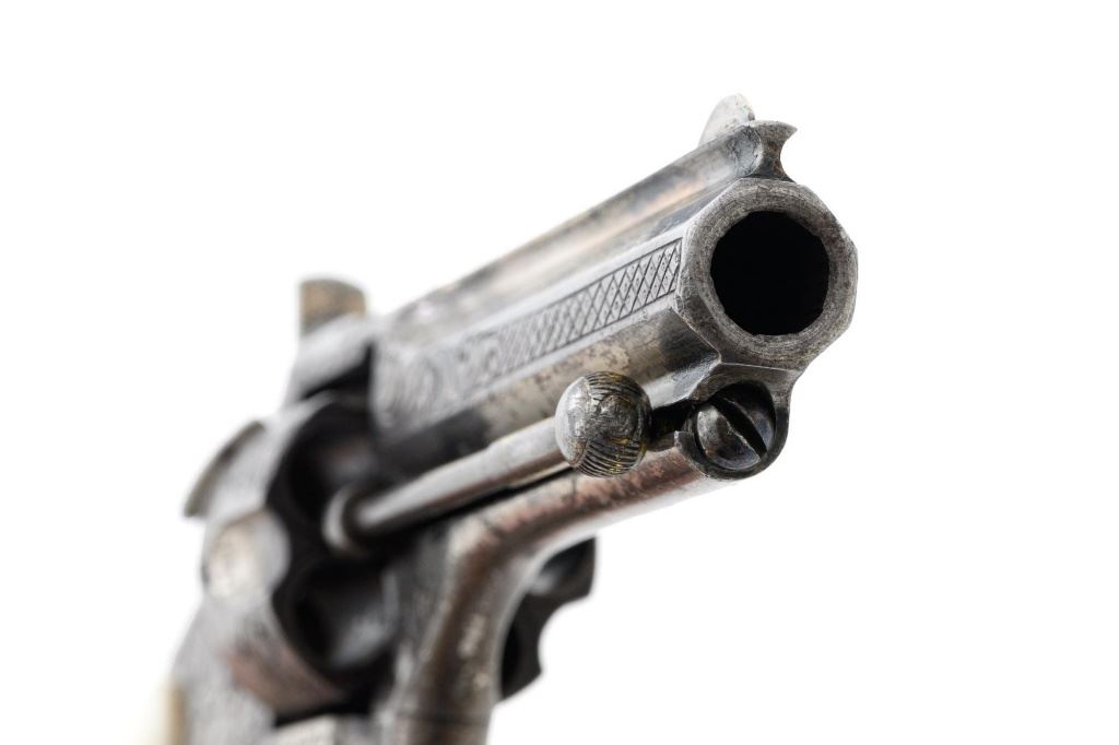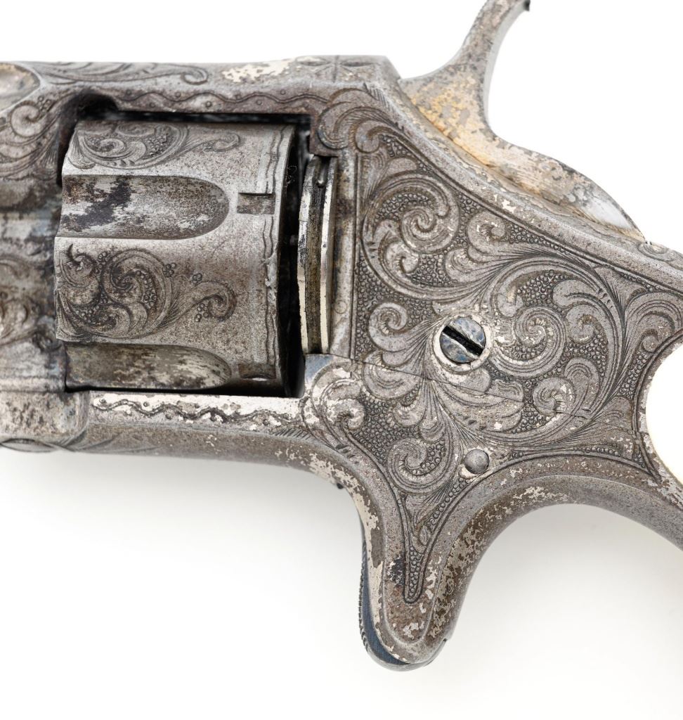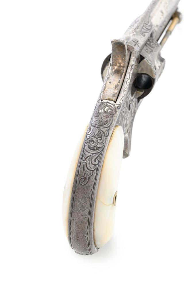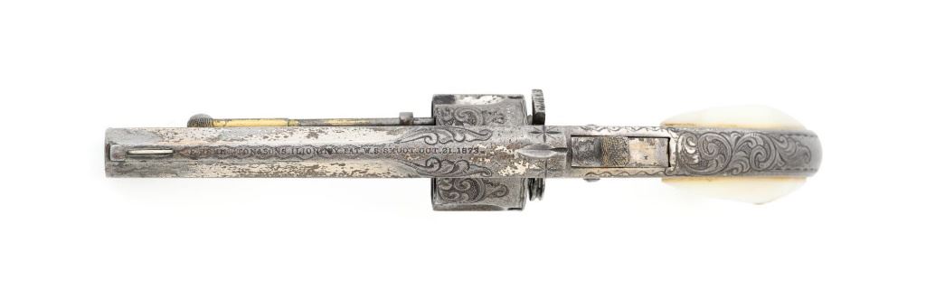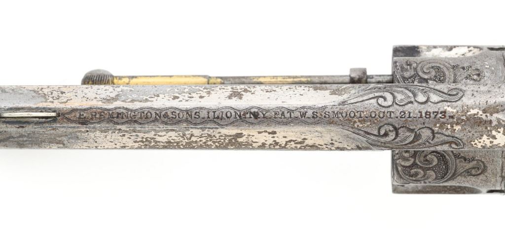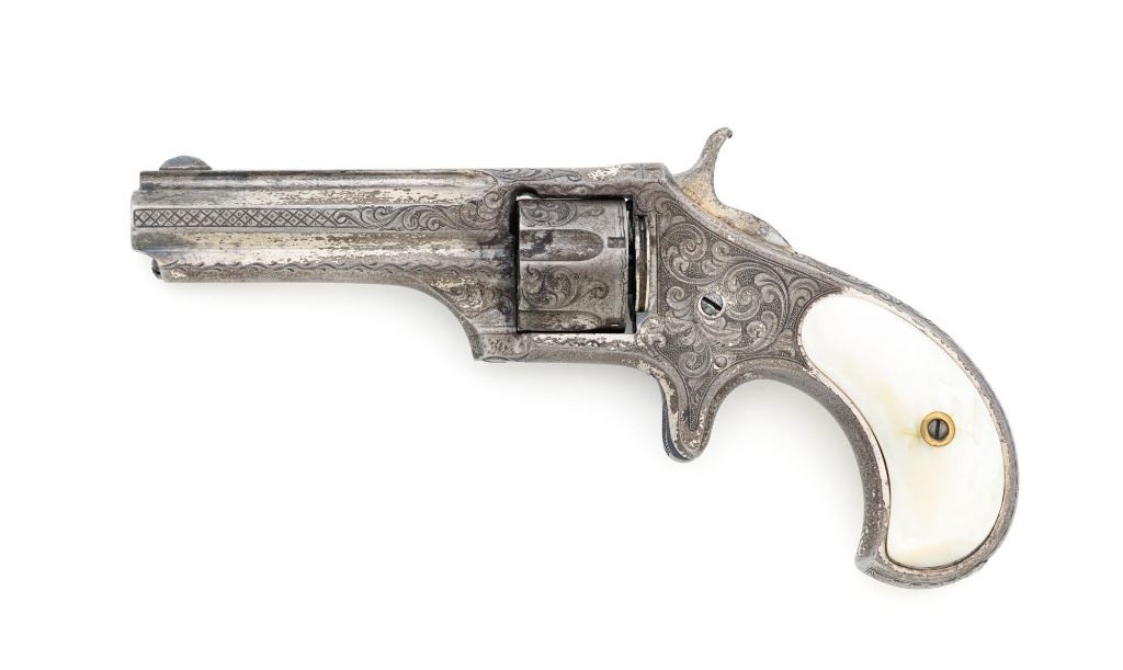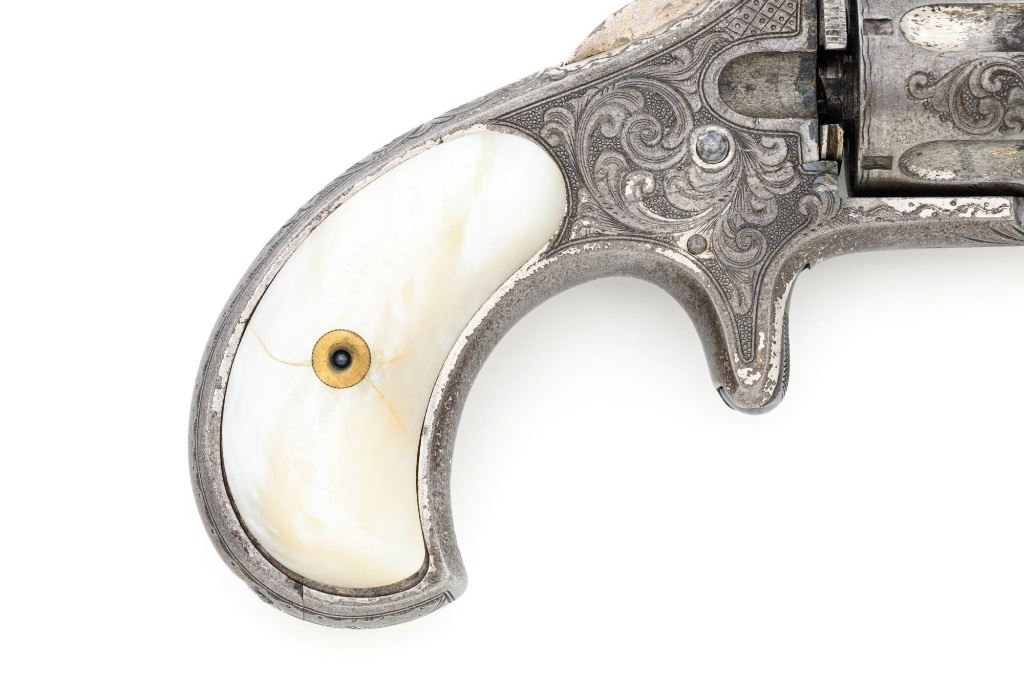 Factory Engraved Remington-Smoot New Model No. 1 Revolver, #11, .30 RF short cal., 2-13/16" solid rib barrel, nickel finish with gold washed hammer and ejector rod, pearl grips, spur trigger, fixed half-moon front sight, and notched rear sight. This early production revolver features a rotating recoil shield. Metal surfaces with extensive floral scroll engraving throughout, with scalloped borders, and cross-cut pattern to both sides of the barrel. Barrel address is marked in one-line "E. REMINGTON & SONS, ILION, N.Y. PAT. W.S. SMOOT. OCT. 21, 1873." The number "11" is stamped twice on the left side of the grip frame, once above and below the main spring. The Remington-Smoot No. 1 revolver was patented in 1873 and produced by Remington & Sons from 1875-1877, with approx. 3,000 produced. Overall condition of this revolver is very good to near fine, displaying approx. 30% nickel finish, primarily to sides of the barrel. Hammer and ejector rod retain approx. 65% gold wash. The iridescent pearl grips are fine, with hairline fissures on the surface around the brass escutcheons, and "XVII" scratched into the back of each grip. Markings and engraving are crisp. Action cycles smoothly but the hammer will not stay on full cock. Rifling is very good with scattered light erosion present. Est.: 1,800-$2,400. (Antique) (Michael Strietbeck Collection)