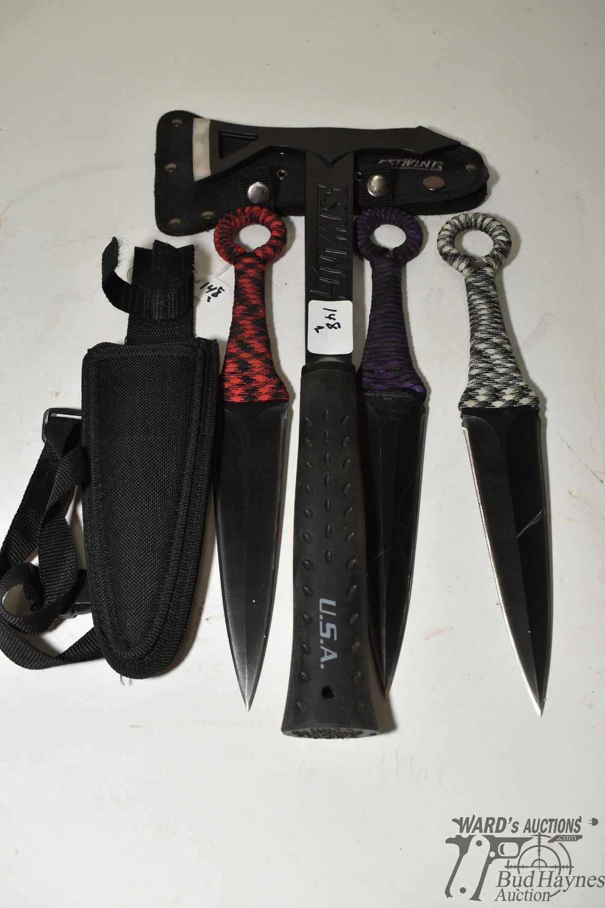 Fastwing tactical axe and a set of three expendables Kunai throwing knives