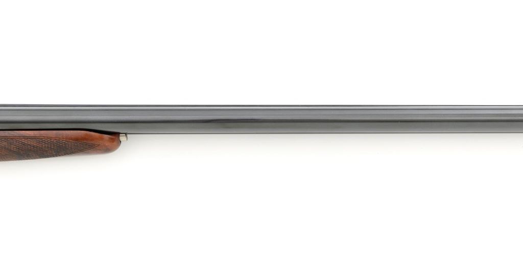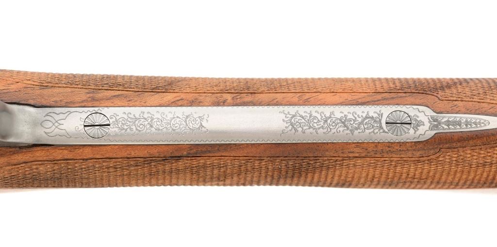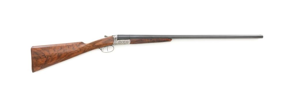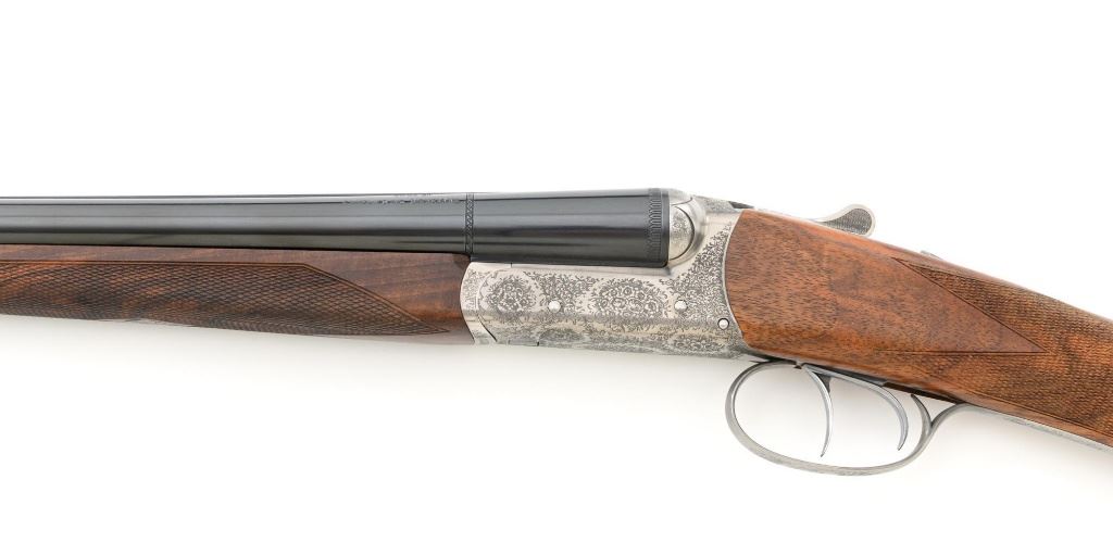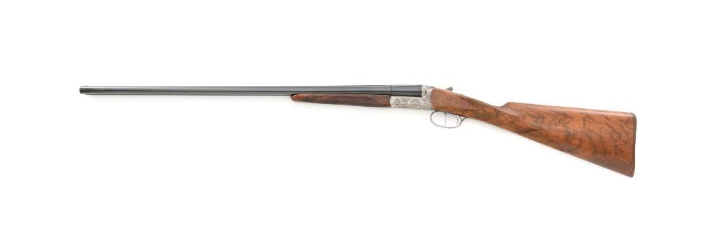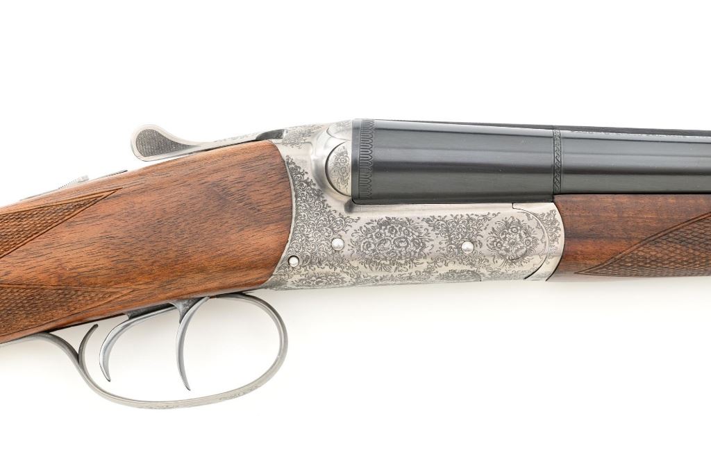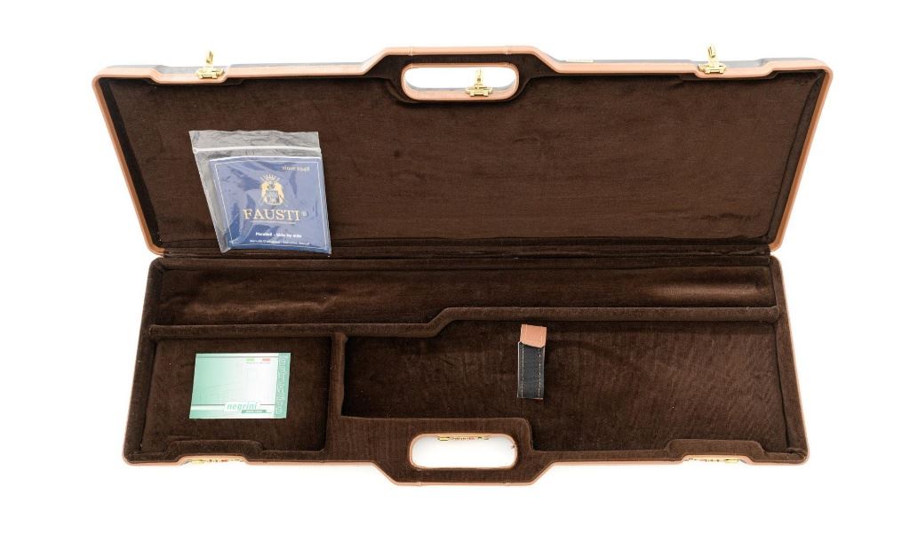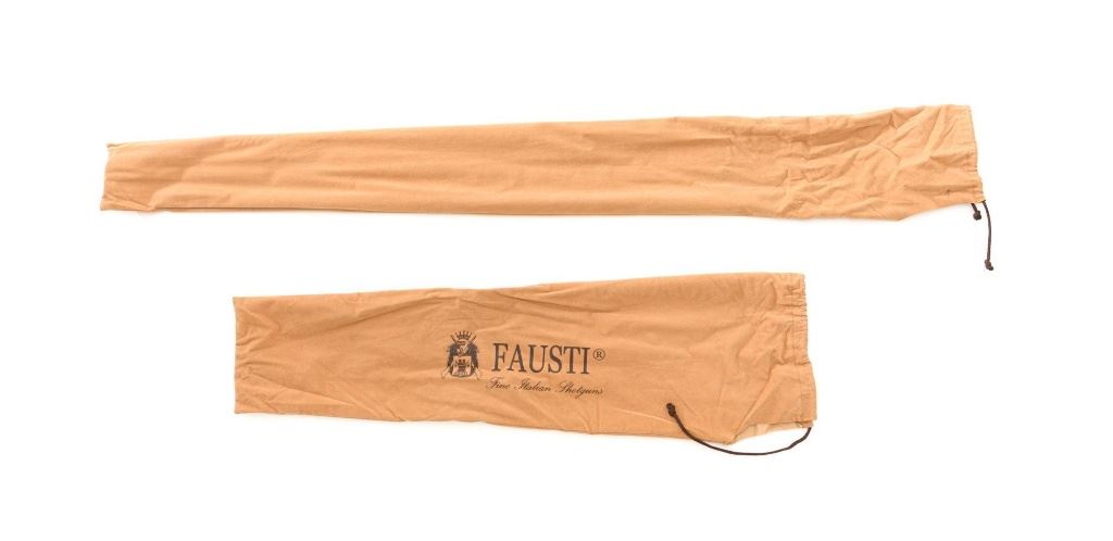 Fausti Stefano Model BC500 Side-by-Side Shotgun, #B45994. 20 ga., 28" solid rib barrels have 3" chambers and are choked IC/MOD. The action uses a dual underlug lockup and features double triggers, non-automatic safety, and selective ejectors. Coin colored receiver, trigger guard, and tangs are nicely roll engraved with rose and scroll patterns, with a Fausti shield on the trigger guard. Splinter forend and straight grip buttstock are satin-finished "C" grade European walnut, with very thorough hand checkering at 22 LPI, a push button forend release, and a wooden buttplate with Fausti crest. Stock dimensions are 15" x 1-1/2" x 2-3/8". Mfgd 2008, by Fausti in Italy for Cabelas INC. Gun sleeves and paperwork are contained in a very nice Negrini hard case. Condition is absolutely excellent with no handling marks to wood and very little wear to the action, which locks tight and functions perfectly. Bores are mirror bright. This gun should preform well for years to come. Est.: $2,000-$2,500. (Modern)