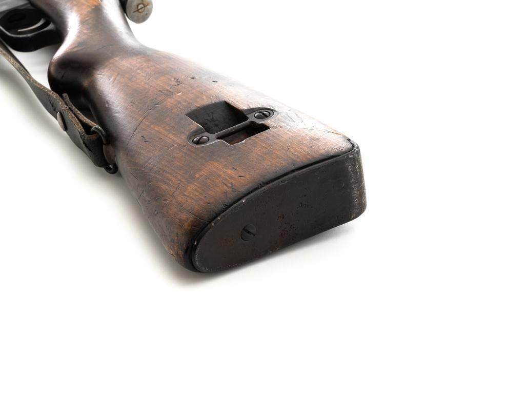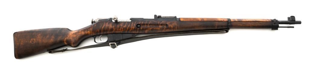 Finnish Sako M39 Mosin Nagant Bolt Action Rifle, #254527, 7.62x54Rmm cal., 27" barrel, blued finish with bright bolt assembly, semi-pistol grip hardwood stock with handguard and two-piece forend, blade front sight with protectors, and adjustable folding leaf rear sight with "U"-notched groove, graduated to 2000 meters. Includes a steel cleaning rod and green leather Finnish sling. Sling is in good condition, showing age and wear. Top of the barrel shank is marked with a boxed "SA" Finnish property stamp/(Sako makers mark)/254527/1944". Right side of the buttstock is stamped with "(crossed cannons)S" and Sako "gear wheel" makers mark. Matching number stamped on the bolt knob. Other numbers do not match. Import marked on right side of the barrel. Condition overall is very good+, retaining approx. 90% toning blue, with areas of pitting to the buttplate. Wood with scattered mostly light handling marks. Action operates smoothly. Bore is good with clear rifling. Est.: $500-$800. (C&R)