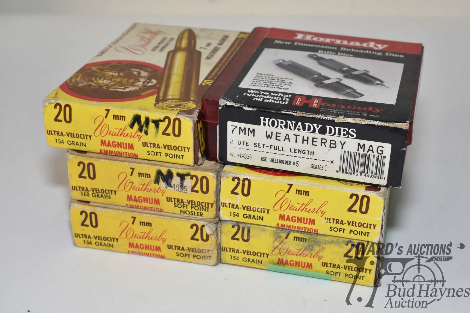 Five full 20 count boxes of used 7mm Weatherby mag brass and a Hornady 7mm Weatherby mag die set