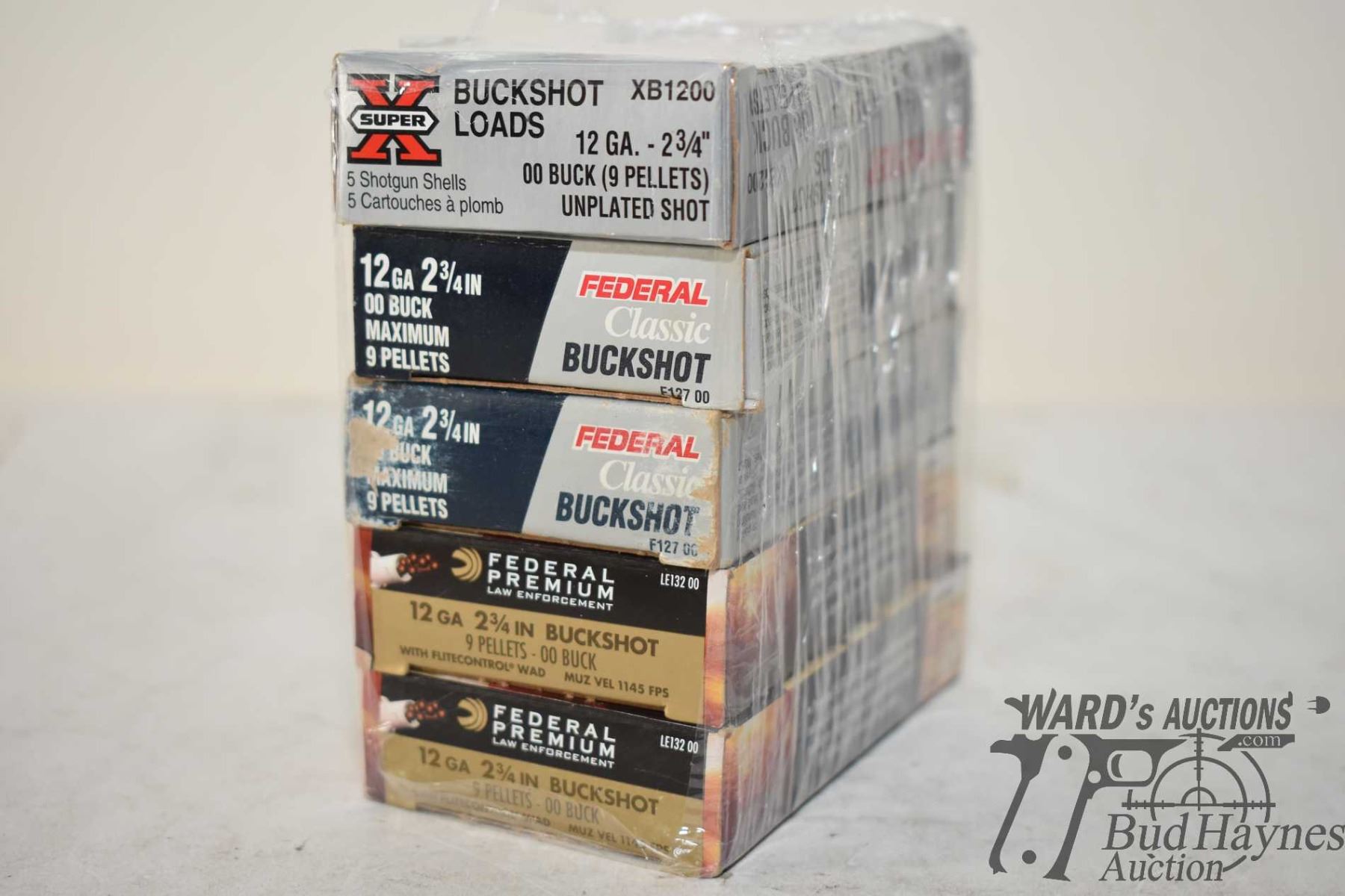 Five full 5 count boxes of 12 GA 2 3/4" 00 Buckshot including 2 Federal premium, 2 Federal classic and 1 Winchester super x