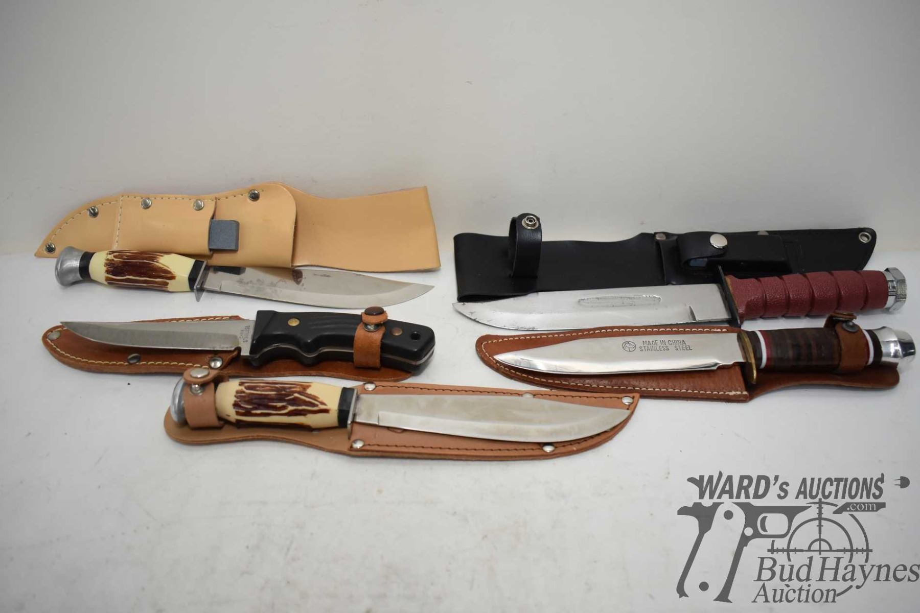 Five hunting knives w/ sheaths including two Tramontina made in Brazil