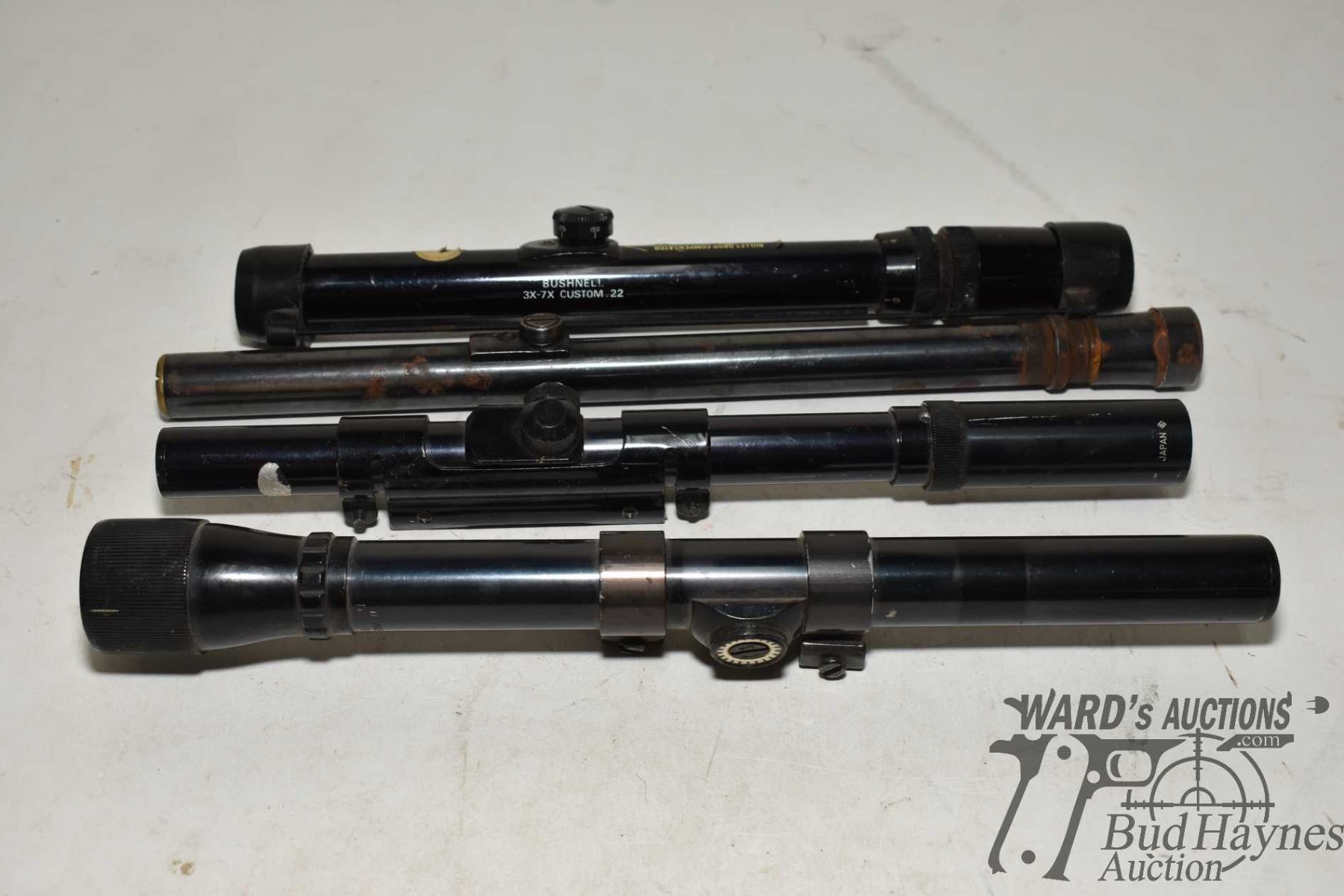 Four scopes including Weaver D4, Weaver B4, Bushnell 3x-7x custum 22 and a Global Firearms 4x15