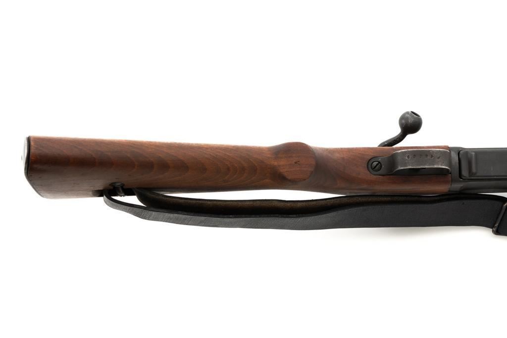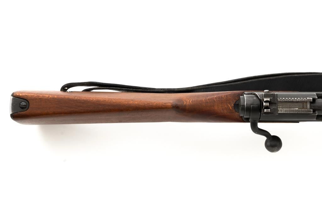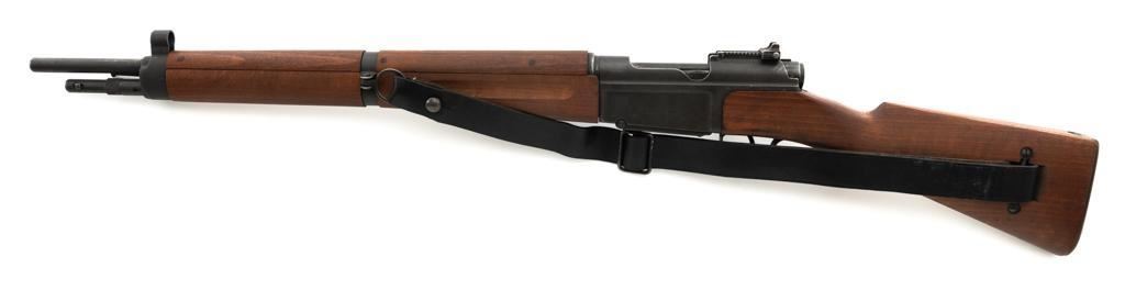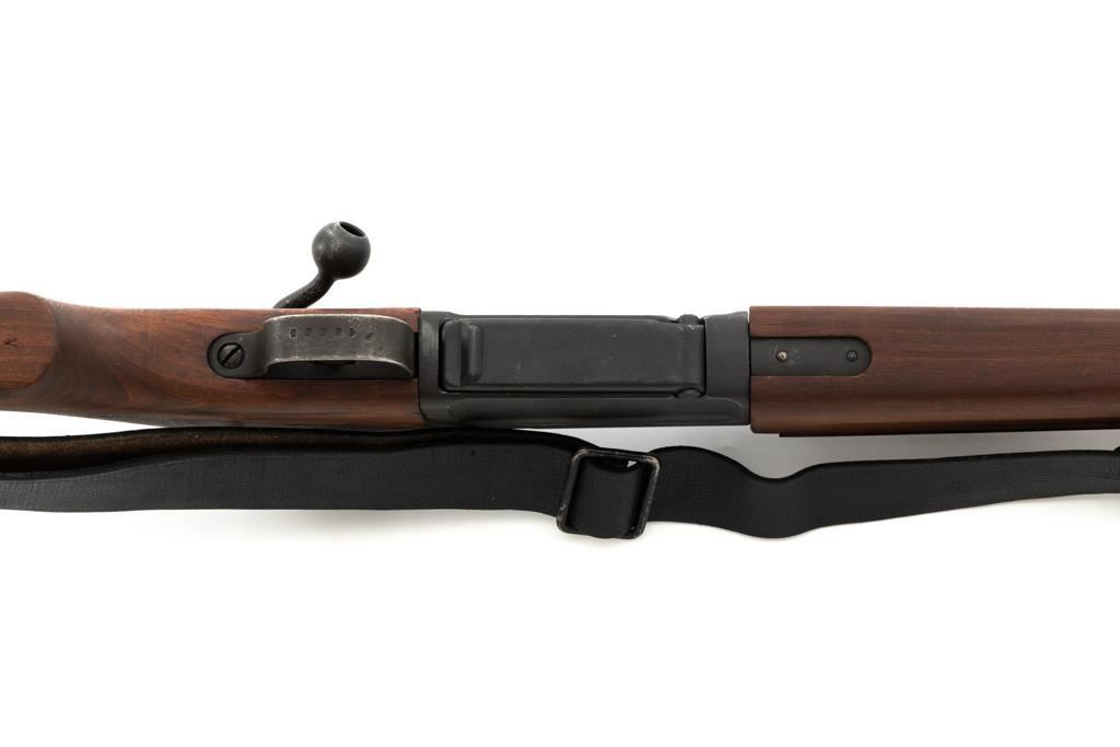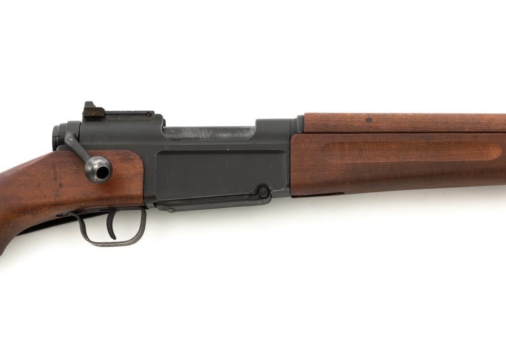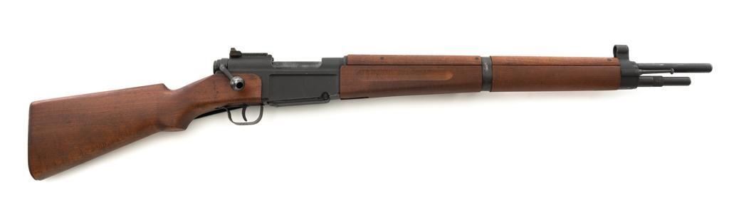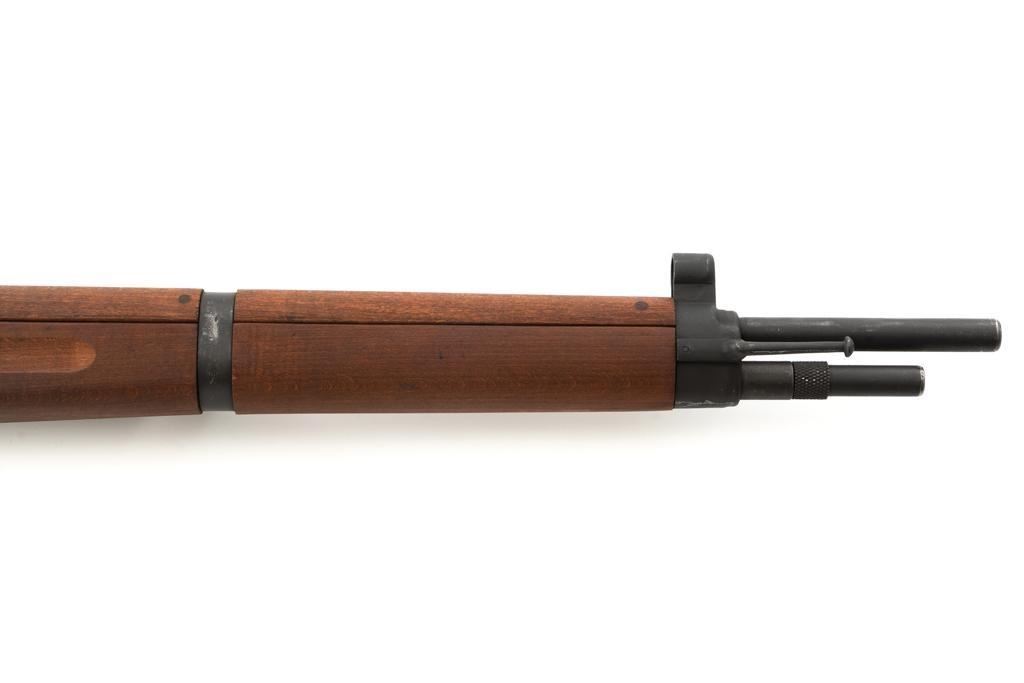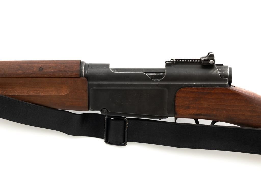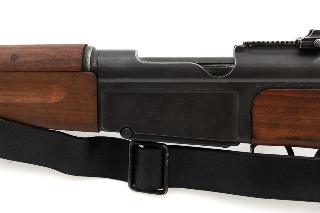 French MAS 36 Bolt Action Rifle with Bayonet, #FG23158, 7.5x54mm cal., 23" barrel, parkerized finish, hardwood stock with handguard, hooded blade front sight, and adjustable aperture rear sight, graduated to 1200 meters. Includes bayonet and black leather French sling. Left side of the receiver is marked "MAS MLE 1936/FG 23158". Matching number on bolt handle, trigger guard does not match. Import marked on left side of the receiver. Condition overall is fine, retaining approx. 90% finish, showing wear to the receiver and bolt body, with spots of patina on the buttplate. Wood with scattered impressions and handling marks to the dark, even colored finish. Action operates smoothly. Muzzle has been counter bored. Bore is bright with good, defined rifling. Est.: $500-$700. (C&R)