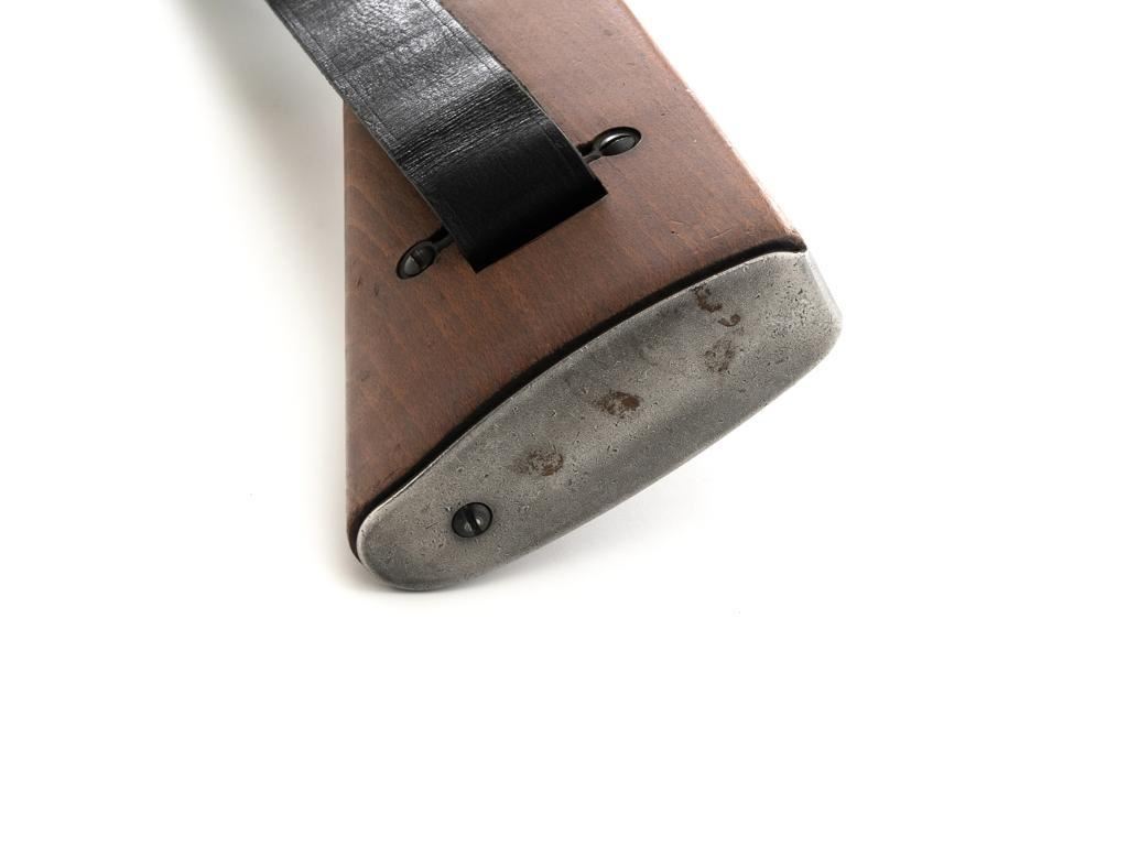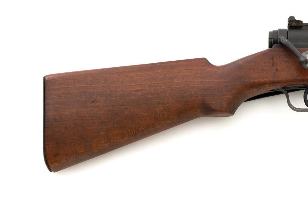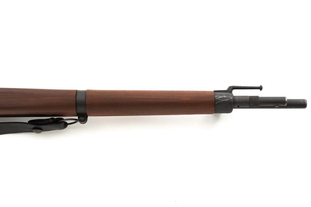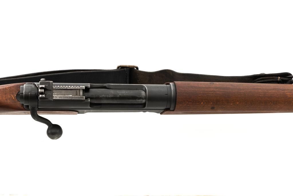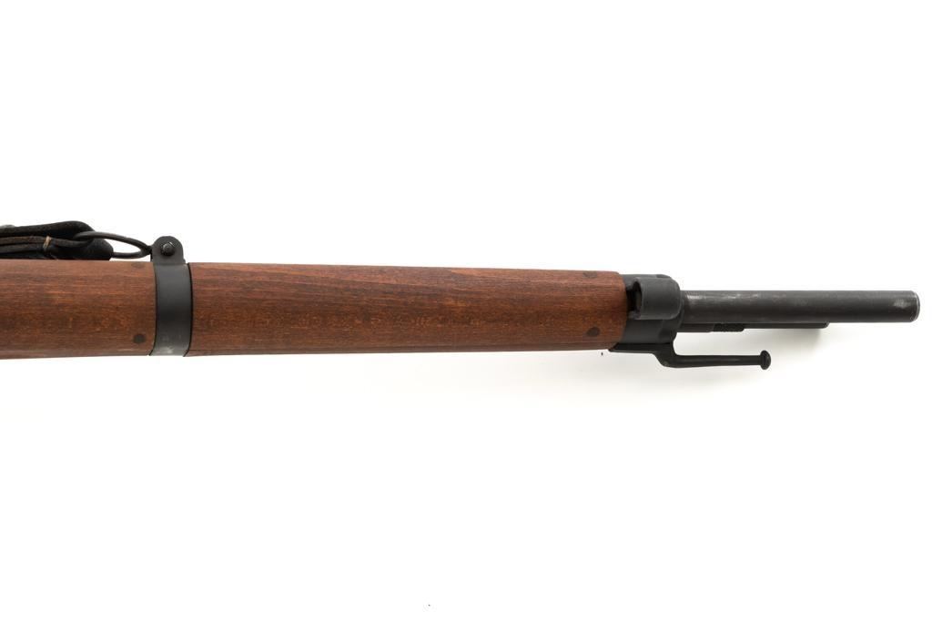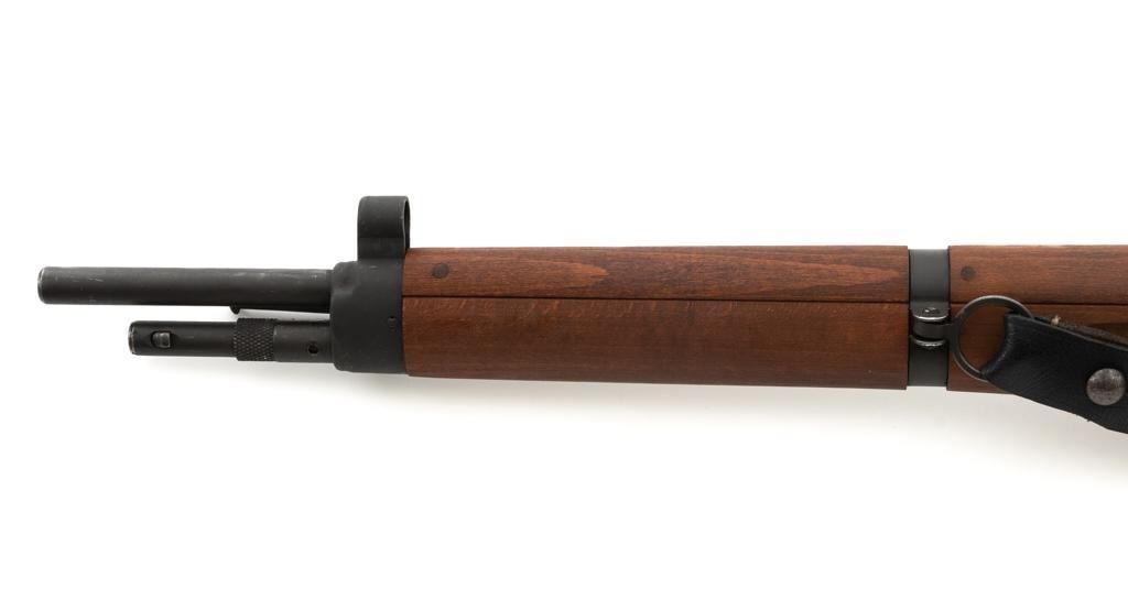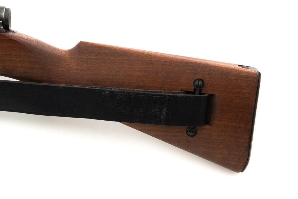 French MAS 36 Bolt Action Rifle with Bayonet, #FG23158, 7.5x54mm cal., 23" barrel, parkerized finish, hardwood stock with handguard, hooded blade front sight, and adjustable aperture rear sight, graduated to 1200 meters. Includes bayonet and black leather French sling. Left side of the receiver is marked "MAS MLE 1936/FG 23158". Matching number on bolt handle, trigger guard does not match. Import marked on left side of the receiver. Condition overall is fine, retaining approx. 90% finish, showing wear to the receiver and bolt body, with spots of patina on the buttplate. Wood with scattered impressions and handling marks to the dark, even colored finish. Action operates smoothly. Muzzle has been counter bored. Bore is bright with good, defined rifling. Est.: $500-$700. (C&R)