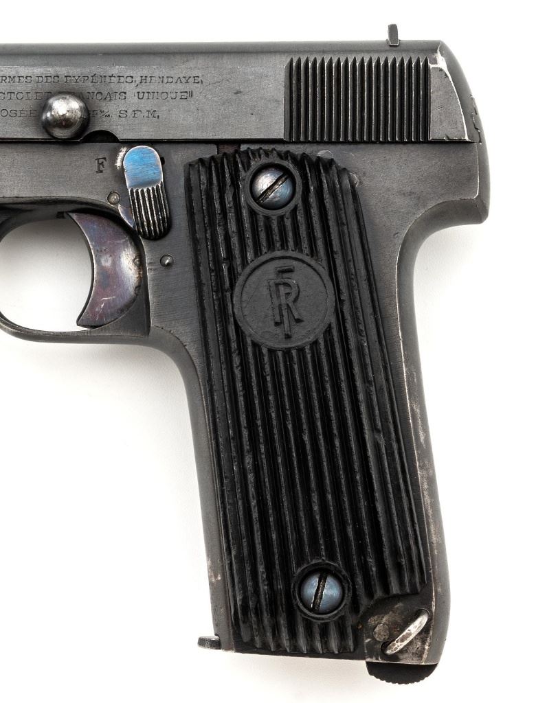 French Model 17 Unique Semi-Automatic Pistol, #403727, .32 ACP cal., 3.25" barrel, blued finish, black plastic grooved grips embossed with "RF" logos on each side, blade front sight, fixed rear sight with "V"-notched groove, and fixed lanyard loop on left side of the frame. Includes one unmarked blued steel magazine. Pistol is marked "MANUFACTURE DARMES DES PYRENEES,HENDAYE,/LE VERITABLE PISTOLET FRANCAIS "UNIQUE"/MARQUE DEPOSEE 7.65M/M SF.M." on left side of the slide. No visible import marks. Condition overall is very good+, retaining approx. 87%-90% blue, showing edgewear and toning. Grips with light dents and scratches. Action operates smoothly. There is a spot of patina at the muzzle, otherwise bore is bright with clearly defined rifling. Est.: $300-$450. (C&R/PPT)