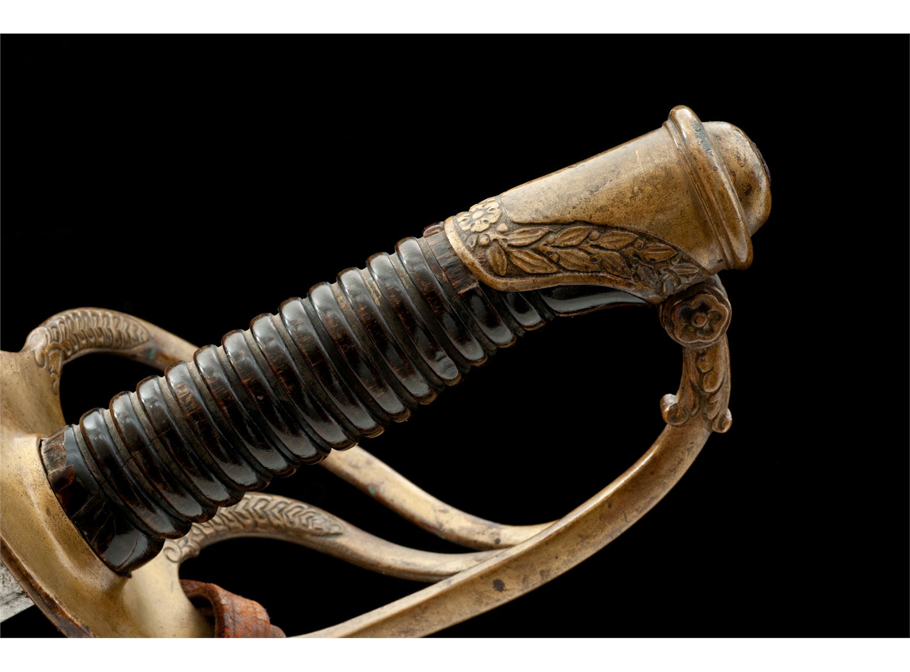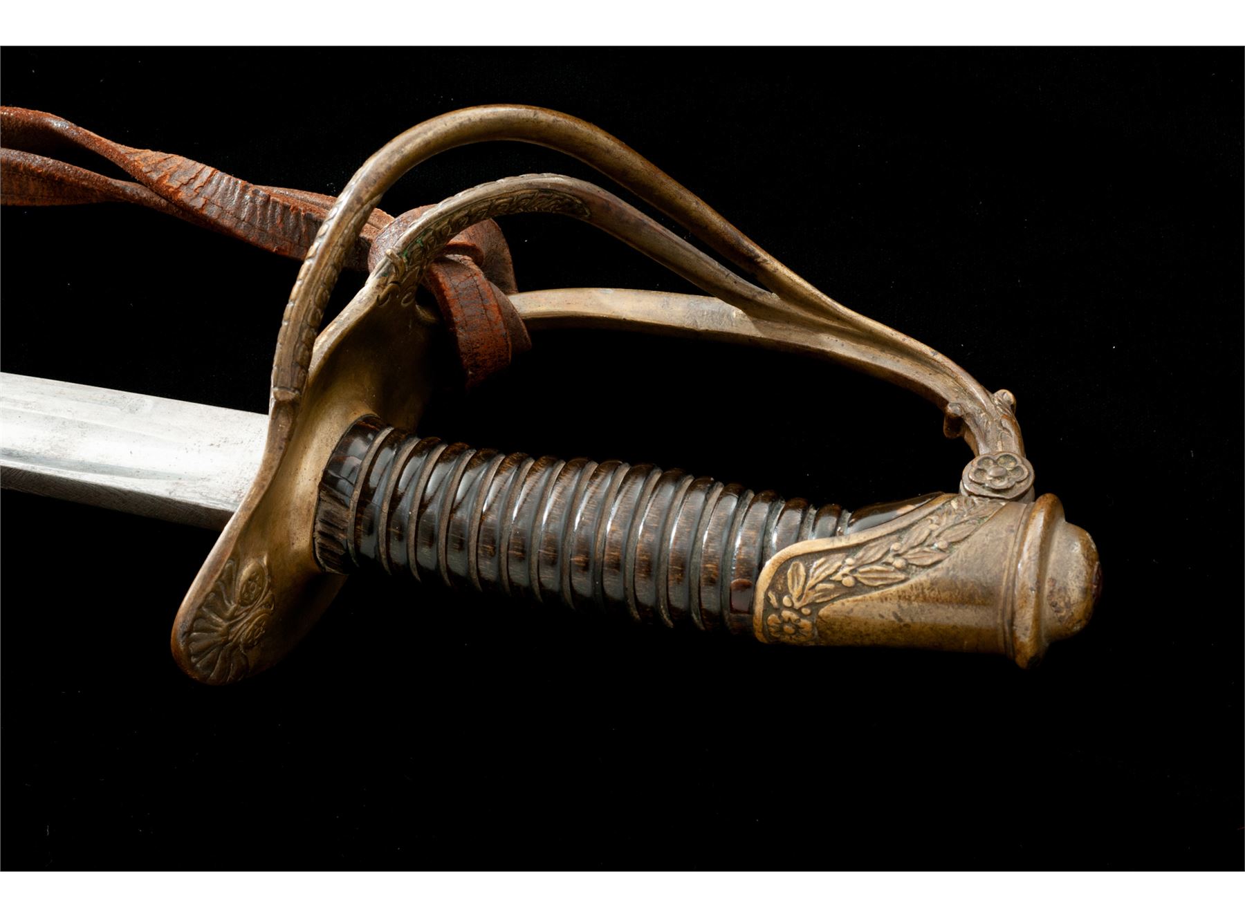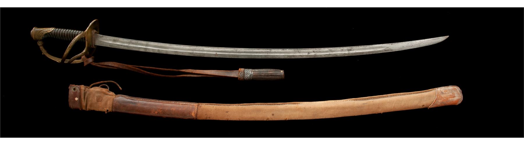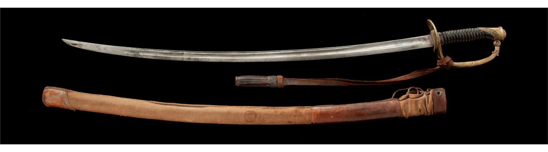 French Model 1822 Cavalry Officer's Sword, with leather sword knot, in canvas and leather cover. The 34.75'' double fullered blade is bright with some light pitting and light sharpening. Arsenal marking on top spine of the blade has been ''XX''ed out. Brass guard features three branches with engraved decorations; pommel with oakleaf and floral decorations. Condition is very good. Handle is grooved horn and is missing its wire wrapping. There are a couple of chips and a tight hairline in the horn grip. Leather sword knot attached to the guard shows some age. Scabbard is covered with a tan woven cotton and brown leather cover, with partial leather lacing to retain it at the top. Cover shows stains, a couple of minor holes, and scuffs to the leather. Overall length is 43''. Est.: $450-$750.