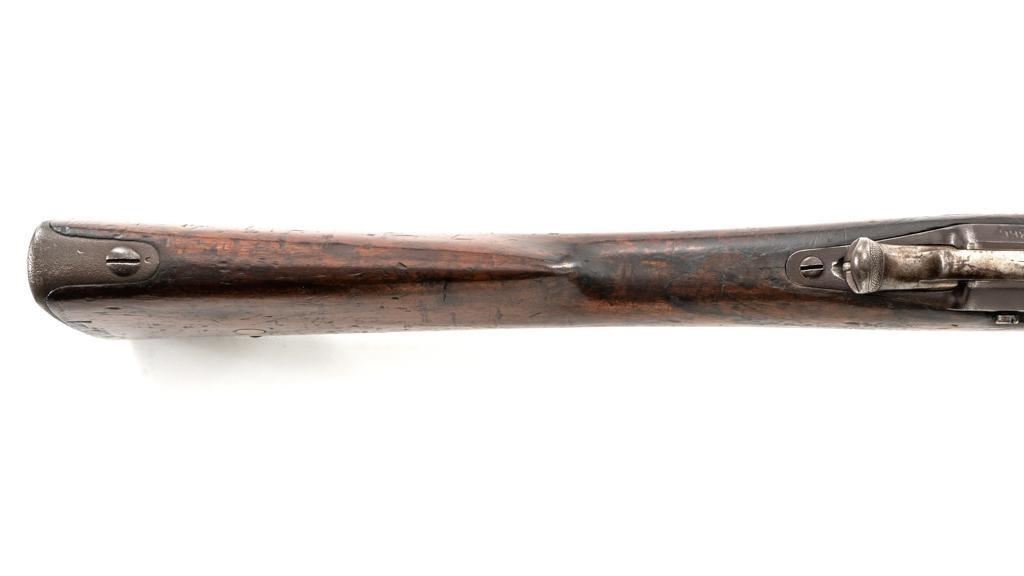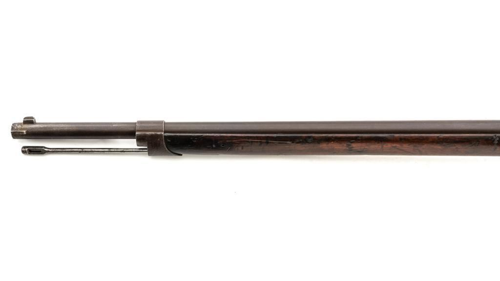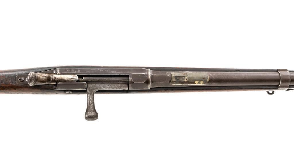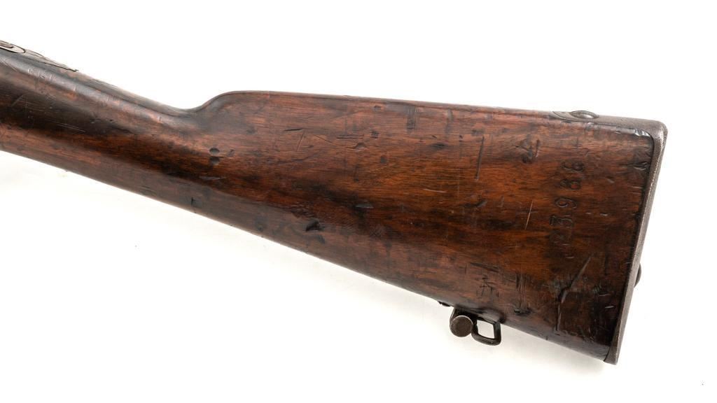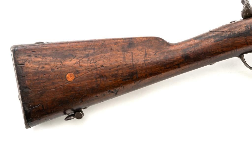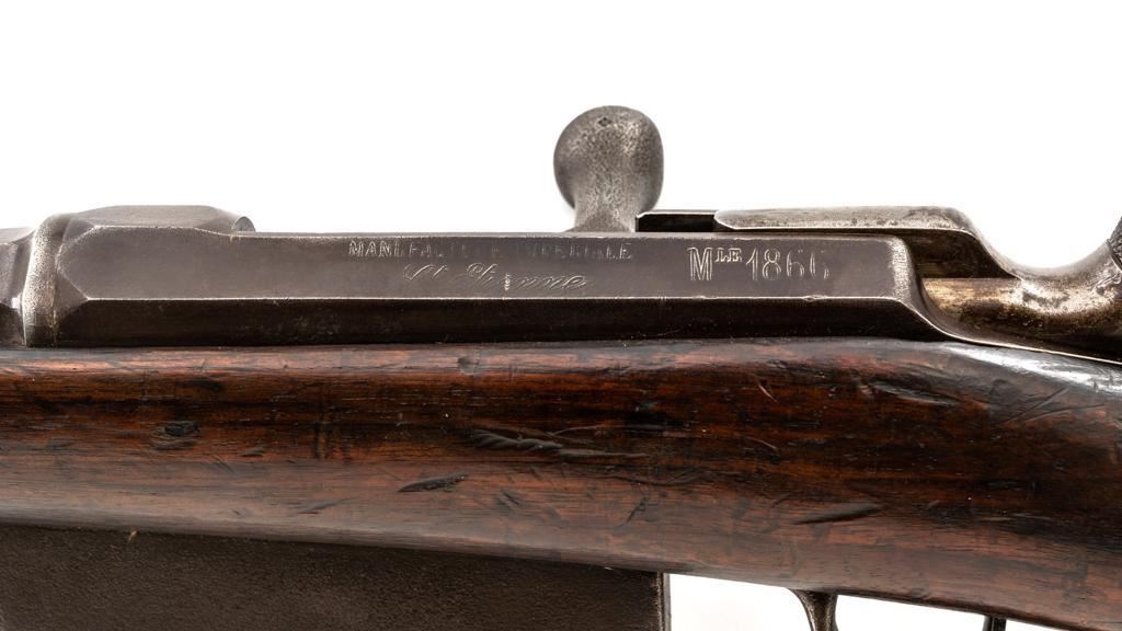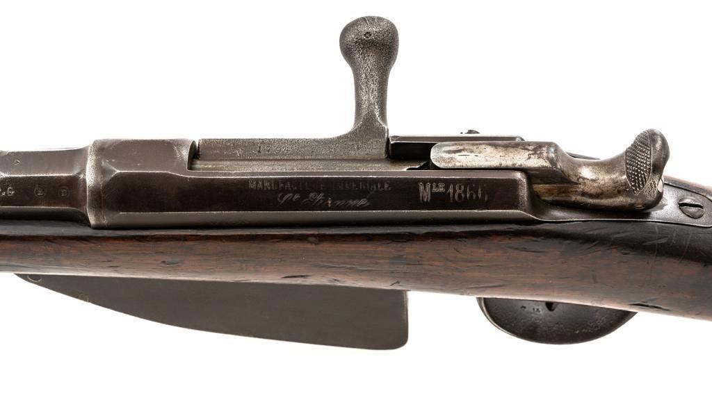French Model 1866 Chassepot Bolt Action Rifle with Magazine, #J23988, 11x59Rmm cal., 32.25" barrel, blued finish, hardwood stock, inverted-"V" front sight, rear sight has been removed and the surface has been filled with an unknown material. Includes a steel cleaning rod. A fixed steel magazine has been fitted to bottom of the receiver. Rifle is marked "MANUFACTURE IMPERIALE/St Etienne" and "MLE 1866" on left side of the receiver and "S 1869"on right side of the barrel shank. Numbers do not match. Condition overall is fair with the metal toned to brown. Bolt assembly has been cleaned and shows general fine pitting. Stock is cracked at the wrist, behind the receiver tang. Wood is otherwise good with scattered dents, scratches, and some darkening to the finish. Action functions but is a little stiff. Bore rates fair with rust at the muzzle. An interesting rifle worth further research. Est.: $400-$600. (Antique)