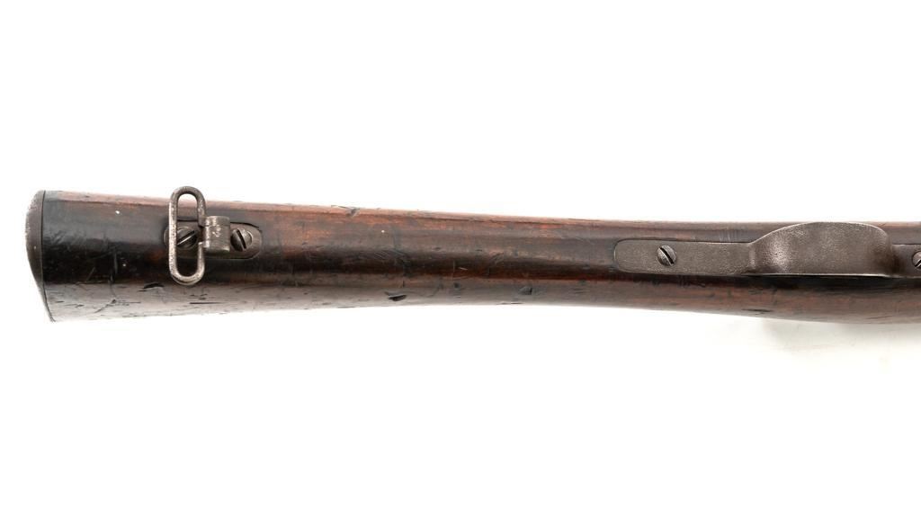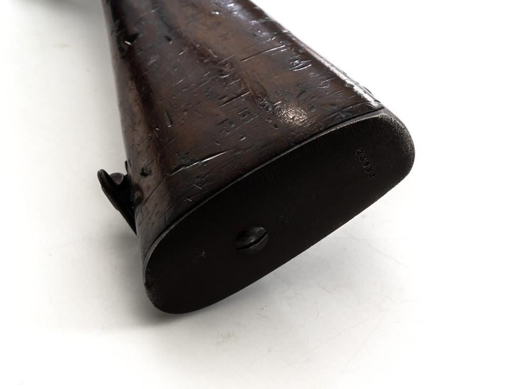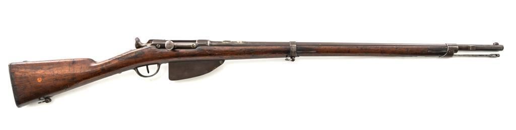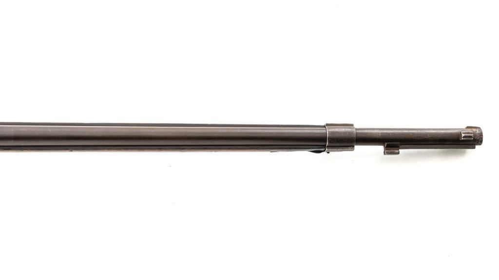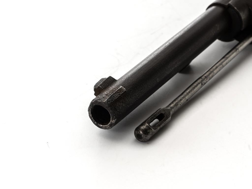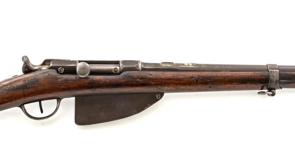French Model 1866 Chassepot Bolt Action Rifle with Magazine, #J23988, 11x59Rmm cal., 32.25" barrel, blued finish, hardwood stock, inverted-"V" front sight, rear sight has been removed and the surface has been filled with an unknown material. Includes a steel cleaning rod. A fixed steel magazine has been fitted to bottom of the receiver. Rifle is marked "MANUFACTURE IMPERIALE/St Etienne" and "MLE 1866" on left side of the receiver and "S 1869"on right side of the barrel shank. Numbers do not match. Condition overall is fair with the metal toned to brown. Bolt assembly has been cleaned and shows general fine pitting. Stock is cracked at the wrist, behind the receiver tang. Wood is otherwise good with scattered dents, scratches, and some darkening to the finish. Action functions but is a little stiff. Bore rates fair with rust at the muzzle. An interesting rifle worth further research. Est.: $400-$600. (Antique)