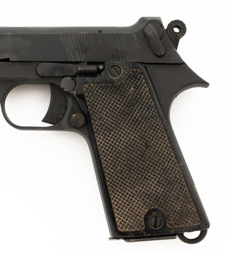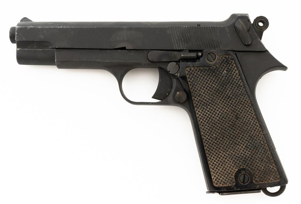 French Model 1935S Semi-Automatic Pistol, #8616, 7.65x20mm Longue cal., 4.29" barrel, parkerized finish, checkered black plastic grips, blade front sight, and fixed rear sight with "U"-notched groove. Includes one parkerized magazine, marked "1935-S" on the floorplate. Right side of the slide is marked "MODELE 1935S/CAL.7.65 L/MI". Left side is marked "M.A.C". Right side of the frame is marked "MAC-C 8616". No visible import marks. Condition overall is very good, retaining approx. 93%-95% blue, showing light edge wear and handling marks. Grips with scuffs, handling marks, and a few small chips to the bottom on both sides. Action operates smoothly, Bore is good, rifling shows wear but is still clearly visible. The bore rates good with about good rifling. Est:$300-$400. (C&R/PPT)